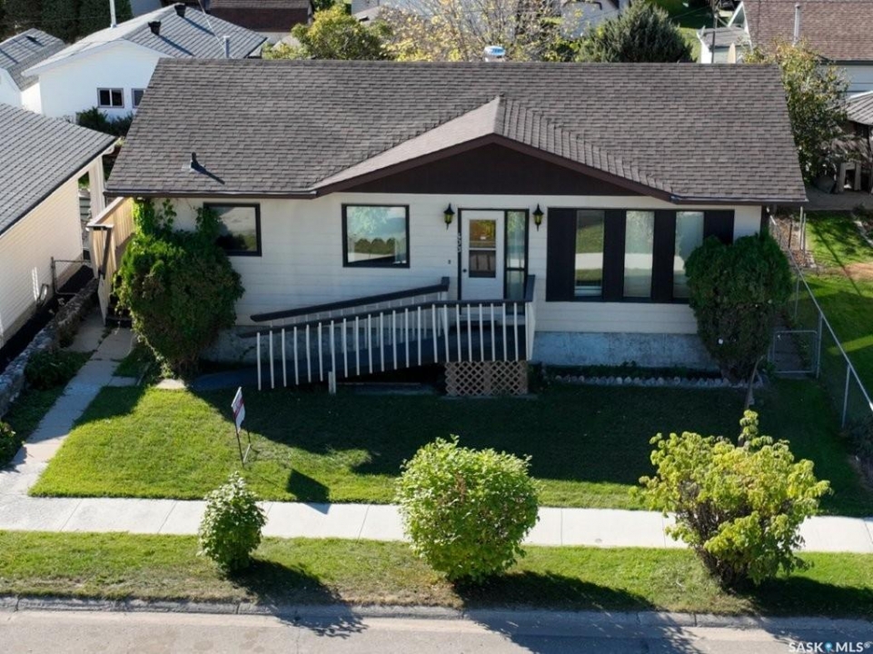 Welcome to 403 Churchill Street, Hudson Bay SK. This home was built in 1986, this 1,064 sq ft home with a full finished basement offers a practical layout and excellent location. The main level features 2 bedrooms, a 4-piece bath, and main floor laundry, while the basement provides 2 additional bedrooms(window sizes need to verified), a 3-piece bath, and a spacious recreation room. The bright and roomy living room flows into a well-appointed separate dining and kitchen with ample counter and cupboard space, plus plenty of storage throughout, including cold and dry storage areas downstairs. Appliances included: fridge, stove, washer, dryer, microwave, and central vacuum system.The home has natural gas heat and central air conditioning. A wheelchair ramp provides easy access. The property also comes with a detached oversized 20'x26' single garage concrete apron and both the house and garage had new shingles installed in 2019. Back yard space and garden space and is Conveniently located close to the grocery store, school (K–12), swimming pool, skating rink, and Home Hardware and more! Quick possession is possible!