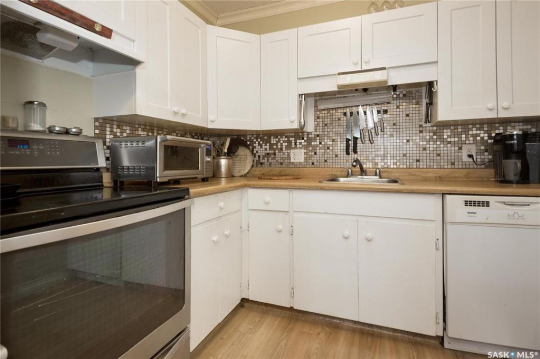 Cute and affordable 1 bedroom, 1 bath condo in Midtown. This attractive unit offers an open kitchen, dining and living room design and ground level walkout to a spacious concrete patio which is great for hauling in groceries or using as a separate entrance. Some notable upgrades include new crown moulding and upper cupboards. Large closets, lots of room for storage and in suite laundry. Newer stainless steel fridge and stove plus an extra fridge. Conveniently located close to cornerstone shopping centre amenities and the new University.