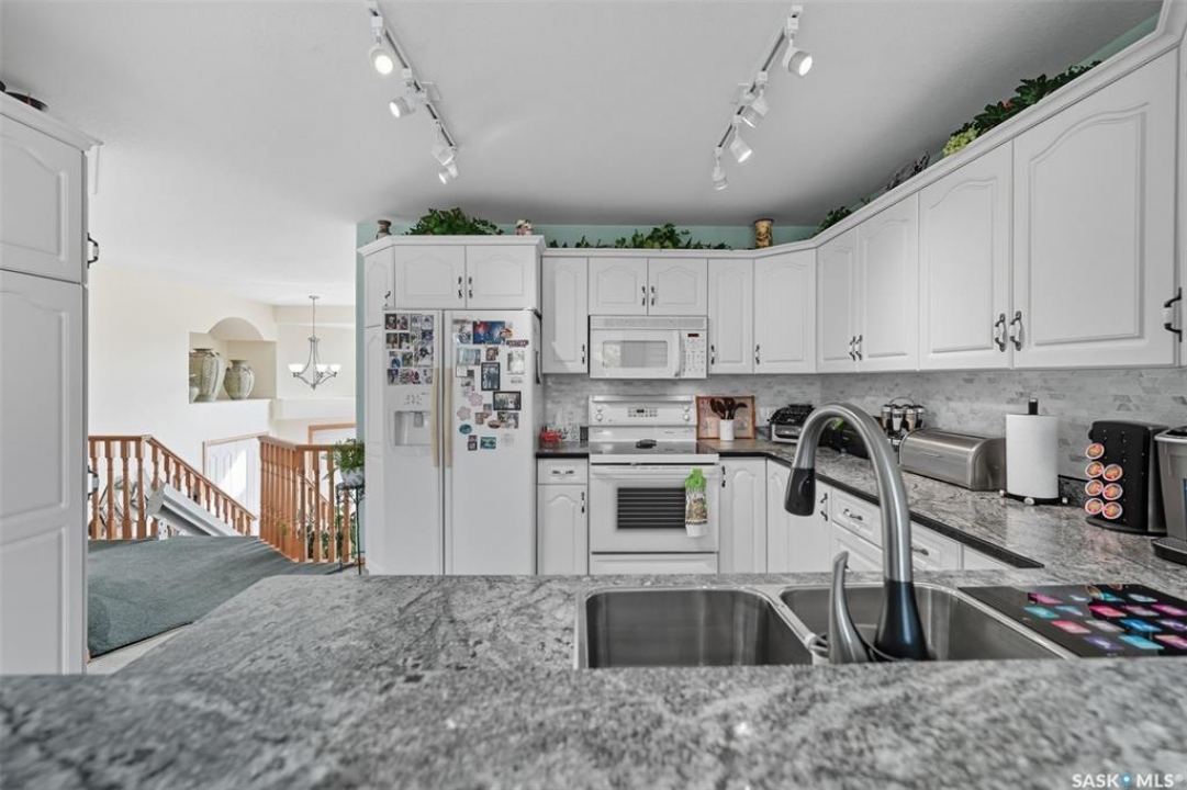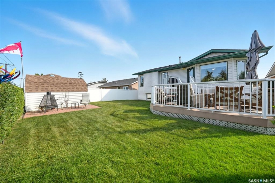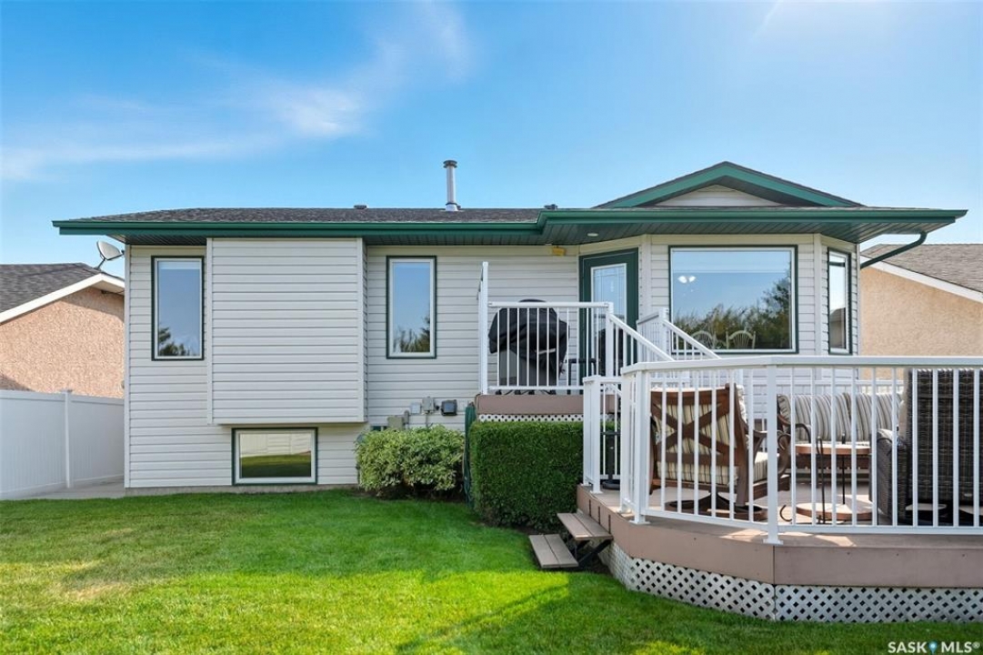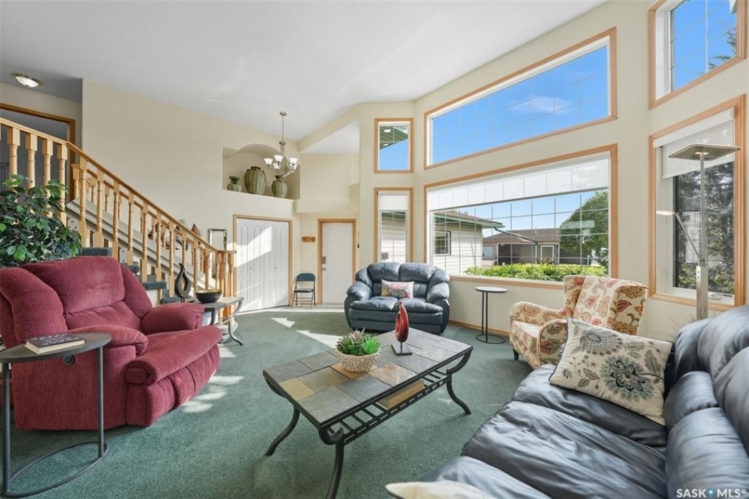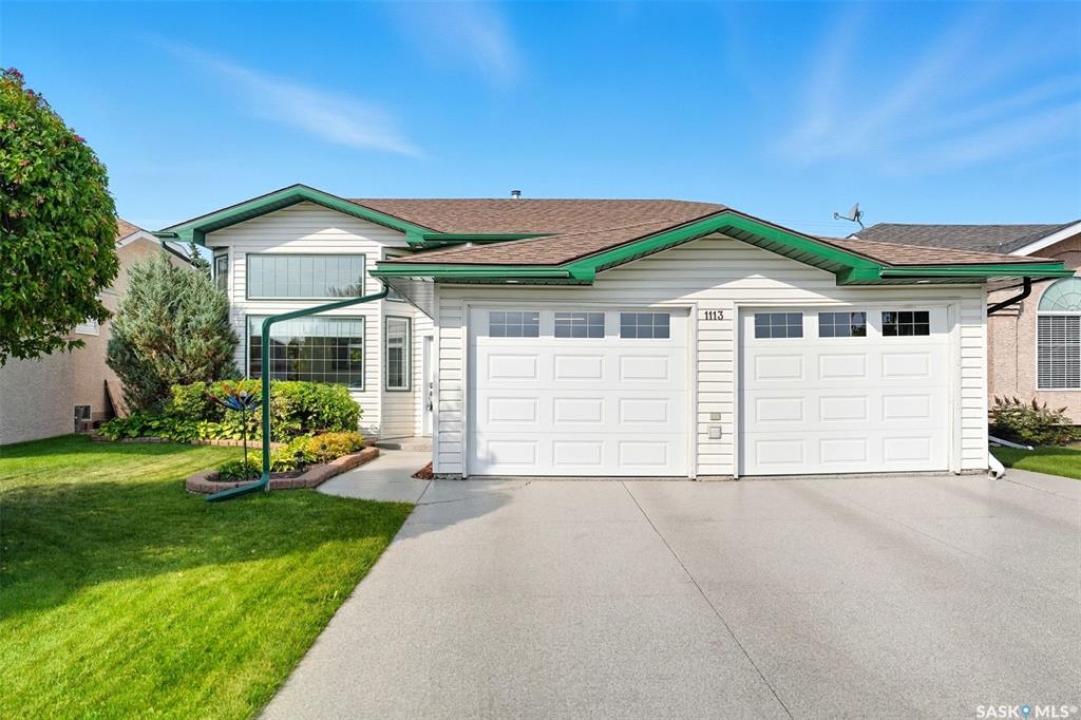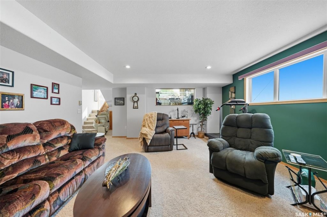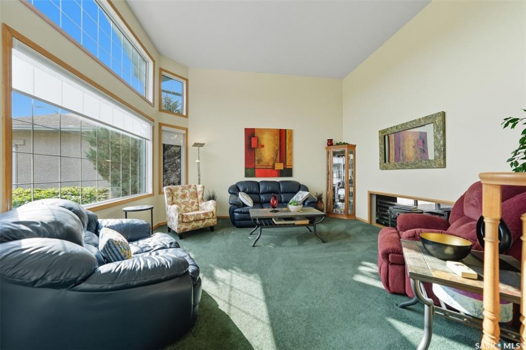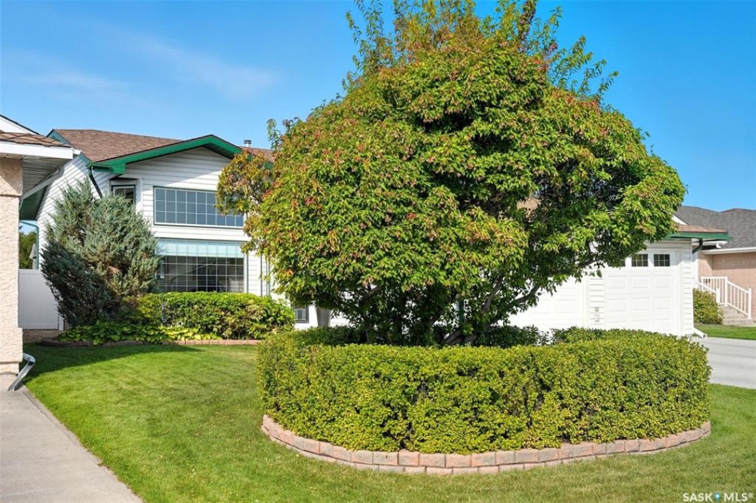 Welcome to this immaculate bi-level home, perfectly situated in a highly desirable neighborhood near the Uniplex, and a variety of amenities. Backing a peaceful tree line with open prairie views, this property offers a rare combination of privacy and convenience. Step into a bright and inviting main level, where soaring ceilings and floor-to-ceiling windows in the front foyer and living room create an impressive sense of space. Decorative niches and ledges add character and style as you move into the heart of the home. The well-designed kitchen features an abundance of white cabinetry, seamlessly connected to the dining area with access to a maintenance-free, two-tiered deck—perfect for entertaining or simply enjoying the outdoors. The main floor is complete with a luxurious primary bedroom with a 3-piece ensuite, an additional bedroom, and a 4-piece bathroom. The lower level continues to impress with a stunning decorative glass feature overlooking the main living room, a spacious family room with a cozy natural gas fireplace, two additional bedrooms (including one with a walk-in closet), and a 3-piece bath/laundry room with plenty of built-in cabinetry. Car enthusiasts and hobbyists will love the garage, outfitted with cabinets and Handiwall slatwall systems for exceptional organization. Outside, the beautifully landscaped yard showcases mature trees, shrubs, hedges, flower beds, fire pit area, storage shed, and a fully fenced design that backs onto green space. This property truly shines inside and out—showing 10/10 with pride of ownership throughout!