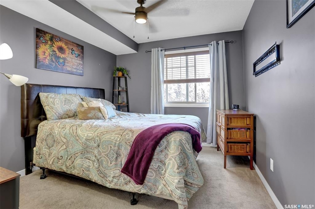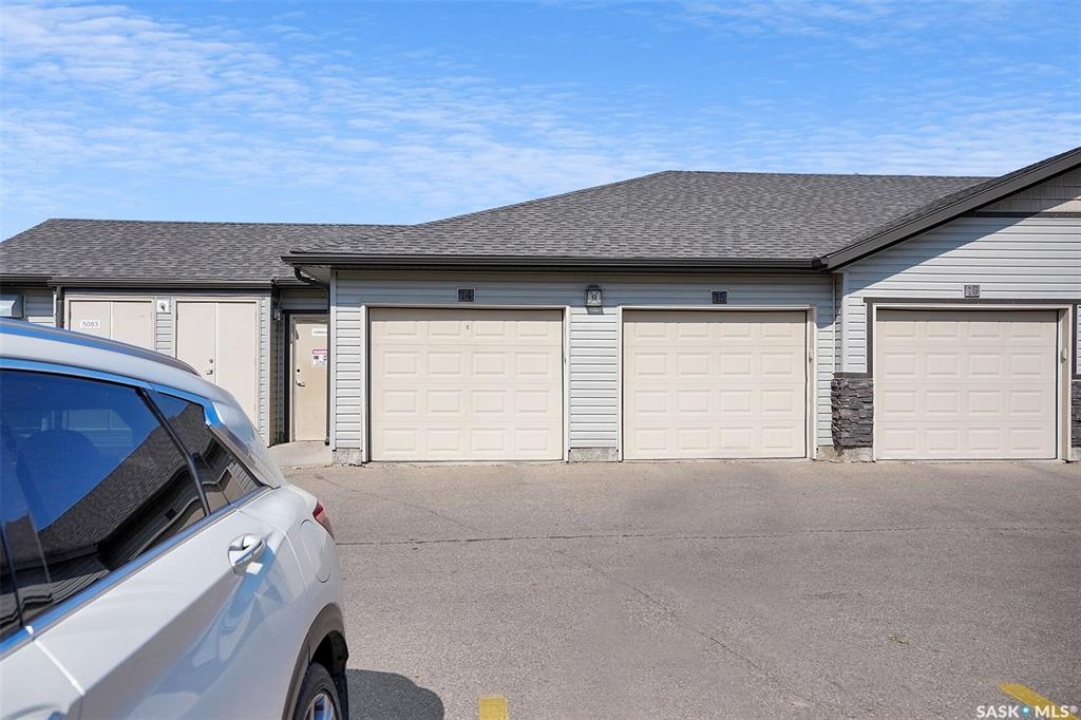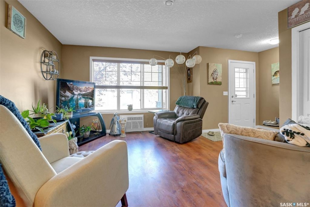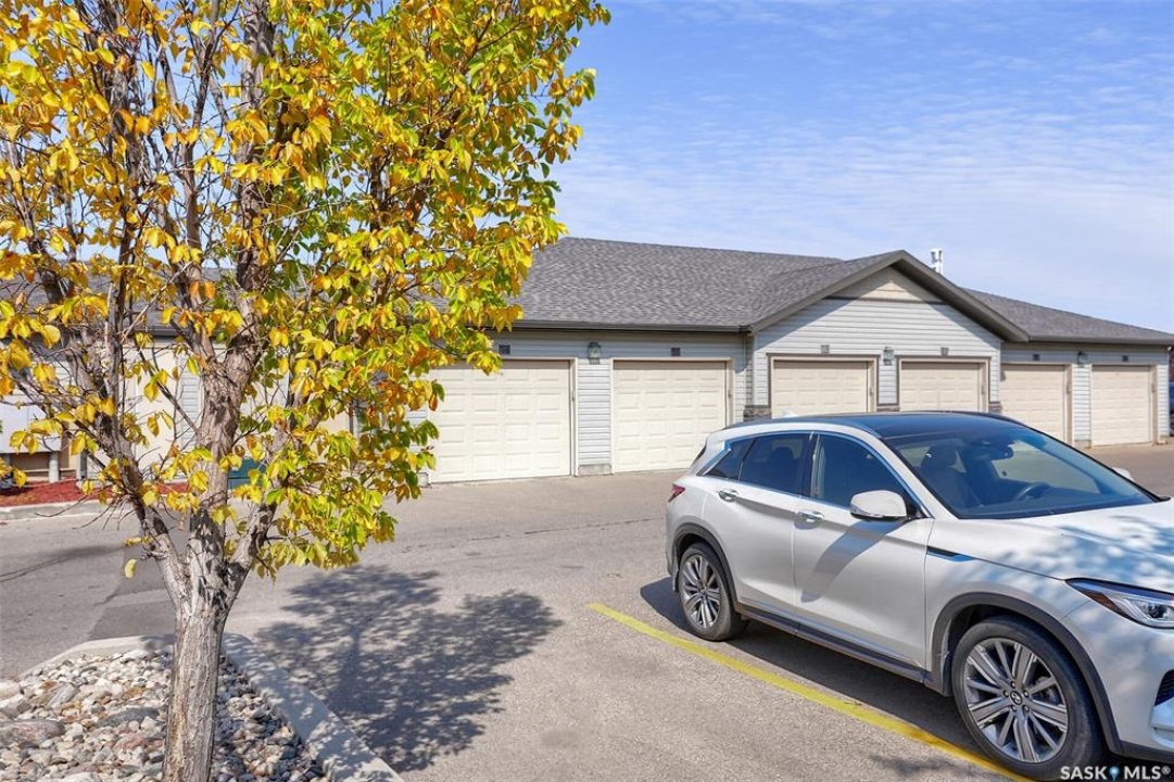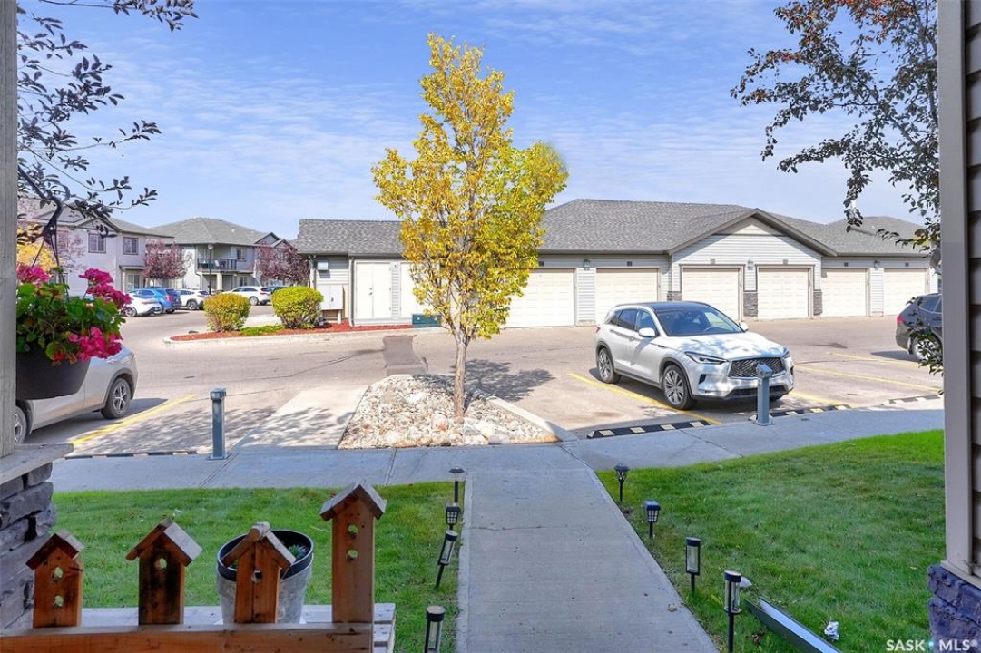 Welcome to this 904 sq ft two-storey condo located in Regina's sought-after Harbour Landing neighbourhood. This home offers both convenience and functionality with one electrified parking stall right in front of the unit, plus a single detached garage directly across for additional parking or storage. The main level features an open-concept layout with a bright living room highlighted by a large window for natural light, a dining area, and a well-appointed kitchen with a spacious pantry/storage area. Upstairs you'll find two generously sized bedrooms, a 4-piece bathroom, and convenient laundry tucked just off the bathroom. The primary bedroom includes a walk-in closet, while the bathroom is finished with built-in shelving for linens. This condo is a fantastic option for first-time buyers, young professionals, those looking to downsize or anyone seeking a low-maintenance lifestyle in a great location, close to all amenities.