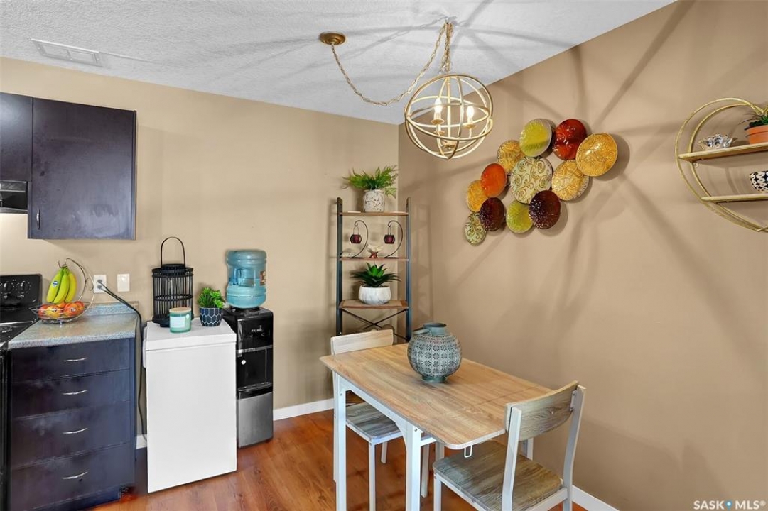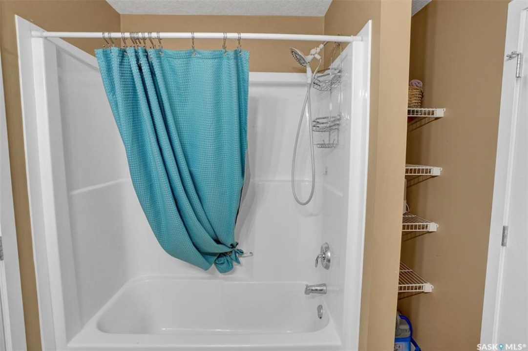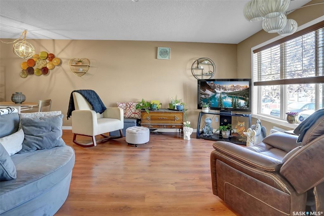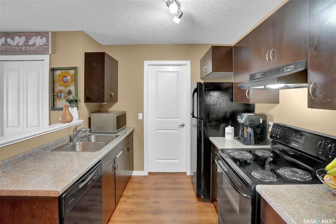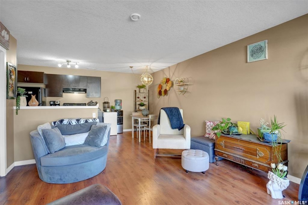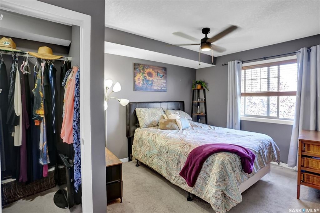 Welcome to this 904 sq ft two-storey condo located in Regina's sought-after Harbour Landing neighbourhood. This home offers both convenience and functionality with one electrified parking stall right in front of the unit, plus a single detached garage directly across for additional parking or storage. The main level features an open-concept layout with a bright living room highlighted by a large window for natural light, a dining area, and a well-appointed kitchen with a spacious pantry/storage area. Upstairs you'll find two generously sized bedrooms, a 4-piece bathroom, and convenient laundry tucked just off the bathroom. The primary bedroom includes a walk-in closet, while the bathroom is finished with built-in shelving for linens. This condo is a fantastic option for first-time buyers, young professionals, those looking to downsize or anyone seeking a low-maintenance lifestyle in a great location, close to all amenities.