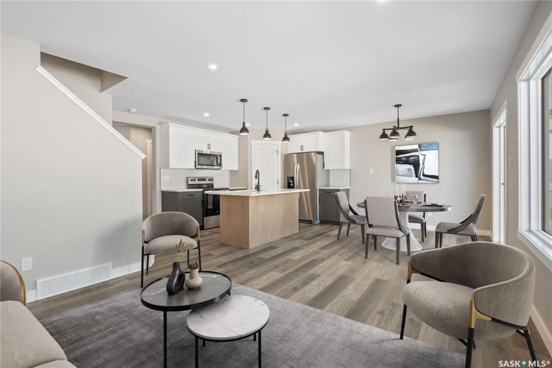 The Lawrence Triplex in Loft Living brings bold, industrial-inspired style into 1,515 sq. ft. of well-planned living space, designed for the way families live today. Please note: This home is currently under construction, and the images provided are for illustrative purposes only. Artist renderings are conceptual and may be modified without prior notice. We cannot guarantee that the facilities or features depicted in the show home or marketing materials will be ultimately built, or if constructed, that they will match exactly in terms of type, size, or specification. Dimensions are approximations and final dimensions are likely to change. Windows, exterior details, and elevations shown may also be subject to change. The main floor is all about flow, with a kitchen featuring quartz countertops and a walk-through pantry, connecting directly to the dining and living areas. Upstairs, 3 bedrooms include a primary suite with a walk-in closet and ensuite. The bonus space can become a home office, library, or creative corner, and second-floor laundry makes daily life even easier.