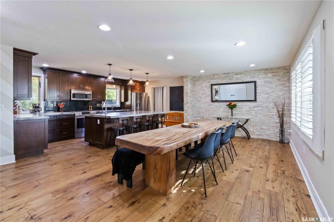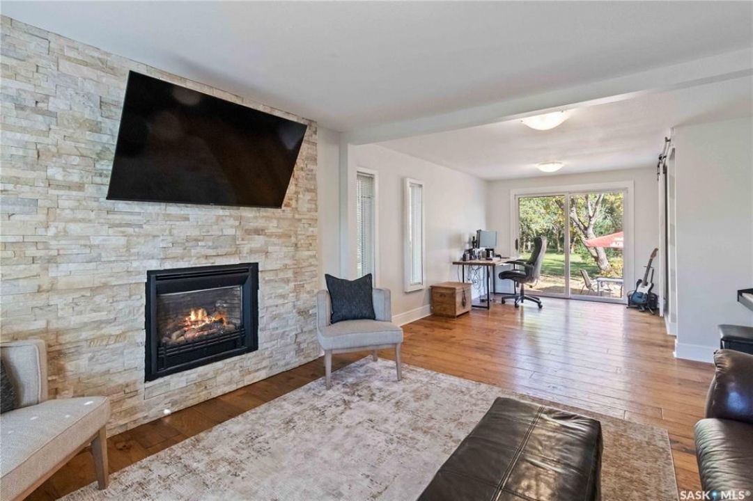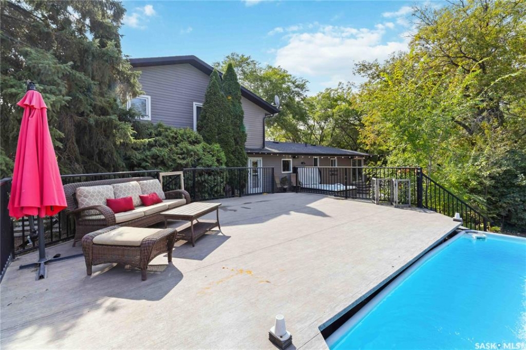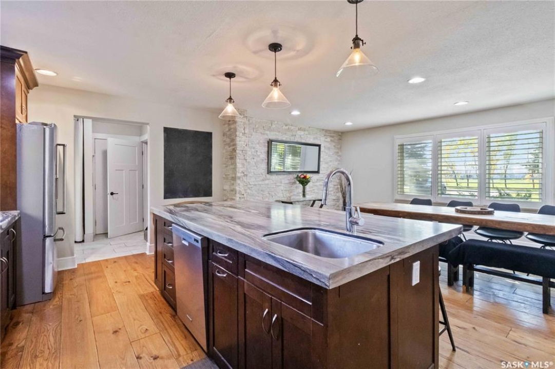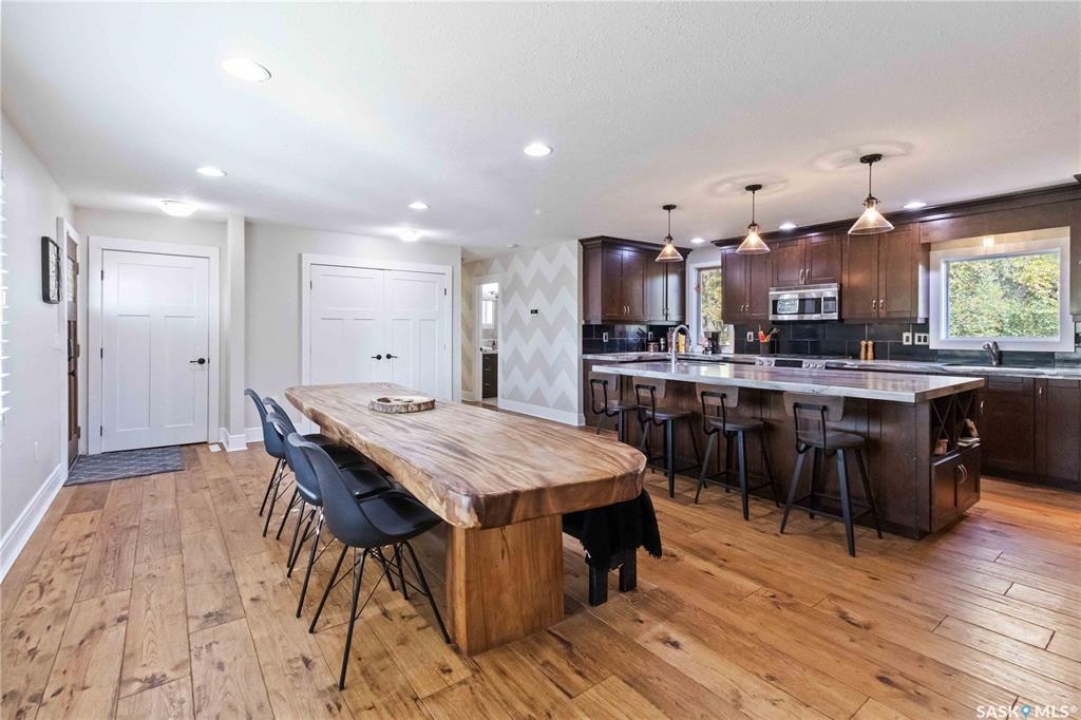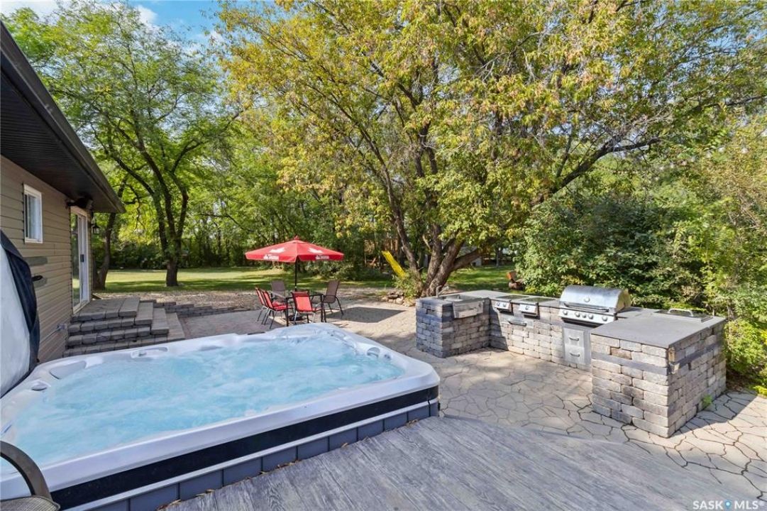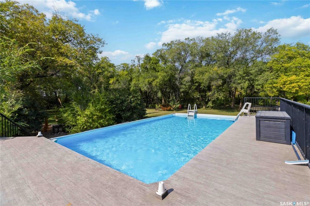 Incredible Renovated Acreage – under 15 Minutes to Saskatoon. Experience the perfect mix of country living and modern convenience on this beautifully maintained, nearly 40-acre property located just minutes from the city. The home site is loaded with features. The renovated home boasts a spacious kitchen and dining area, beautiful hardwood floors, and a private living room. You'll find 3 large bedrooms, a spa-style bathroom with heated floors, and a newly finished basement complete with a second bathroom, office, den, and ample storage. Step outside into a backyard oasis perfect for all ages and seasons which includes an expansive deck, outdoor kitchen, 17x30 pool and hot tub. The yard site also includes a fire pit, private ice rink for winter fun, children's play set, large garden, and a chicken coop. There are also two secluded dugouts ideal for relaxing or nature watching. Whether you're entertaining, gardening, relaxing by the water, or enjoying family fun year-round, this property has it all.