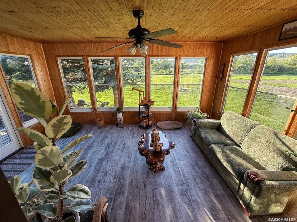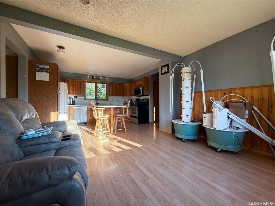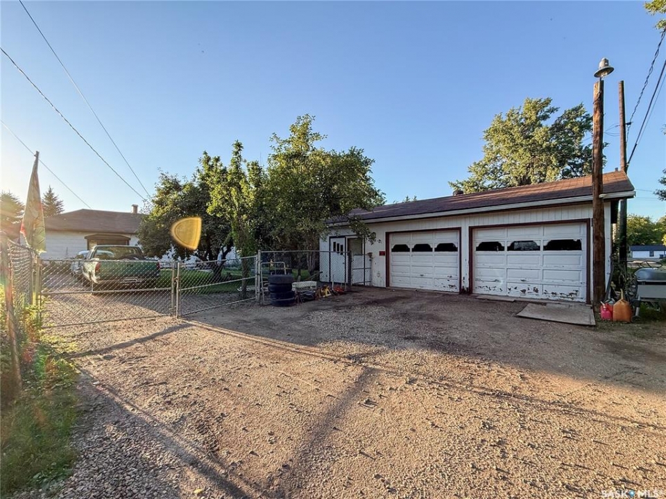 Welcome to 223 Riverside Boulevard — a rare gem tucked into one of Eastend's most picturesque settings. With wide-open green space across the street and the gently flowing creek just beyond, this home offers uninterrupted views of the Riverside Golf Course and even a peek of the T.rex Discovery Centre off in the distance. It's the kind of property where morning coffee comes with deer sightings and evening sunsets glow golden over the valley. With 1,203 sqft of living space and sitting on a massive 17,325 sqft lot, this property offers both beauty and functionality in a truly unbeatable location. Entering from the back, you're greeted by a practical mudroom that leads straight ahead to the main floor laundry area or left into the heart of the home. The oak kitchen features a large eat-up island, perfect for casual meals or entertaining, while the adjacent dining area/living room are bright and welcoming thanks to the large bay window that frames those stunning front-facing views. Off this space, you'll find the 1st main floor bedroom, a 4-piece bathroom and access to the partially developed basement.. The primary bedroom is tucked away off the secondary living room and features its own 3-piece ensuite. From the living room you have direct access to the show-stopping sunroom — finished in rich wood accents and flooded with natural light. Whether you're unwinding with a book or hosting friends, this space offers space for enjoyment and leads out to the deck and backyard oasis. A small feature pond, established landscaping and ample entertaining space make the outdoors just as inviting as the inside. The lot offers multiple parking options, including a gravel front drive, asphalt rear pad, parking beside the shed and a 32x26 double detached garage with lane access — partially insulated and ready for projects or storage. Whether you're looking to settle in the valley full-time or dreaming of a peaceful getaway, this prime Eastend location gives you the best of it all.
