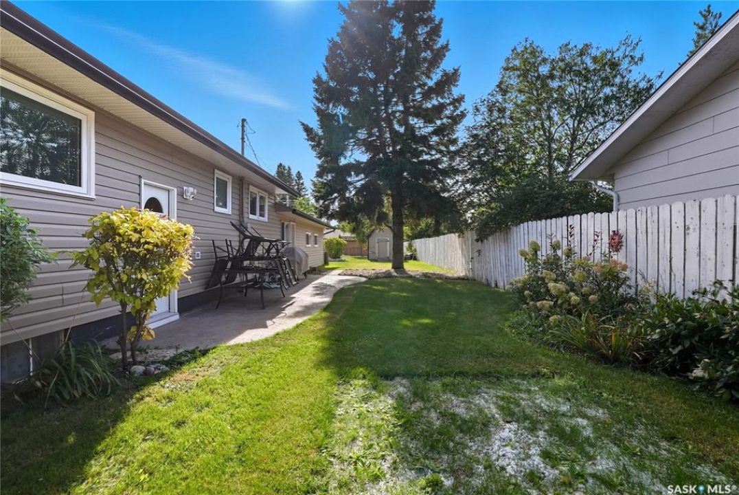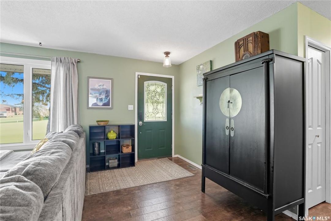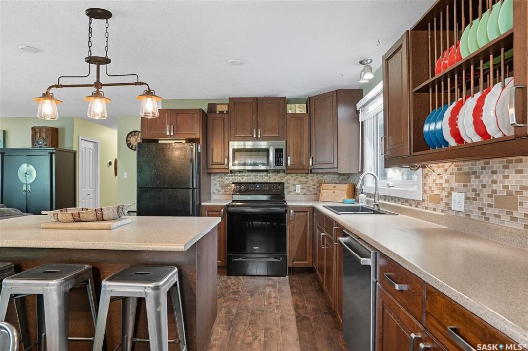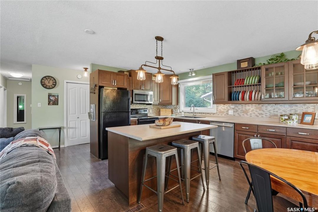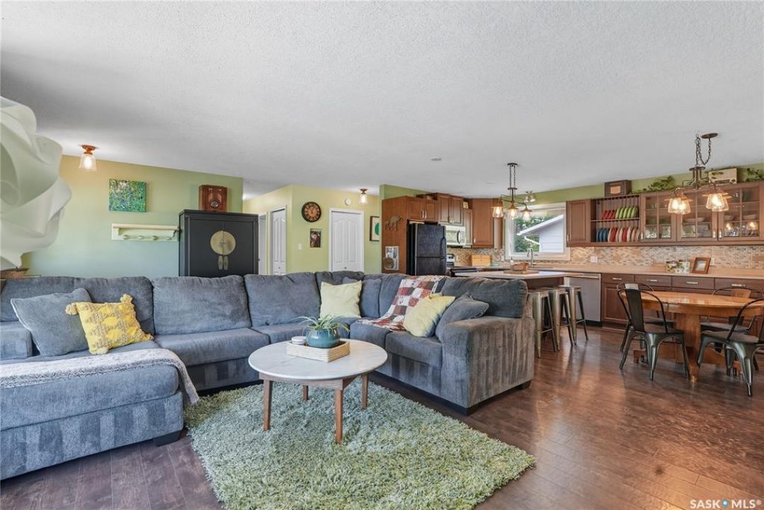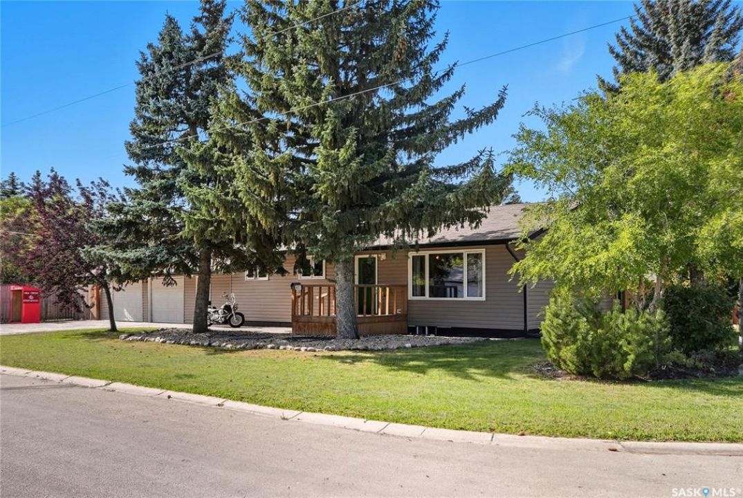 Welcome to small town living just minutes from Saskatoon & Martensville. This spacious bungalow is located on a sprawling corner lot, across the street from a park and around the corner from the edge of town. An open yet cozy floor plan greet you as you enter the home. The upgraded kitchen cabinets provide ample storage and plenty of counter space for the cooking & baking enthusiasts. Three bedrooms on the main floor includes a primary bedroom with an attached two piece ensuite and a seperate 4 piece bathroom to ound out the main floor. The updated basement includes a three piece bathroom, spacious family room perfect for movie nights and a nook that can accomodate a large desk for work from home space and large den that was being used as a bedroom. Outside, you will find a double garage attached by enclosed breezeway. This home features updated shingles, windows and siding as well. All of this sitting on a massive fully landscaped and fenced corner lot with mature trees and garden area. This home is oerfect for those looking for a bit more space, small town living but still close enough to the city of Saskatoon. Don't miss your chance to view this home, call your Realtor � today for a private showing!