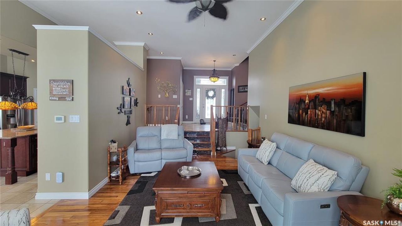 Executive style 1613 sq. ft. 4 level split home built in 2009; sellers are original owners and tons of pride showing in this one; 2 bedrooms and 2 baths on upper level, 1 bedroom on 1st lower level; spacious primary bedroom features a walk-in closet plus 3 pce ensuite with a beautiful tiled walk-in shower; main bath features a corner jetted soaker air tub; Kitchen and dining has 12' ceilings, tons of cherry finish maple cabinets, quartz counter tops, expansive island with built-in dishwasher, walk in pantry and limestone tile flooring, built in oven & microwave stainless steel combo, 36" ceramic stove top; reverse osmosis; main floor laundry/mudroom; living room features a vaulted ceiling, stunning acacia hardwood floors & natural gas fireplace; your first lower level hosts family room with a natural gas fireplace, 3rd bedroom & 3pc bath; very bottom or 4th level is unfinished but can be a future bedroom if so needed; 14' ceilings in finished double attached garage with in-floor heat, basement has plumbing installed for in floor heat too; 35 year asphalt shingles; hardy plank siding; ICF block basement; underground sprinklers; 12x18 garden shed; triple paned Argon windows; air to air ex-changer; water softener; sump pump; central air conditioning (2018); new humidifier installed in fall of 2023; so many more features; price out cost to build new and you will see the value in this one!
