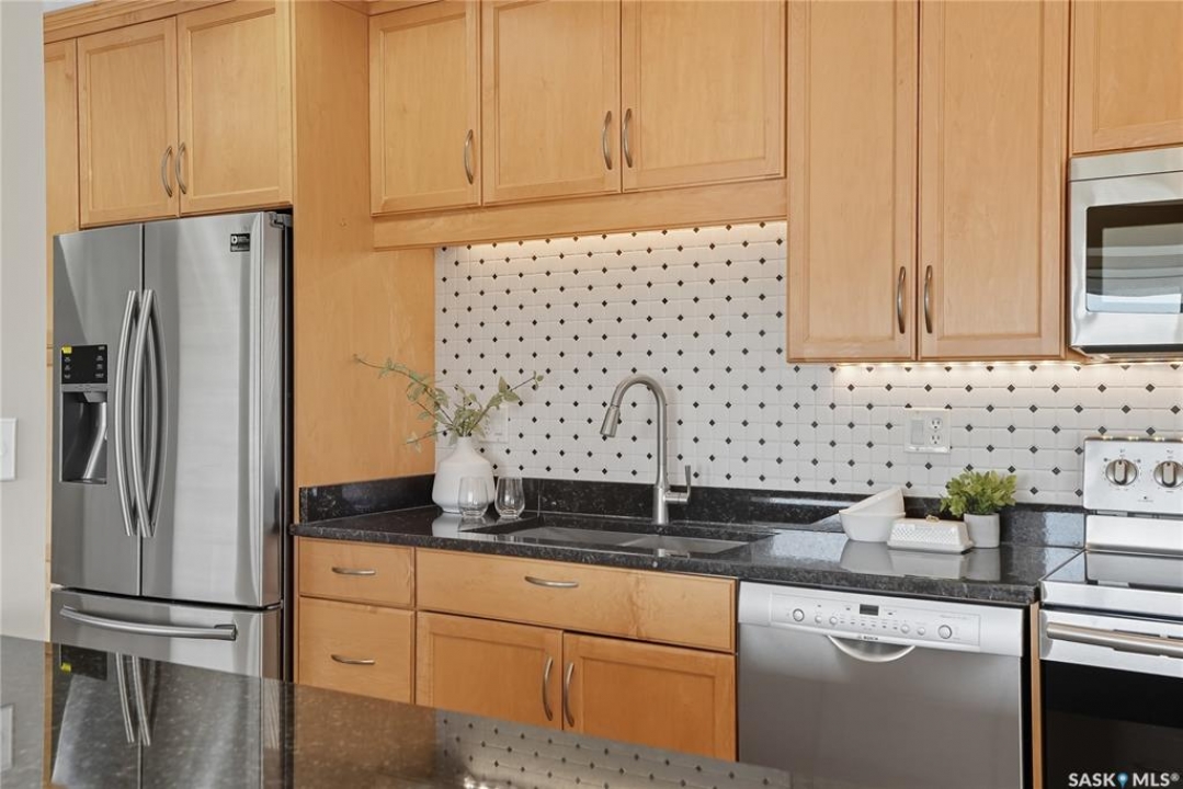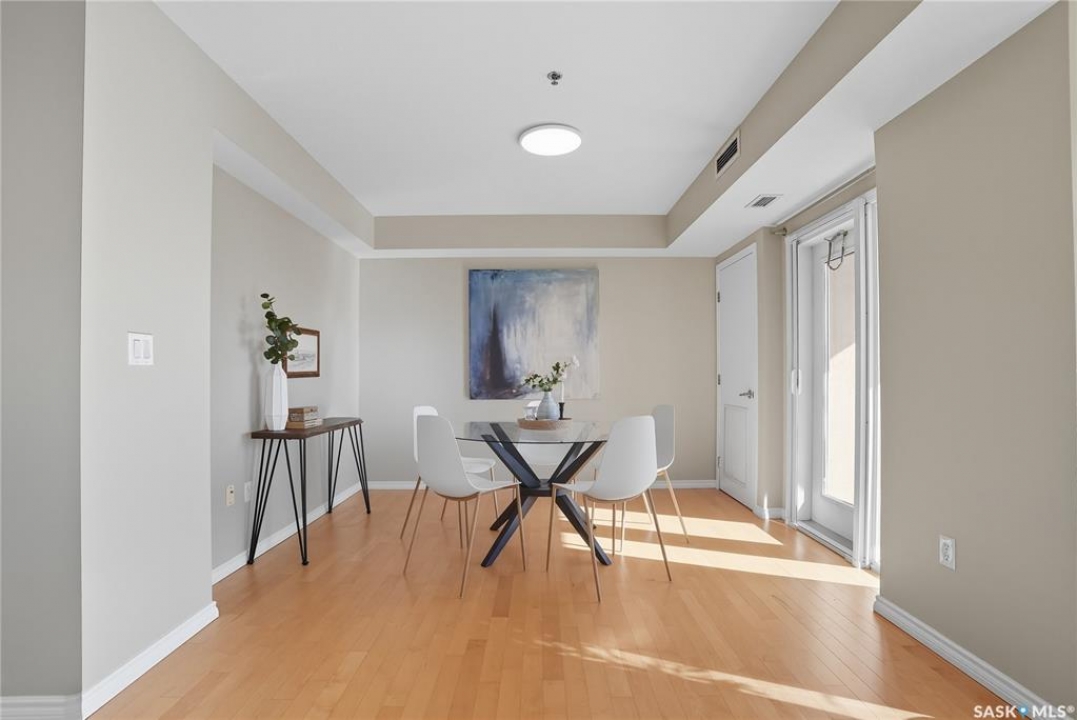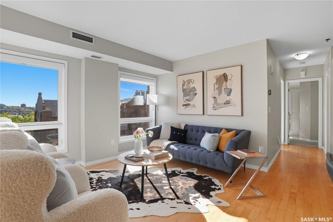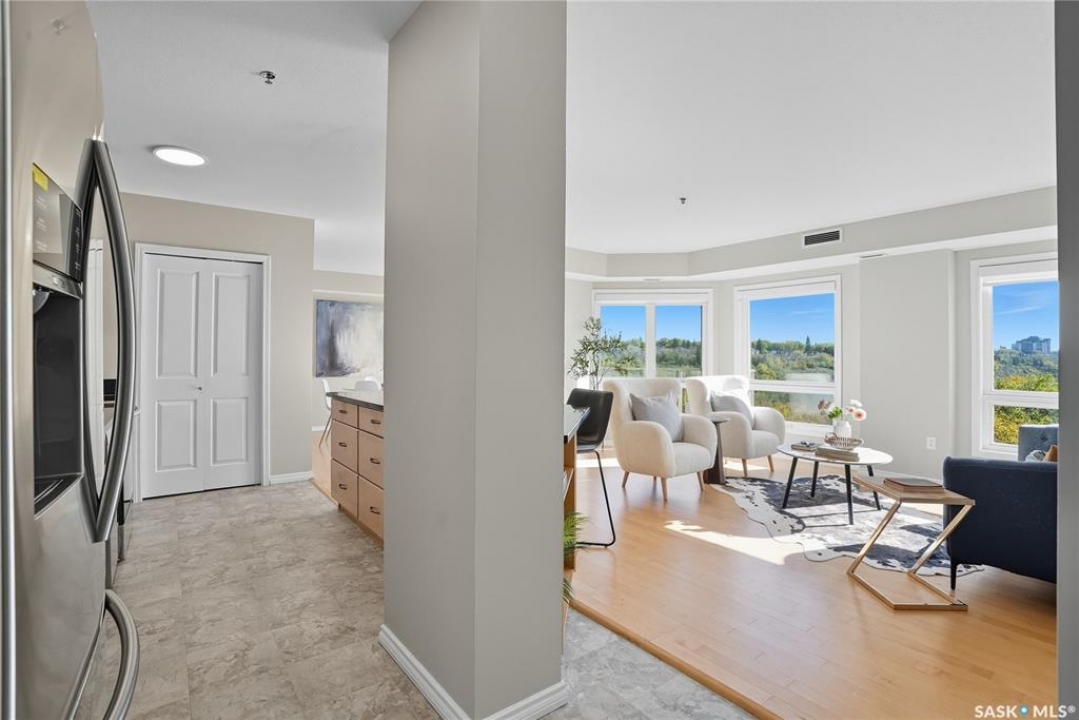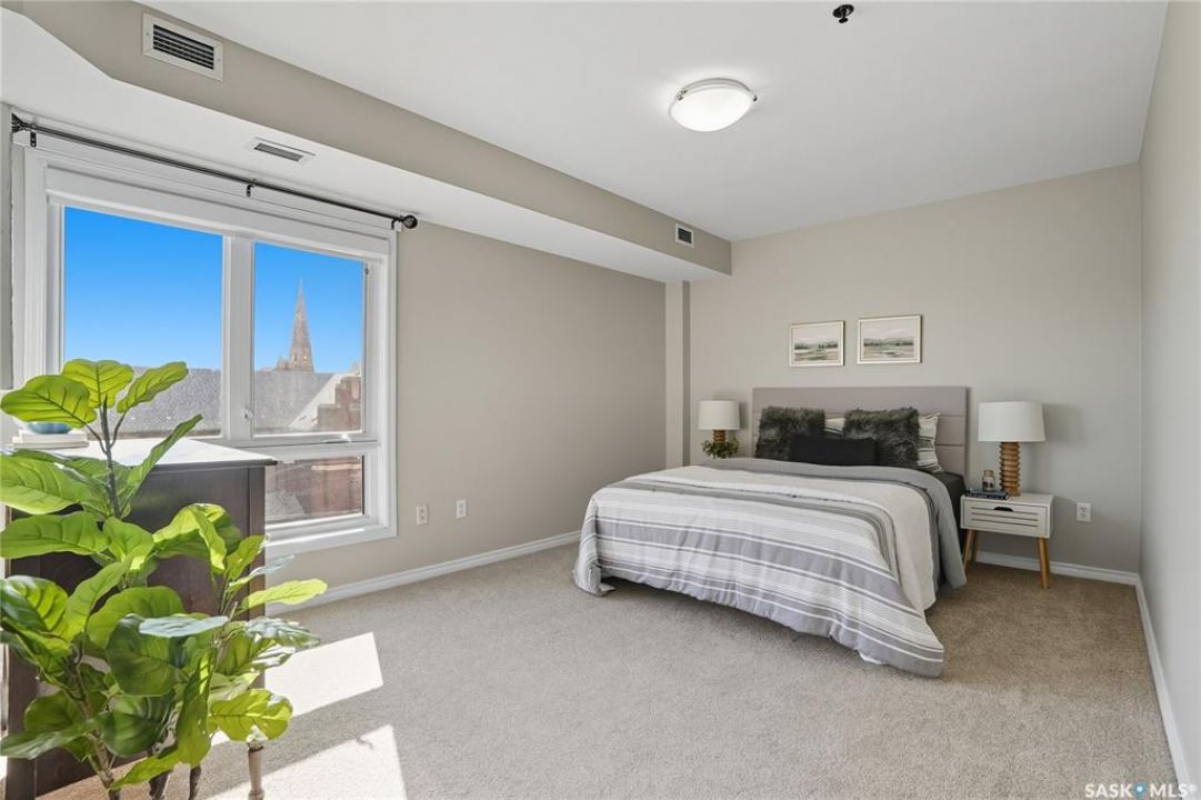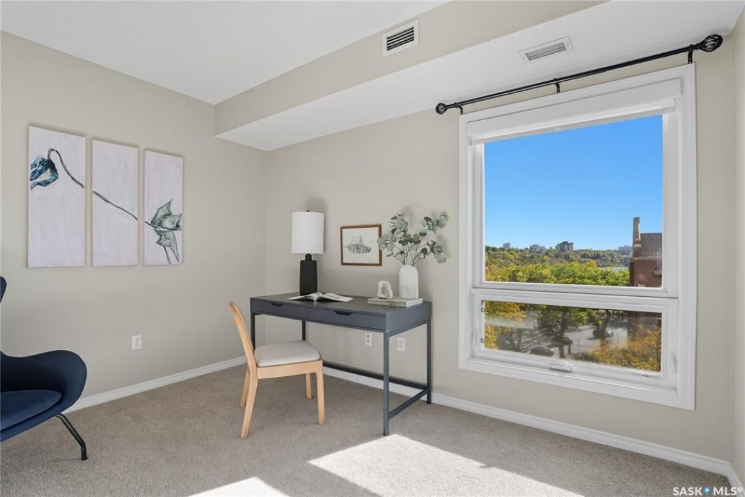 This beautifully maintained downtown condo offers one of the most desirable views in the building, overlooking the scenic river from its south-facing position. Perfectly situated to avoid harsh winds, it sits high enough to offer a stunning perspective above the treetops while remaining closely connected to the vibrant riverbank atmosphere. From your oversized balcony, enjoy a front-row seat to community events like runs, walk-a-thons, and fireworks, and soak in the sounds of live music during the Jazz Festival. Just under 1,200 square feet, the layout includes two spacious bedrooms and two full bathrooms. The bright, open-concept living space is ideal for both everyday comfort and entertaining, anchored by a large kitchen that features granite countertops, a tiled backsplash, and a massive island with additional seating. The adjoining dining area is bright and airy, while the expansive living room benefits from abundant natural light pouring in through the many windows. The generous primary bedroom includes a walk-in closet and a four-piece ensuite, while a second bedroom and additional four-piece bathroom provide ample space for guests or family. The laundry room adds convenience and the independent heating and central air personalized comfort year-round. Step outside your front door and onto the Meewasin River Trail, with direct access to walking and biking paths. Within walking distance of the University of Saskatchewan, Royal University Hospital, City Hospital, and Jim Pattison Children's Hospital. Living downtown means you're surrounded by some of the city's best restaurants, shops, entertainment, and cultural venues—all just steps away. One heated underground parking stall and a heated storage locker are included. Residents also enjoy access to a large amenities room complete with a kitchenette, pool table, lounge area, and a deck with BBQ. Exercise room is included in the condo fees, and for visiting friends or family, guest suites are available to rent.