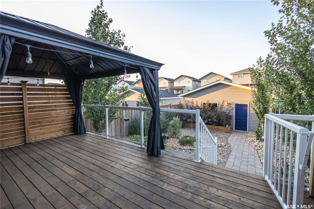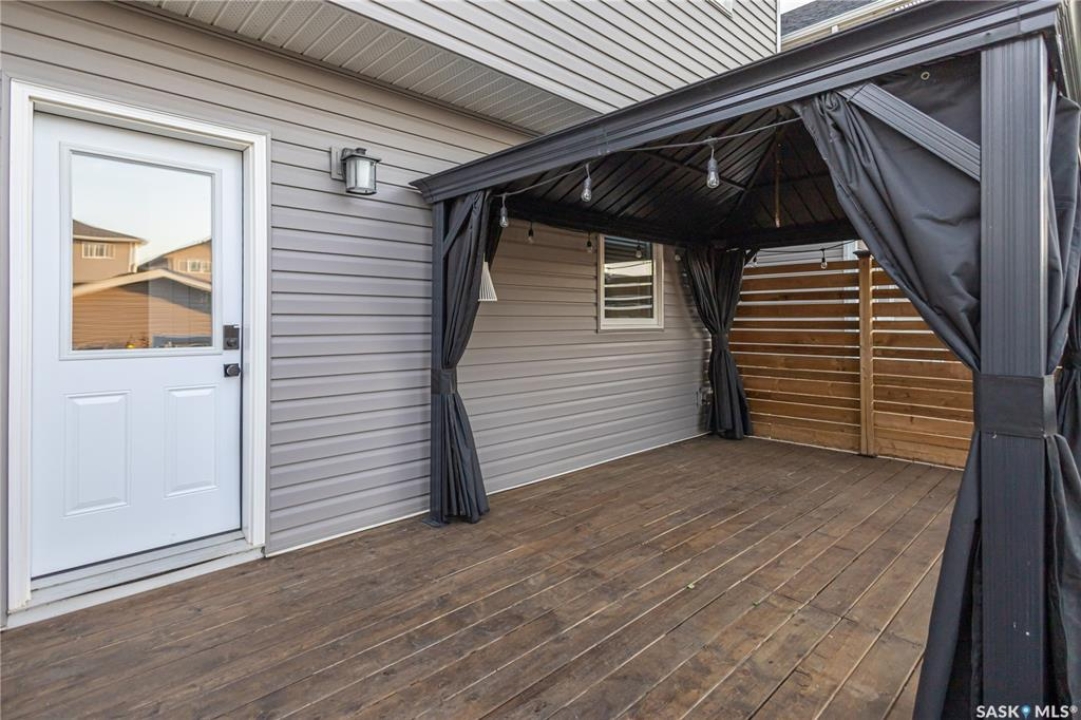 Welcome to 1445 Besnard Drive built by Edison Homes in Martensville. This beautiful home an open concept main living area with laminate flooring, large kitchen with an abundance of counter space, pantry, large island and tile backsplash, complimented with quartz countertops throughout. The back entry has a mud room area and 2 piece bath. The dining room is an alcove style dining; and large walk in closet at the front door. The second level features a large primary bedroom with 4pc ensuite and a large walk in closet. Two additional bedrooms, a 4 piece bath and full laundry room completes the upper level. There is direct entry to the basement which has been developed as a "mother in law" suite with a kitchen, living room, laundry, bedroom and 4pc bathroom. This home has great street appeal featuring a craftsman style exterior with extensive stone accents and oversized front pillars, concrete front sidewalk with sod, a xeriscape back yard with large deck (gazebo & shed included), a double detached garage which is partially insulated and is wired and ready for heat & a 220 amp. This home is located within a short distance to the new elementary school. All appliances & window coverings included. Immediate possession preferred. Buyer/Buyer's agent to verify measurements. Call to book your viewing today.