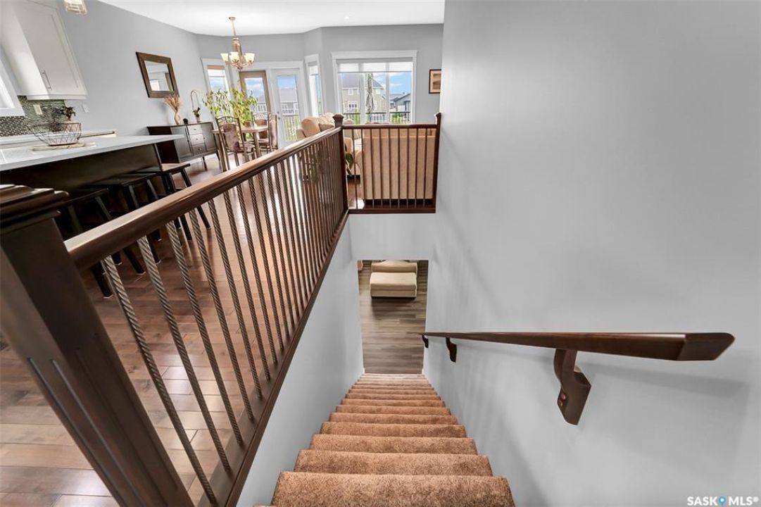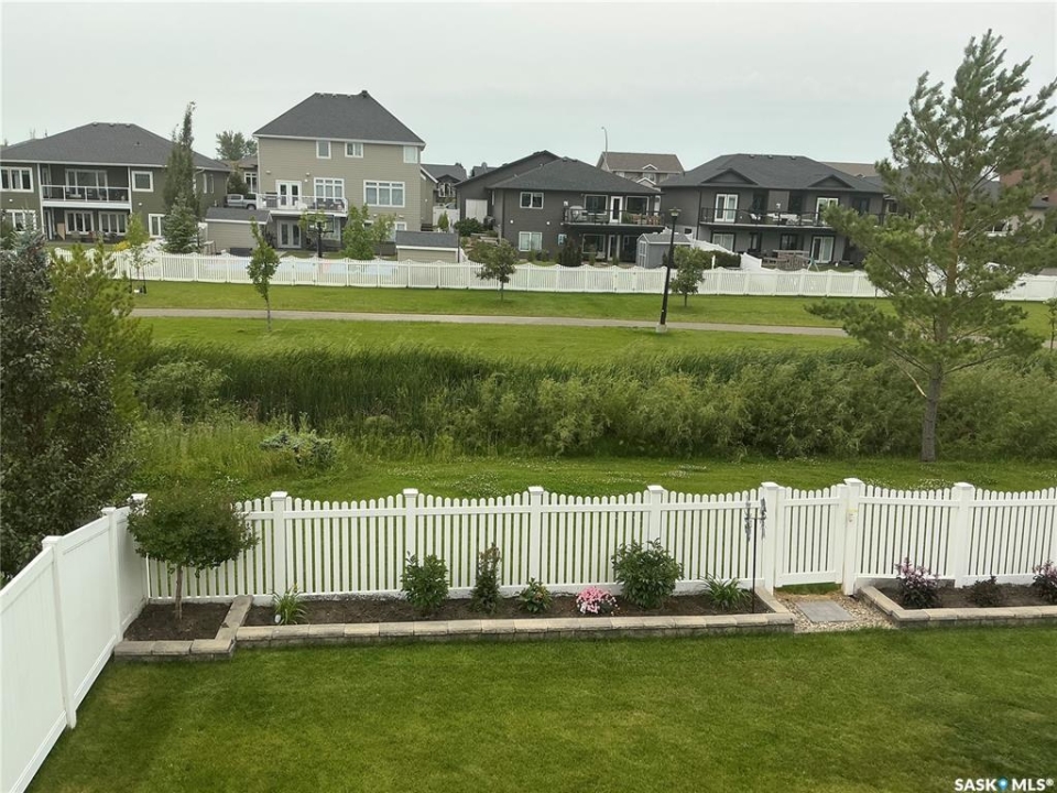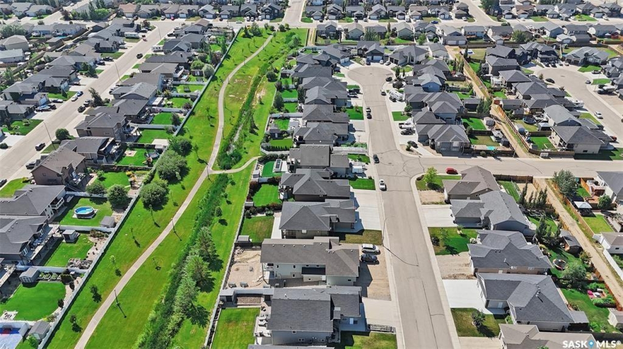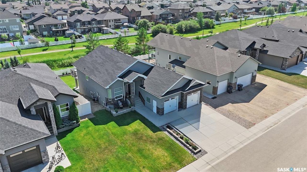Welcome to this stunning walkout bungalow backing onto the park in Warman, where over $60,000 in recent upgrades have elevated this home into something truly special. From the moment you step inside, you'll be impressed by the spacious layout, elegant finishes, and natural light throughout. The main floor features a grand front entrance, a high-end kitchen with an oversized island, and a warm, inviting living room with a gas fireplace. The large primary bedroom includes a luxurious five-piece ensuite, while a second bedroom, dedicated office space, main floor laundry, and a breathtaking deck overlooking the park complete the level. The walkout basement offers a spacious family room, games area with a bar, two generous bedrooms, and a full bathroom. The beautifully landscaped backyard includes a lower patio, stonework, and two storage sheds. A heated double garage with 10-foot ceilings adds practicality to the home's charm. Upgrades include luxury vinyl plank flooring in the basement, new upgraded carpet on the main floor, solar-block tinted windows in the main floor living room,right side patio door as well as the basement family room right side, a custom front door, refreshed master bath with new taps and paint, front and lower decks, brick flowerbeds, and custom blinds in the basement. With its thoughtful design, serene park views, and turn-key updates, this home is the perfect blend of comfort and elegance ready for you to enjoy. This beautiful home is close to the schools, Warman community centre, and all other amenities.