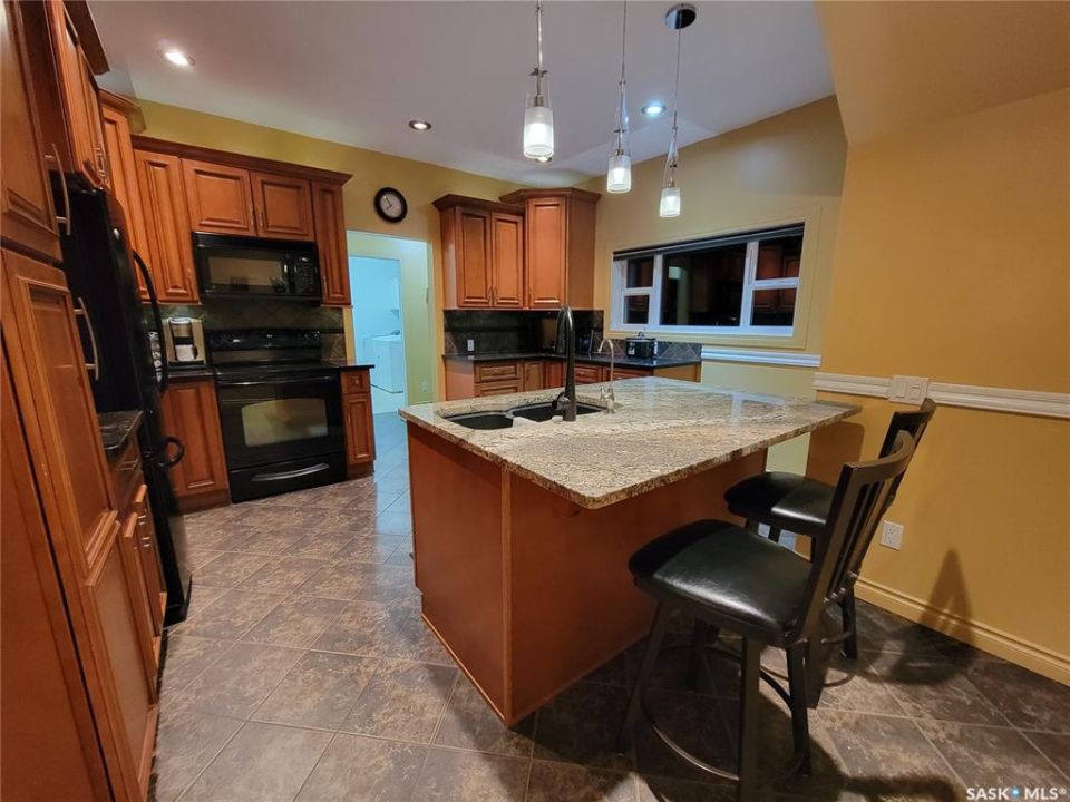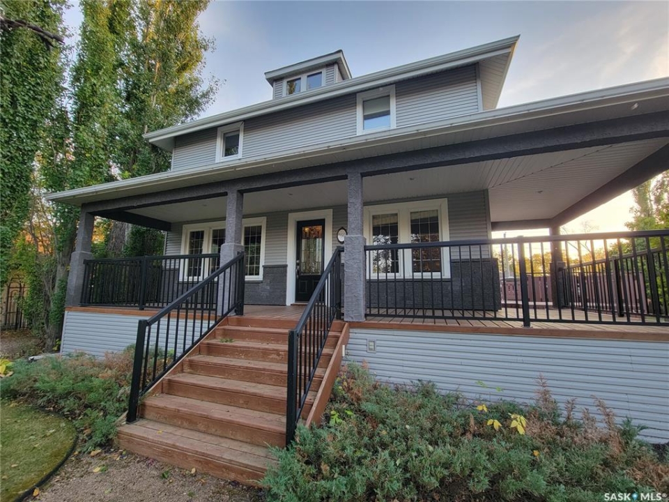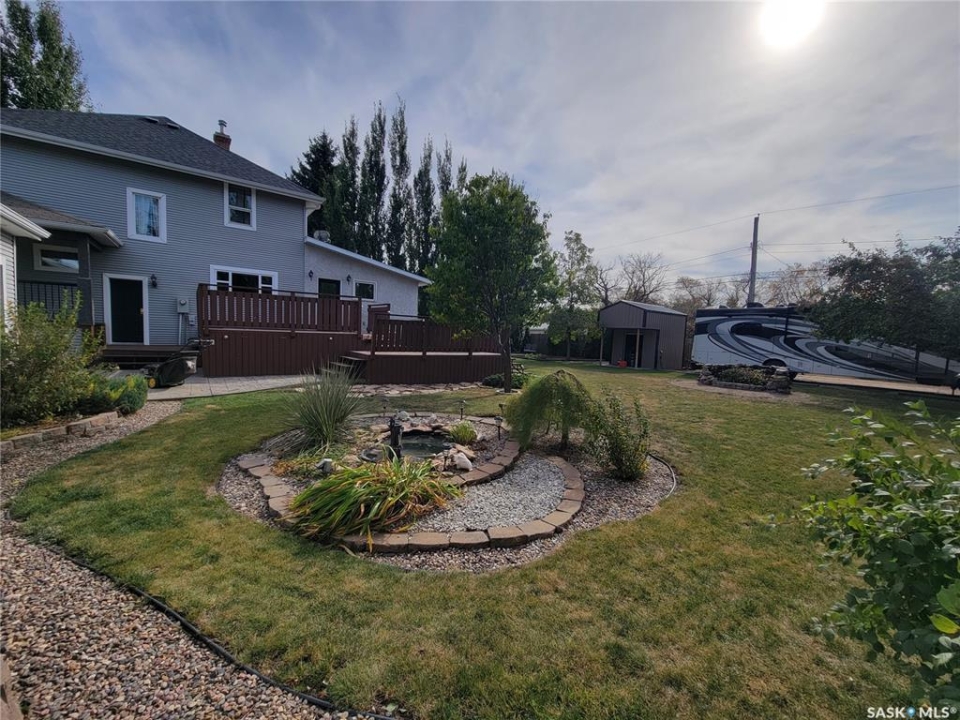 This home blends timeless architectural charm with modern comfort. Originally the Oatway homestead, it was moved into Unity and placed on a new foundation in 2002, carefully revitalized to preserve its heritage. Set on a double lot, you'll enjoy both community living and a country feel. Outdoors is a gardener's paradise with mature trees, perennials, rock beds, garden plot, pond, firepit, and stamped concrete ground-level patio and walkways. A heated triple garage, triple-car asphalt driveway, RV parking, and garden shed add function and appeal. The wrap-around veranda with pot lighting leads to a spacious two-tiered deck. Inside, the home showcases rich wood tones throughout, starting with the beautifully appointed Chef's Kitchen featuring plenty of cabinetry, granite countertops, island with prep sink, black appliance package, and accent lighting. The dining area with wood stove flows into a warm living room with hardwood floors, bay window, and cozy window seat. Main floor includes a 4-piece bath with double sinks, laundry room, and den. Upstairs offers three bedrooms and a 4-piece bath, including the generous primary suite with walk-in closet and private 2-piece bath. The basement, built in 2002 with 9-ft ceilings, provides a family room with gas fireplace and wet bar, bonus space, fourth bedroom, 3-piece bath, and utility room. Additional features: underground sprinklers, central air, central vac, water softener, natural gas heating, 100-amp panel, and RV outlet. A rare blend of history, architectural elegance, and modern function—ready to call yours. Book your showing today! Pleasw note: awaiting 2025 property tax amount and it will be updated within a few days.