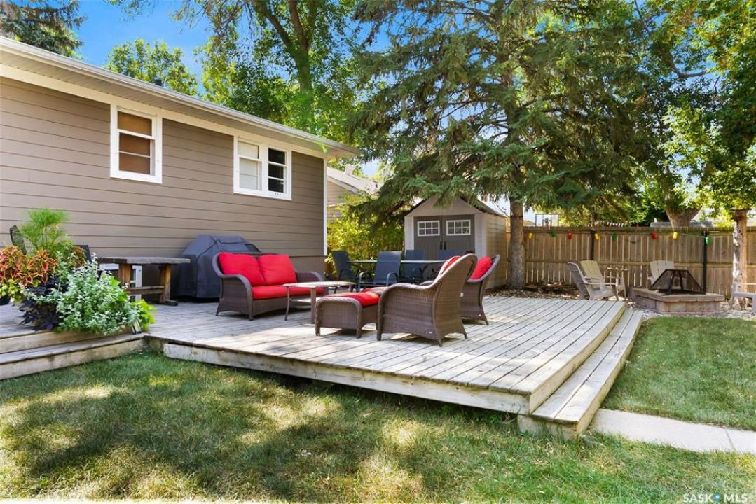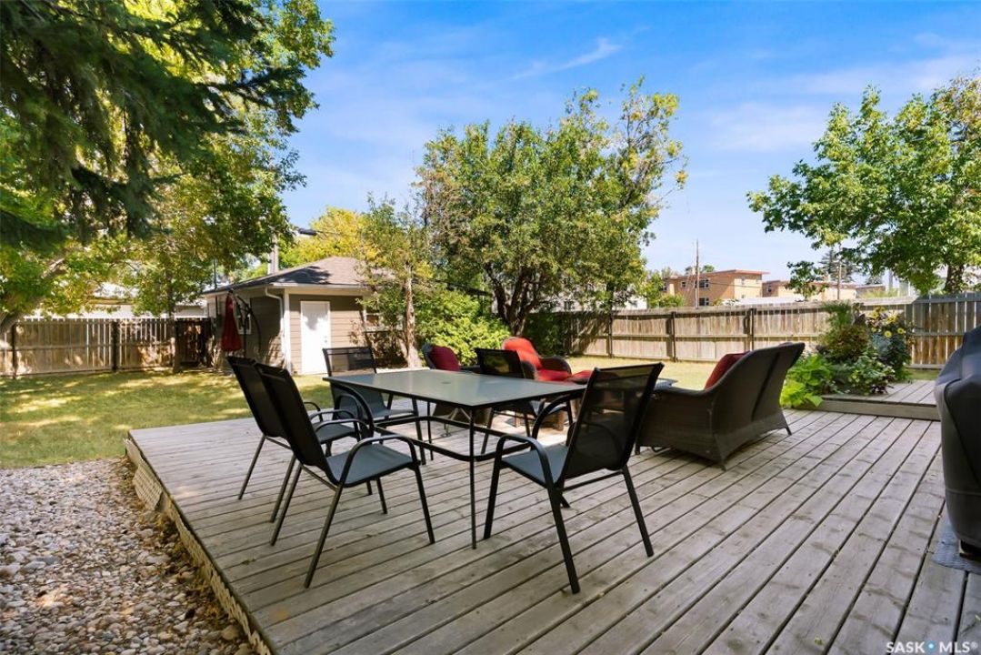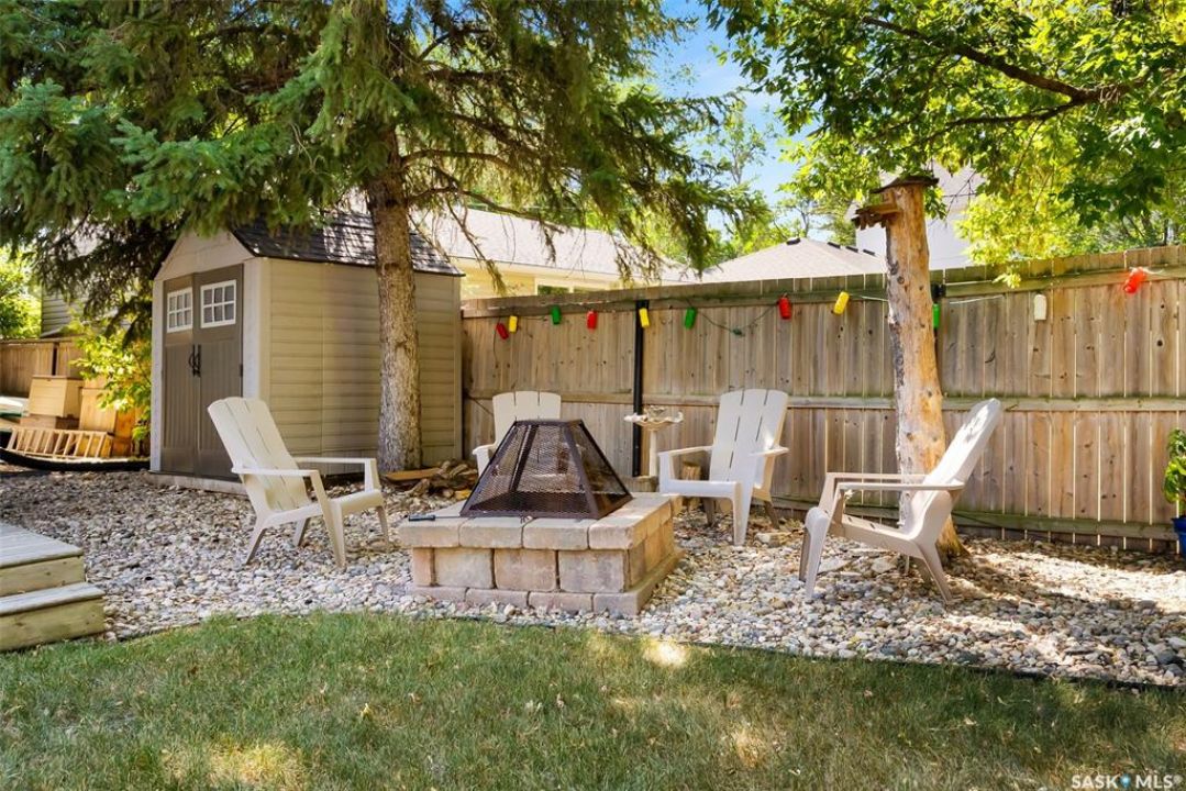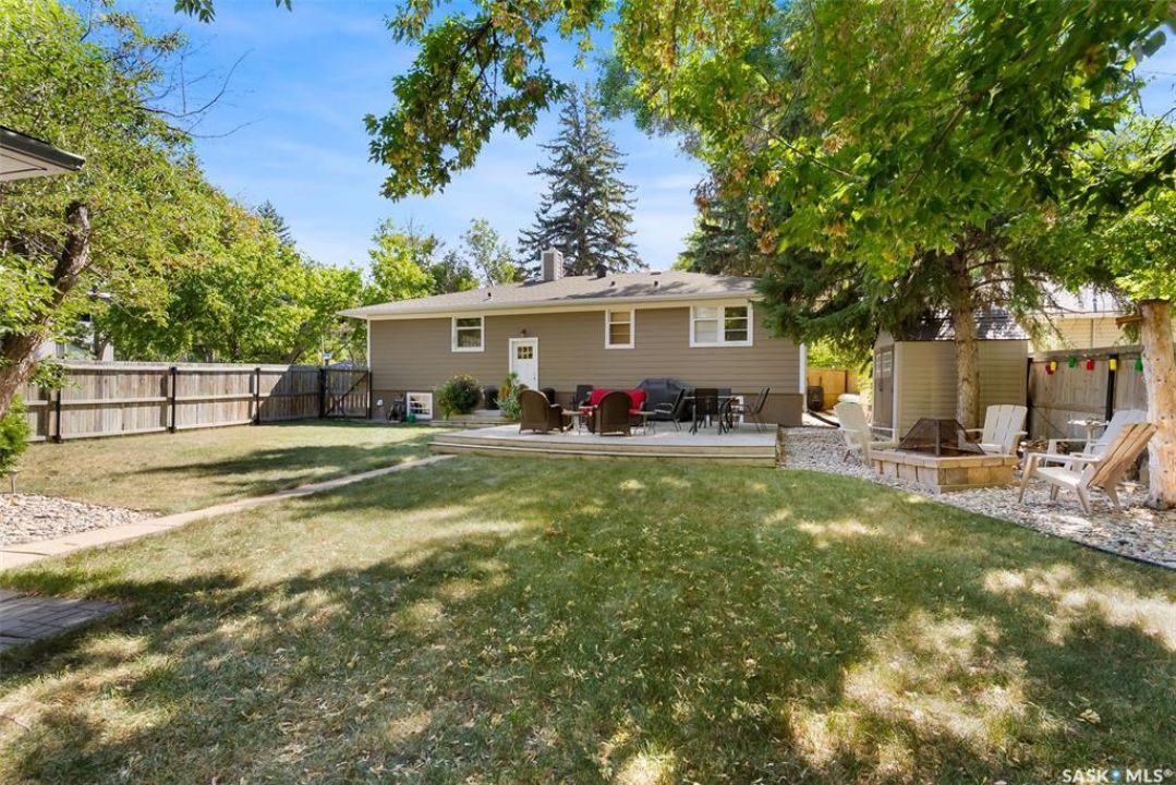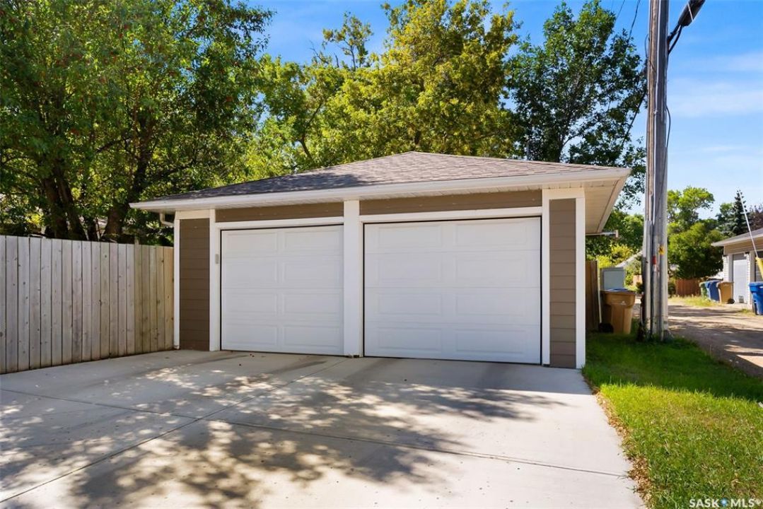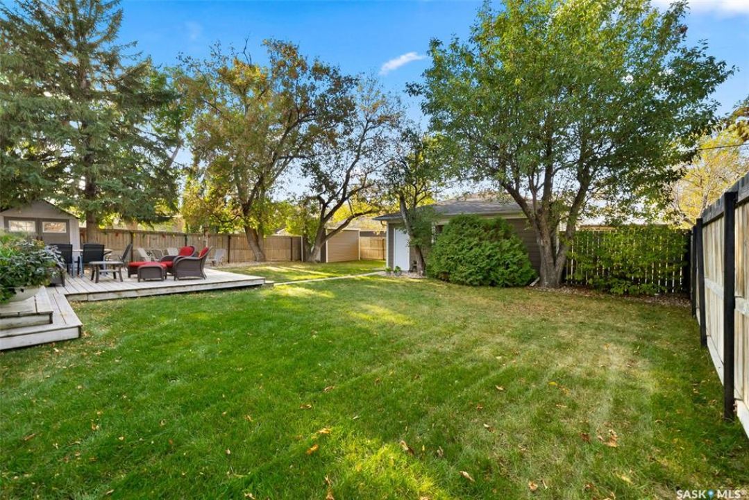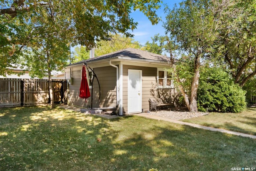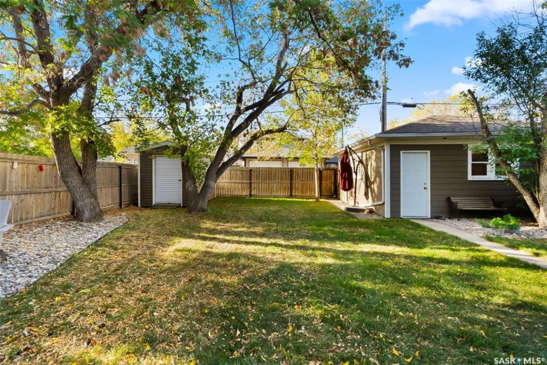 Welcome to 3402 Westgate Avenue, a beautifully updated 1,488 sq ft bungalow located in Lakeview, one of Regina's most sought after neighbourhoods. Situated on a mature, tree lined corner lot, this home offers the perfect blend of character, charm, and modern updates and is located just minutes from Wascana Lake, downtown, and all south end amenities. Step inside to an inviting open concept main floor featuring large windows and great sight-lines throughout the living, dining, and kitchen spaces. Original hardwood floors, original wood doors, and trim reflect the home's timeless character, while tasteful upgrades bring a fresh, modern feel. The white kitchen is a showstopper, boasting quartz countertops, a centre island, stainless steel appliances, high end cabinetry with built-in spice rack and appliance garage—all designed for functionality and style. The dining area comfortably fits a large table, making it ideal for hosting family and friends. Down the hall, you'll find three spacious main floor bedrooms with ample closet space and a 4 piece bathroom to complete the level. The fully finished basement offers even more living space with a large, bright family room, fourth bedroom, 3 piece bathroom, dedicated workout room, cold storage, laundry, and additional storage area. Making this home a perfect choice for growing families. Outside you can enjoy your private backyard space with a large low profile deck, fire pit area, large storage shed, and great fenced yard. The double detached garage is heated and insulated, with new garage doors and lane access. Additional exterior highlights include new Hardieboard siding and stone features, new shingles, upgraded electrical panel, new driveway, and newer fencing. The all reflecting true pride of ownership. Located in a friendly, walkable neighbourhood with access to top rated schools, parks, and local amenities, this home reflex true pride in ownership, and is move in ready for its next family.