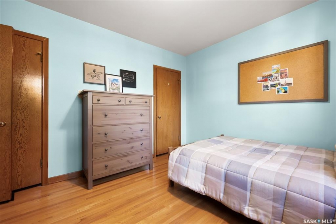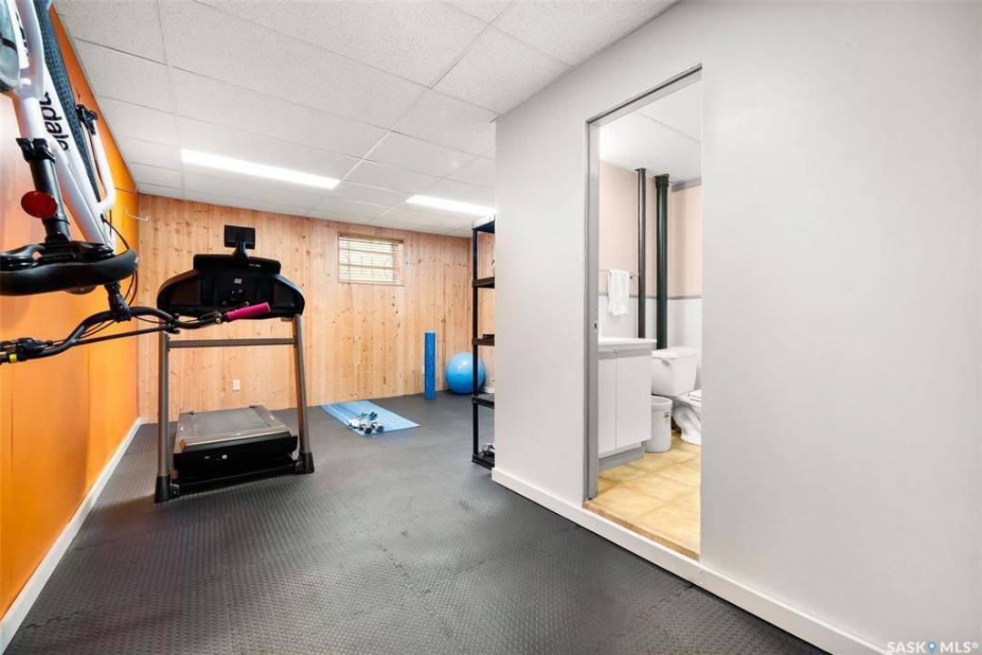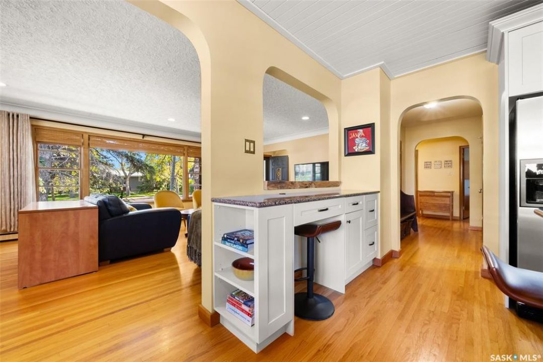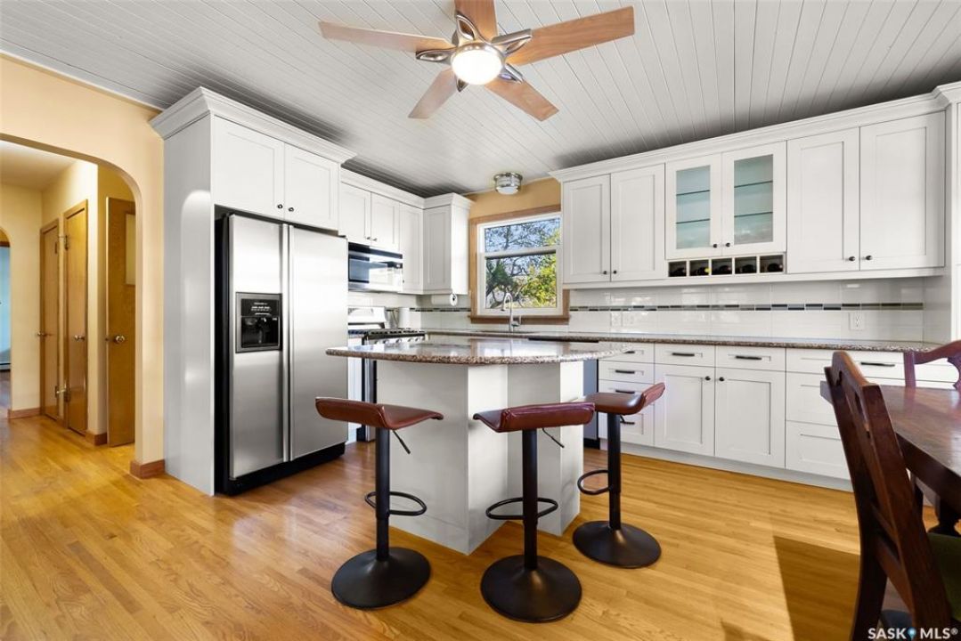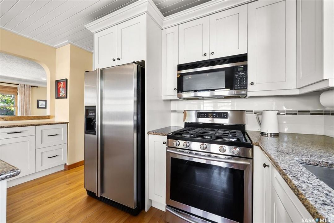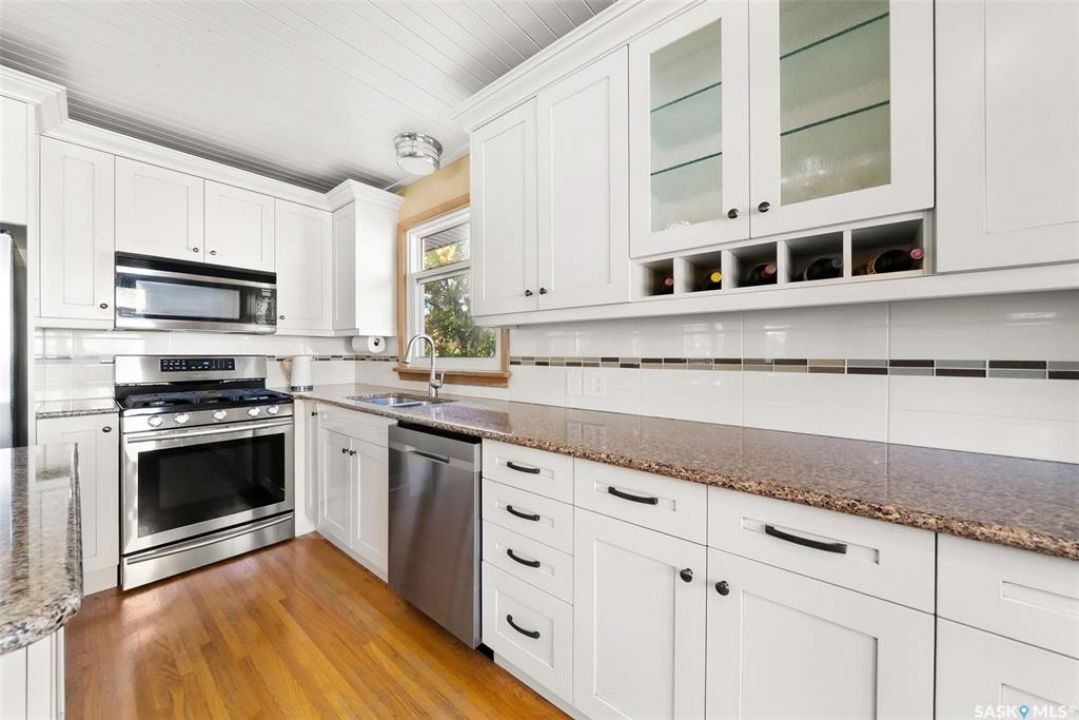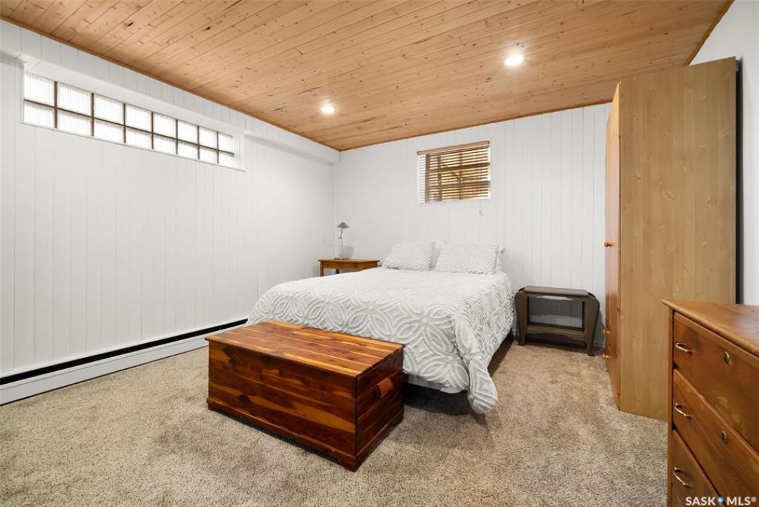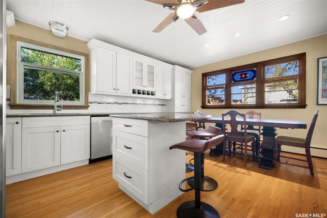 Welcome to 3402 Westgate Avenue, a beautifully updated 1,488 sq ft bungalow located in Lakeview, one of Regina's most sought after neighbourhoods. Situated on a mature, tree lined corner lot, this home offers the perfect blend of character, charm, and modern updates and is located just minutes from Wascana Lake, downtown, and all south end amenities. Step inside to an inviting open concept main floor featuring large windows and great sight-lines throughout the living, dining, and kitchen spaces. Original hardwood floors, original wood doors, and trim reflect the home's timeless character, while tasteful upgrades bring a fresh, modern feel. The white kitchen is a showstopper, boasting quartz countertops, a centre island, stainless steel appliances, high end cabinetry with built-in spice rack and appliance garage—all designed for functionality and style. The dining area comfortably fits a large table, making it ideal for hosting family and friends. Down the hall, you'll find three spacious main floor bedrooms with ample closet space and a 4 piece bathroom to complete the level. The fully finished basement offers even more living space with a large, bright family room, fourth bedroom, 3 piece bathroom, dedicated workout room, cold storage, laundry, and additional storage area. Making this home a perfect choice for growing families. Outside you can enjoy your private backyard space with a large low profile deck, fire pit area, large storage shed, and great fenced yard. The double detached garage is heated and insulated, with new garage doors and lane access. Additional exterior highlights include new Hardieboard siding and stone features, new shingles, upgraded electrical panel, new driveway, and newer fencing. The all reflecting true pride of ownership. Located in a friendly, walkable neighbourhood with access to top rated schools, parks, and local amenities, this home reflex true pride in ownership, and is move in ready for its next family.