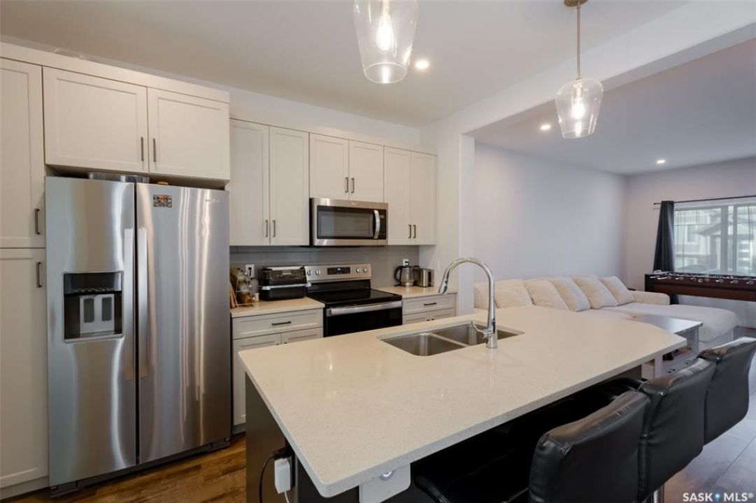 This stylish 2-storey home in the desirable Brighton neighborhood offers 1362 sq. ft. of designed living space. The kitchen features a sit-up island, custom cabinetry, quartz countertops, built-in dishwasher, and an exterior-vented over-the-range microwave. An open dining area flows seamlessly into the living room, complete with a striking stone feature wall and an electric fireplace, perfect for cozy evenings. Upstairs you'll find three bedrooms, including a primary suite with a walk-in closet and private 3-piece ensuite. Convenient second-floor laundry makes daily living easier. The lower level offers the option for a legal suite, providing excellent investment or mortgage helper potential. Outside, enjoy a landscaped front yard and a 22' x 22' parking pad. Located in beautiful Brighton, you'll be just minutes away from parks, schools, shopping, and many other amenities.