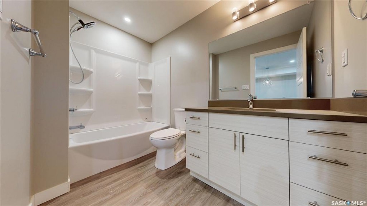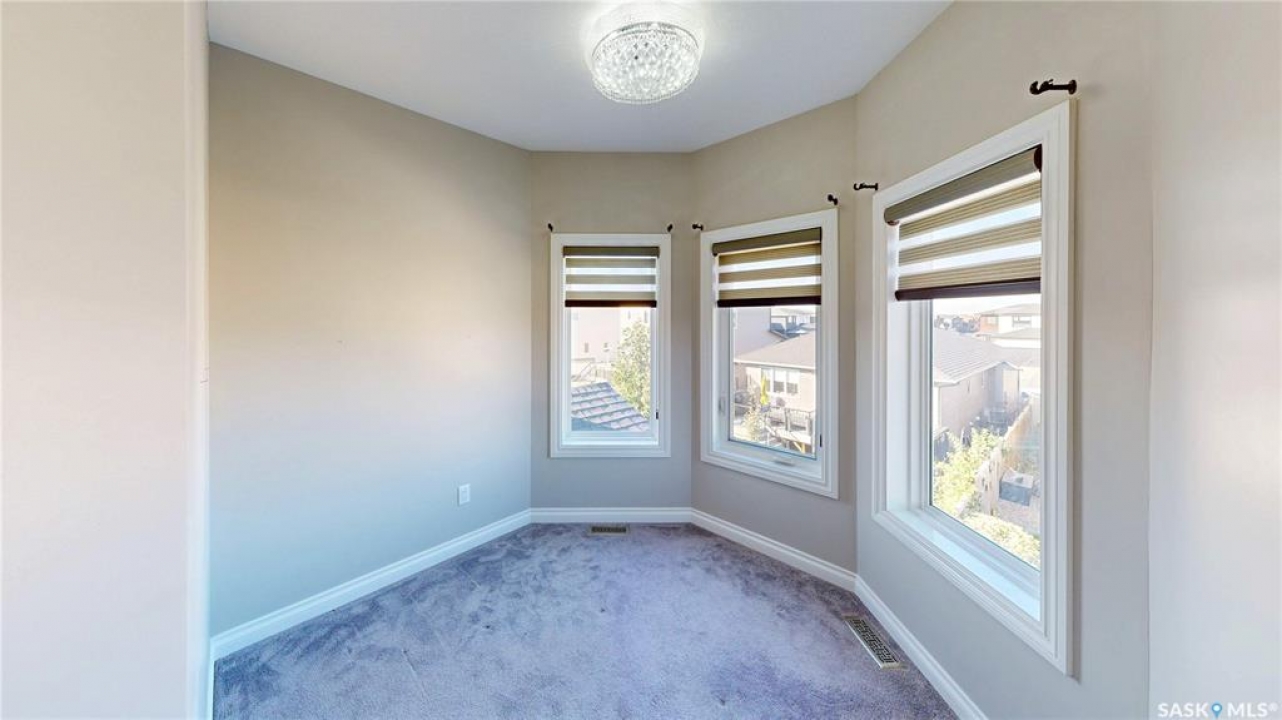 Welcome to your dream home! an elegant family home located in the vibrant Harbour Landing neighborhood. 2017 built, 2379 square foot, 5 bedroom 4 bathroom, 2 story house sits on a 40 x 115 rectangular lot. The front yard has a double concrete driveway that leads to the 24 x 24 heated and insulated double attached garage. The fully fenced backyard features a spacious deck, lush lawn, raised garden boxes, and a versatile patio area. Ideal for outdoor dining, entertaining, or evenings around a firepit. Upon entering, you are welcomed by a grand foyer embellished with an elegant chandelier, a coat closet, bench space, and convenient direct access to the garage. The main floor features a flexible first bedroom and a 4-piece bathroom, ideal for guests or as a home office. The heart of the home is the warm and inviting living room, accentuated by a striking brick feature wall, a cozy gas fireplace, and gleaming hardwood flooring. The adjoining kitchen includes an island with bar seating, a corner pantry, a modern tile backsplash, ample cupboard and drawer space, and sleek stainless steel appliances. The kitchen seamlessly transitions into the bright dining area, where three large windows frame serene views of the backyard, creating an ideal setting for family meals. On the upper level, the first stop is the 3-piece bathroom featuring a rainfall shower head, followed by a generously sized bedroom complete with its own closet. The luxurious primary suite offers a walk-in closet with built-in shelving and drawers, along with a spa-inspired 5-piece ensuite bathroom that includes a deep soaker tub, dual vanity, a spacious glass shower with a rainfall showerhead and storage space. A unique windowed nook within the primary bedroom provides a tranquil corner for reading or relaxation. The fully finished basement is designed as a private secondary suite with its own separate side entrance, making it perfect for multi-generational living or generating rental income.