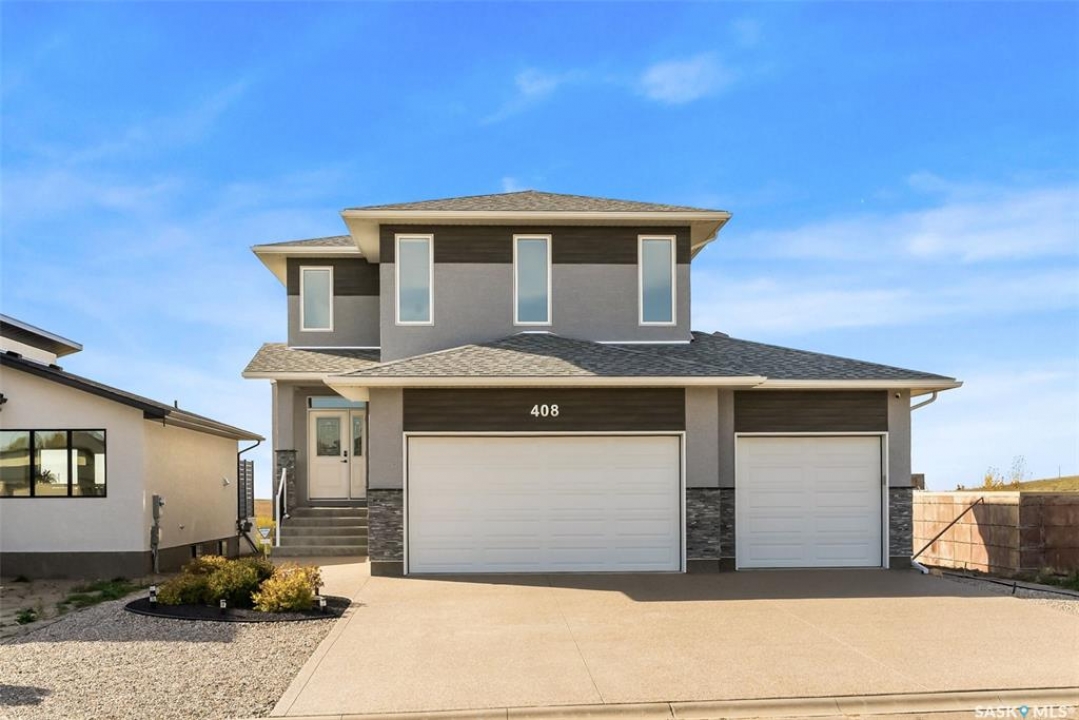 Welcome to 408 Hillside Drive in Pilot Butte! Built in 2020, this impressive 2-storey home offers over 1,700 sq. ft. of thoughtfully designed living space plus a triple attached garage. With modern finishes, premium upgrades, and a prairie backdrop, it's the perfect blend of style, comfort, and functionality. The main floor showcases an open-concept layout with engineered hardwood flooring and 2x6 construction on 16” centers. A bright living room centers around a remote-controlled gas fireplace with stone surround, while oversized windows fitted with Hunter Douglas top-down/bottom-up blinds capture expansive views. The chef's kitchen boasts quartz countertops, custom cabinetry with under-cabinet lighting, subway tile backsplash, stainless steel appliances including a granite sink, a large island, and walk-in pantry. The dining area opens onto a spacious deck, ideal for entertaining, while a powder room and mudroom with laundry complete this level. Upstairs, the primary suite impresses with 10' ceilings, a walk-in closet, and spa-inspired ensuite with dual sinks and custom tiled shower. Two additional bedrooms, a full bath, and a bonus room with balcony access offer versatility for family living. The basement is open for development, with exterior walls spray-foamed and drywalled—ready for your personal touch. Notable upgrades include a whole-home water filtration system, surge protection, central A/C, on-demand hot water, and hot/cold water taps in the garage. Curb appeal shines with a fully insulated triple garage, exposed aggregate driveway, and beautifully landscaped yard. The backyard retreat features underground sprinklers, raised garden beds, lush lawn, a composite deck, and tiled patio backing green space—perfect for enjoying Saskatchewan sunsets. This home combines quality construction, thoughtful upgrades, and an unbeatable Pilot Butte location. Truly move-in ready for its next proud owner. NOTE: 2 outdoor cameras are NOT included
