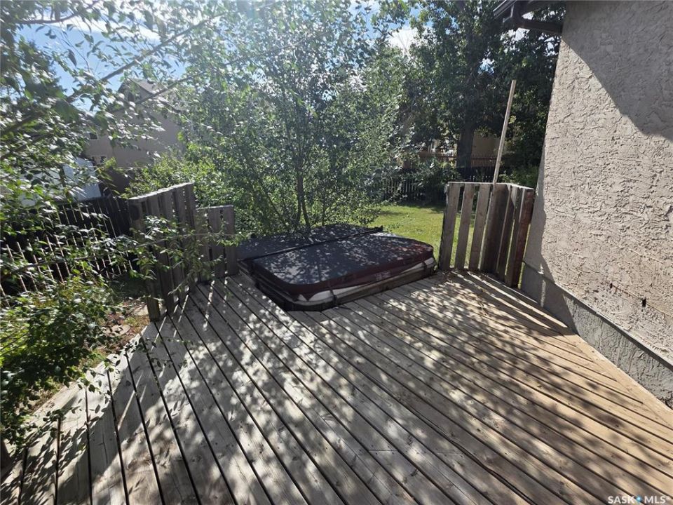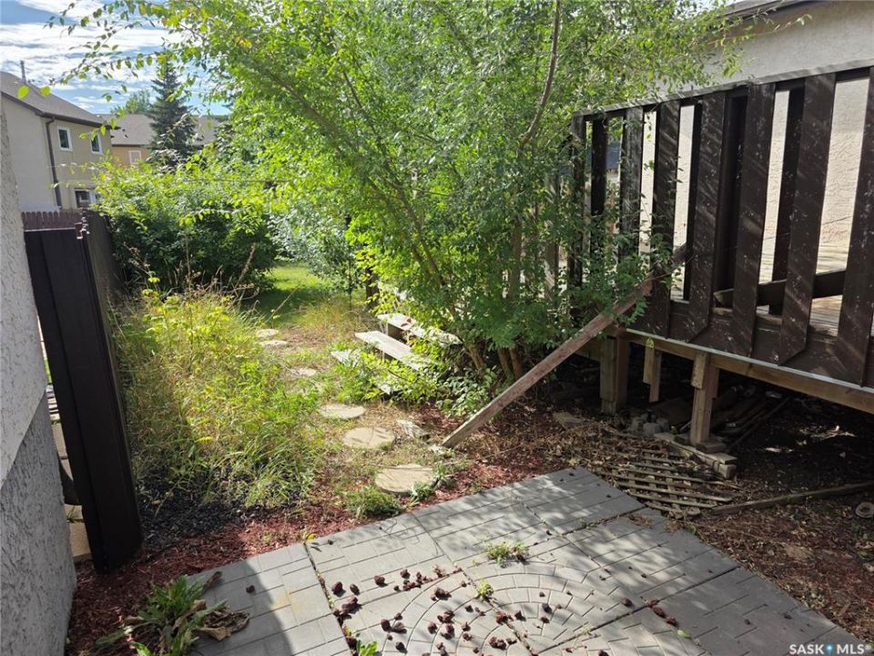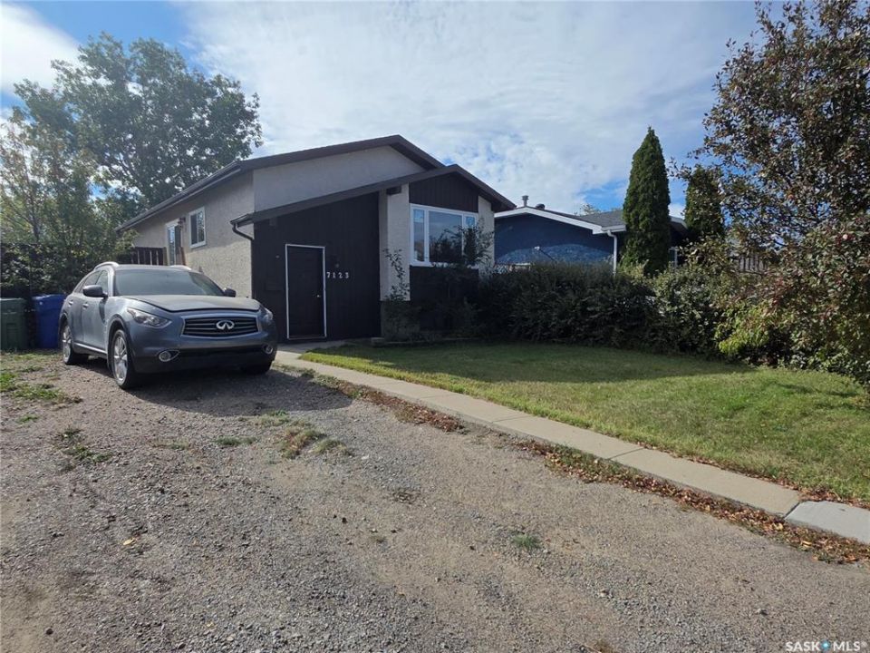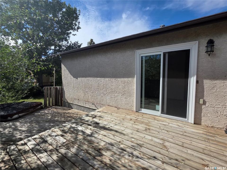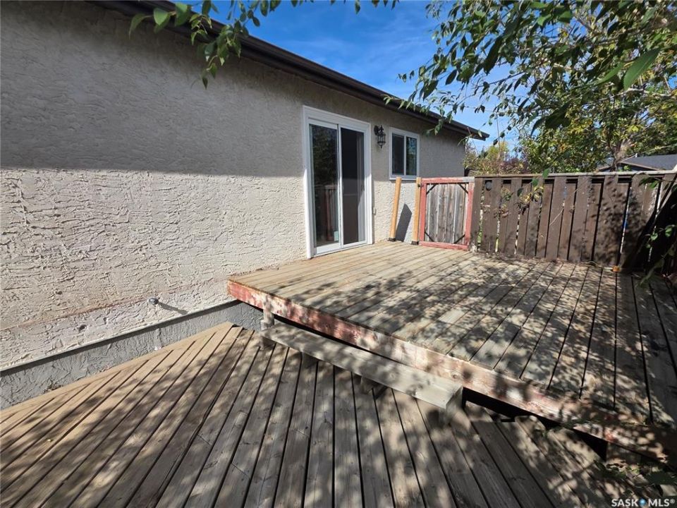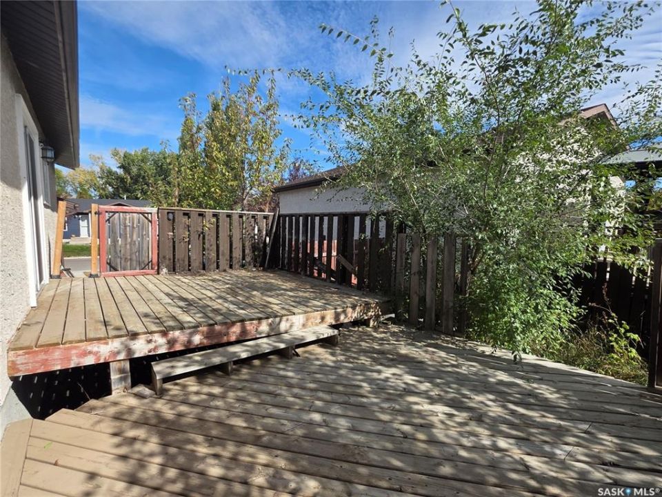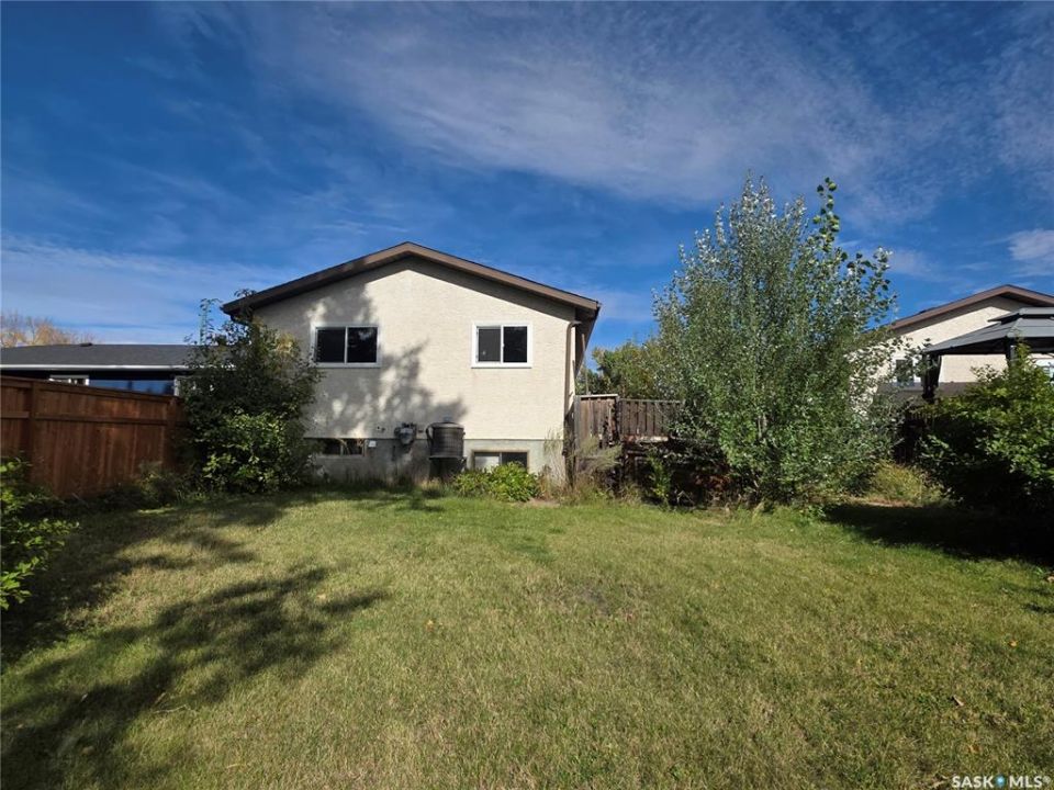 Starter home with major glow-up potential—your Pinterest board called, time to bring your ideas to life! This 2 bedroom, 1 bathroom bi-level offers 899 sqft of potential and is ready for a new family to make it their own. With a little paint, new flooring, and your personal touch, this house can easily become your home. The bright front-facing living room is filled with natural light and flows into the kitchen and eat-in dining space. Patio doors lead to a double-tiered side deck—perfect for BBQ nights and watching the kids play. The kitchen comes complete with fridge, stove, and dishwasher. Two bedrooms and a full bath finish off the main floor. The basement is already framed for a future rec room, den, bathroom, and utility/laundry area, giving you a head start on creating extra living space. Practical updates include newer shingles, updated windows on the main level, and central A/C for summer comfort. Step outside to a fully fenced backyard where kids and pets can play safely, plus enjoy cherry and plum trees right in your own yard! A front gravel driveway provides plenty of off-street parking for you and your guests. All of this is located in the family-friendly neighborhood of Rochdale Park in NW Regina, walking distance to the NW Leisure Centre, Doug Wickenheiser Arena, parks, and tons of nearby amenities.