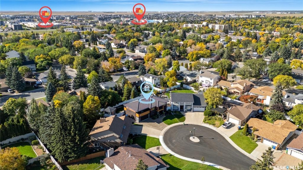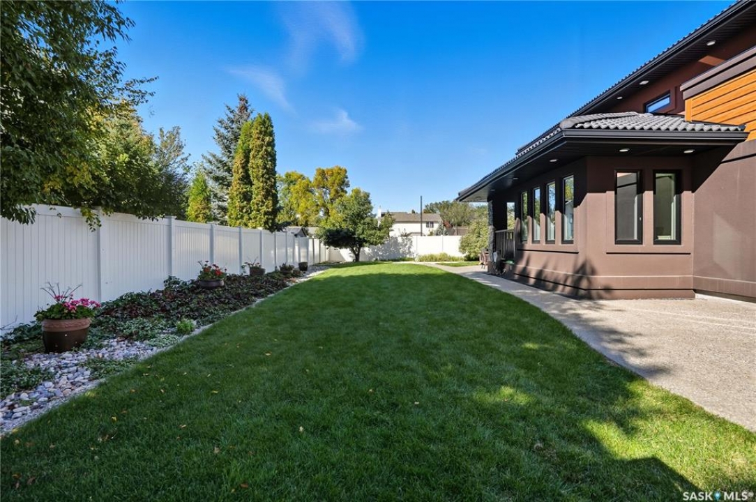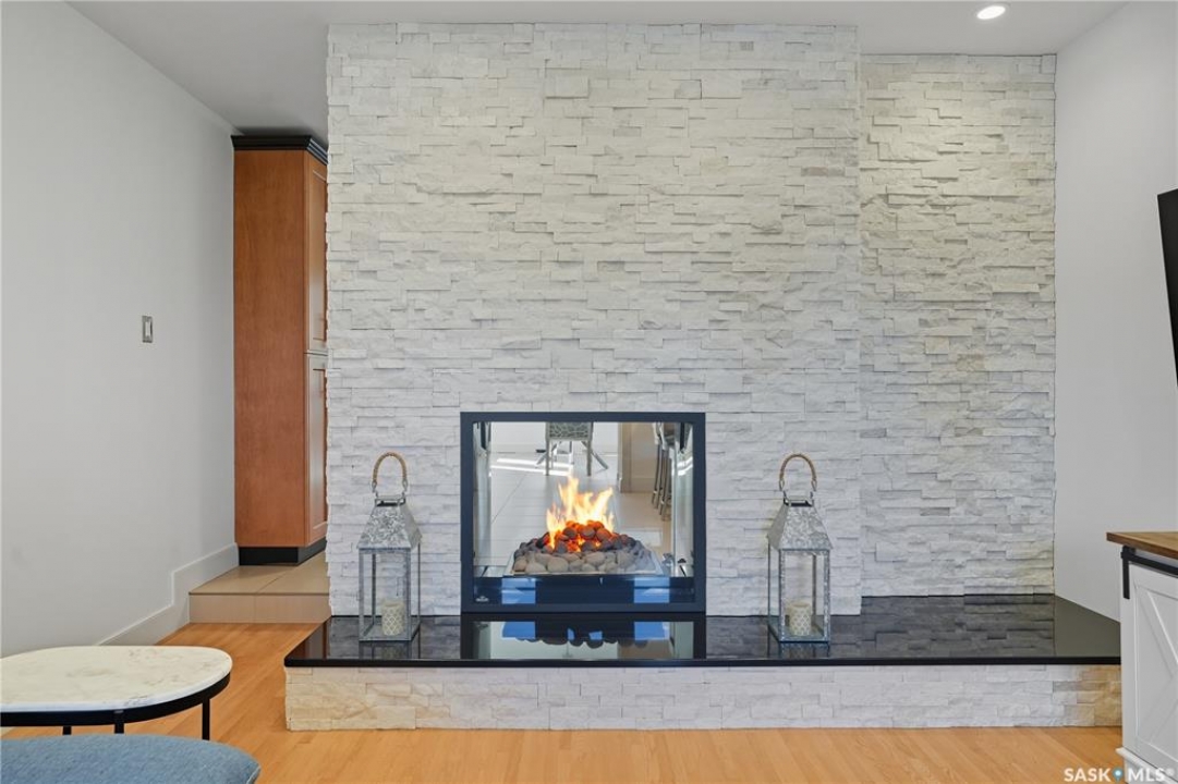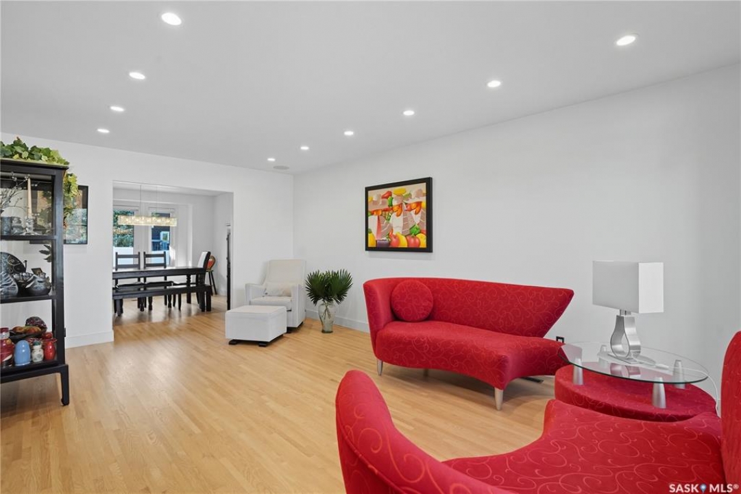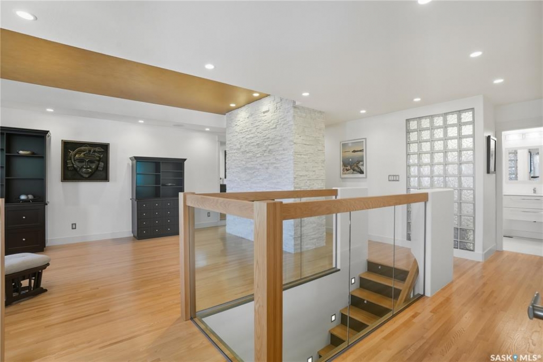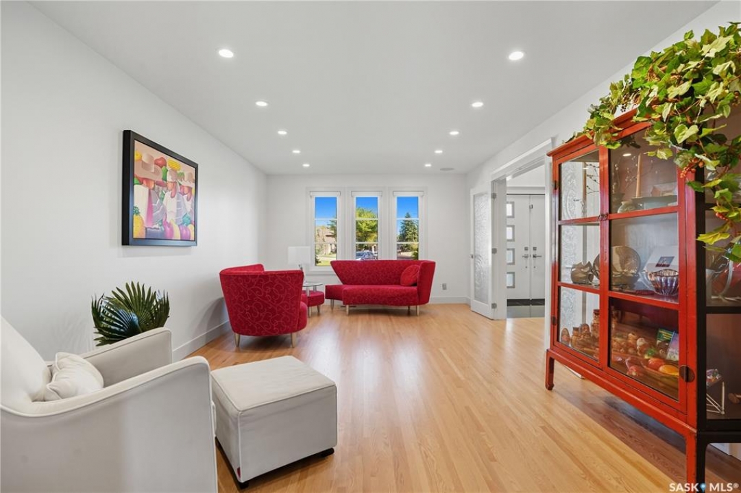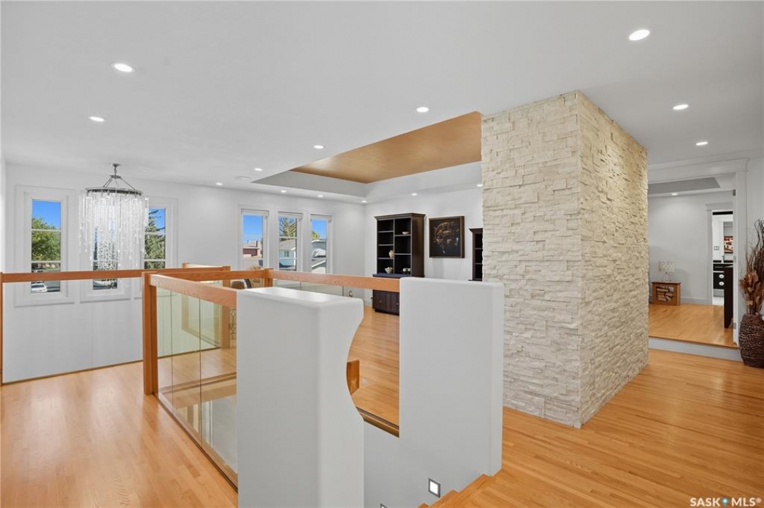 Welcome to 34 Leslie Place, a quiet bay in Regina's desirable Albert Park. This extensively renovated home blends elegance, comfort, and functionality—ready for immediate enjoyment. The grand entryway opens to a sunken living room with a 2-way gas fireplace and white quartz surround, a central wood-tile staircase, family room, and formal dining area overlooking the backyard. Custom hardwood floors flow throughout. The kitchen features warm wood cabinetry, granite countertops, tile flooring, double stainless sinks, a fireplace, and a cozy breakfast nook. A 2-piece bath and office/den with private entrance—currently a salon—complete the main floor. Upstairs, a bonus room overlooks a crystal chandelier and highlights custom woodwork, a gas fireplace, coffered ceiling, pot lights, and built-in sound. The luxurious 5-piece bath offers double sinks, glass block accents, and a seating area. The spacious primary suite includes two private balconies, dual closets (including built-in shoe storage), and a spa-like ensuite with soaker tub, walk-in shower, and water closet. Three additional bedrooms complete the upper level. The finished basement features a soundproof entertainment room, bedroom, 3-piece bath, and laundry with sink and cabinetry. Outside, enjoy a fully landscaped corner lot with stone/stucco exterior, wood accents, custom lighting, and double drive. The PVC-fenced backyard includes a covered deck wired for sound, stone patio, and heated double garage with epoxy floors and aluminum/glass door. Value-added features: built on piles, exterior EIFS envelope, tile roofing system, natural gas BBQ hookup, central A/C, Control4 system, alarm, 200-amp panel, sewer backflow valve, HRV, hi-eff furnaces with humidifiers, and more. All drawings and improvement details available. A rare find in a prime location—call your agent today.