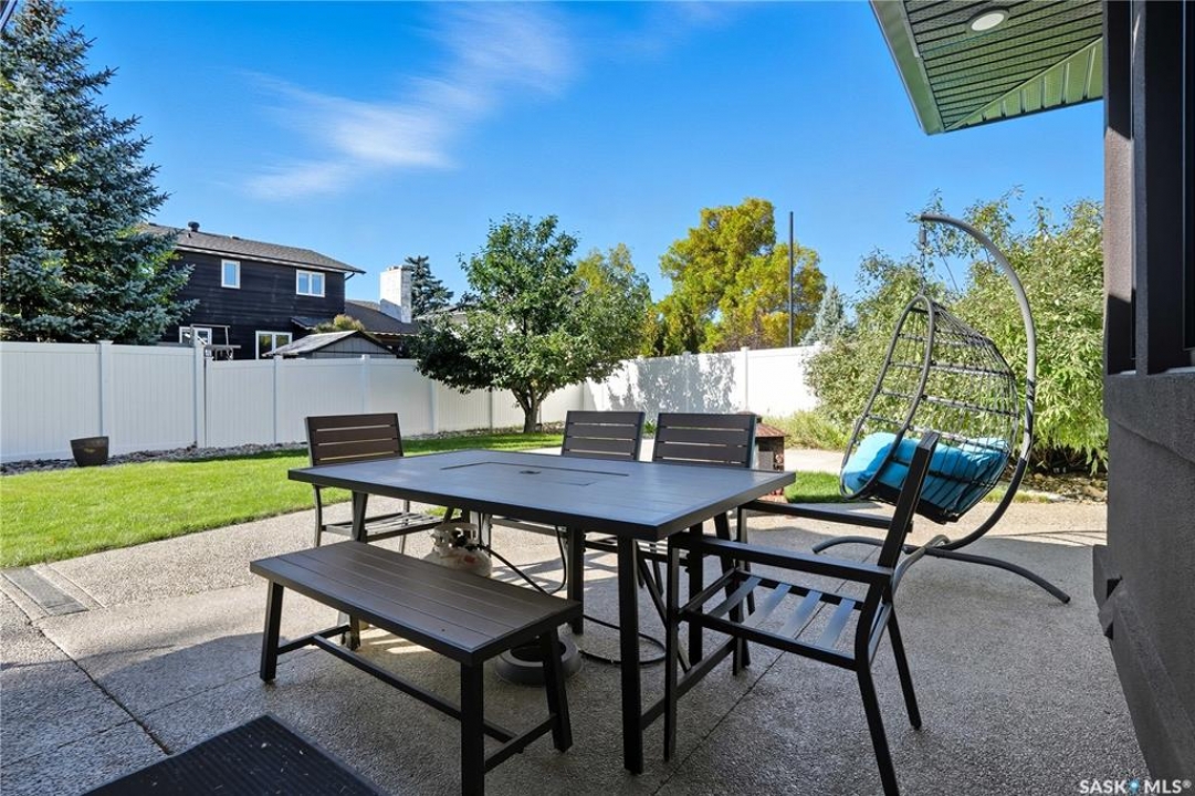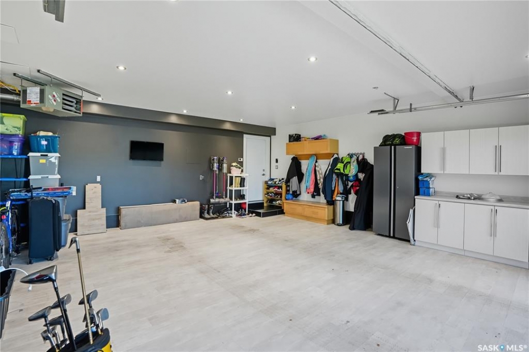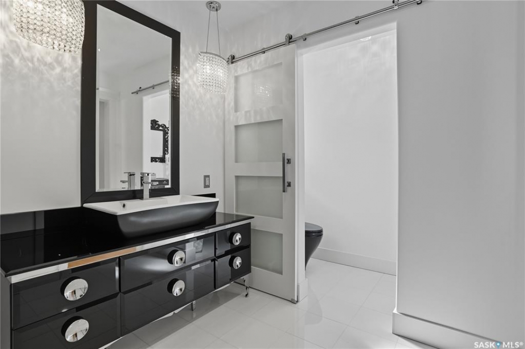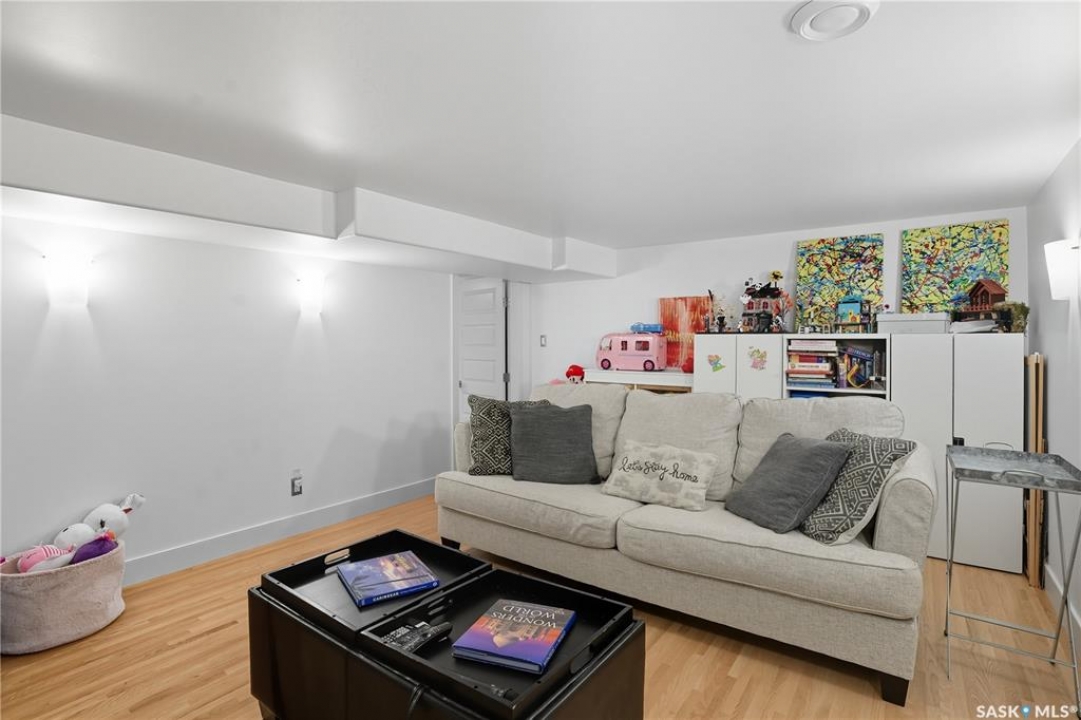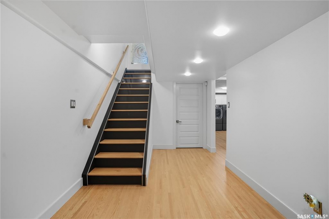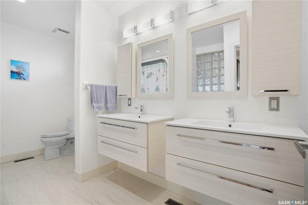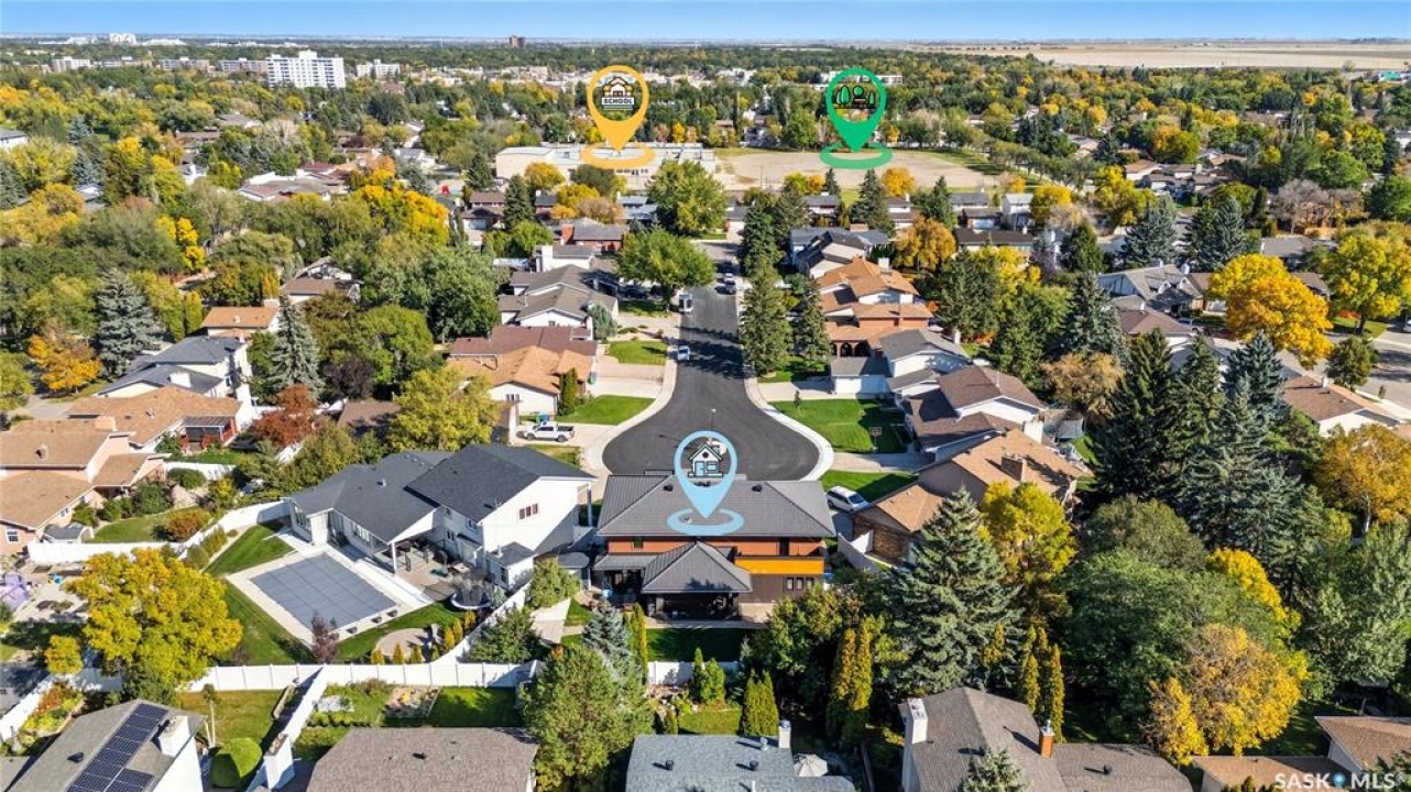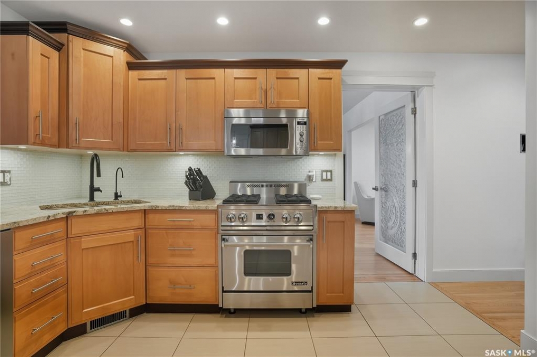 Welcome to 34 Leslie Place, a quiet bay in Regina's desirable Albert Park. This extensively renovated home blends elegance, comfort, and functionality—ready for immediate enjoyment. The grand entryway opens to a sunken living room with a 2-way gas fireplace and white quartz surround, a central wood-tile staircase, family room, and formal dining area overlooking the backyard. Custom hardwood floors flow throughout. The kitchen features warm wood cabinetry, granite countertops, tile flooring, double stainless sinks, a fireplace, and a cozy breakfast nook. A 2-piece bath and office/den with private entrance—currently a salon—complete the main floor. Upstairs, a bonus room overlooks a crystal chandelier and highlights custom woodwork, a gas fireplace, coffered ceiling, pot lights, and built-in sound. The luxurious 5-piece bath offers double sinks, glass block accents, and a seating area. The spacious primary suite includes two private balconies, dual closets (including built-in shoe storage), and a spa-like ensuite with soaker tub, walk-in shower, and water closet. Three additional bedrooms complete the upper level. The finished basement features a soundproof entertainment room, bedroom, 3-piece bath, and laundry with sink and cabinetry. Outside, enjoy a fully landscaped corner lot with stone/stucco exterior, wood accents, custom lighting, and double drive. The PVC-fenced backyard includes a covered deck wired for sound, stone patio, and heated double garage with epoxy floors and aluminum/glass door. Value-added features: built on piles, exterior EIFS envelope, tile roofing system, natural gas BBQ hookup, central A/C, Control4 system, alarm, 200-amp panel, sewer backflow valve, HRV, hi-eff furnaces with humidifiers, and more. All drawings and improvement details available. A rare find in a prime location—call your agent today.