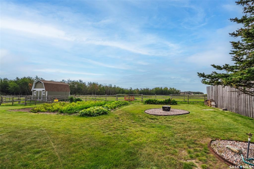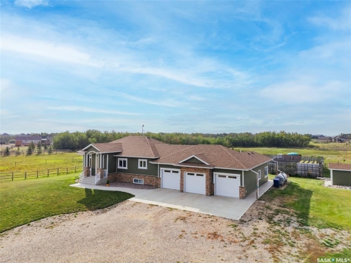 Welcome to 118 Louise Crescent in the coveted acreage community of Cherry Hills — just 15 minutes from Saskatoon's edge. This 1,502 sq. ft. executive bungalow is a stunning blend of modern design, smart functionality, and country charm. Step inside to discover a bright, open-concept main floor with an exceptional window package that floods the home with natural light. The spacious living room, dining area, and kitchen flow seamlessly under a vaulted ceiling, creating the perfect setting for entertaining or relaxing. The kitchen features quartz countertops, a corner pantry, roll-out drawers, stainless steal appliances. The dining room can easily seat a large extended family for holiday meals and the gas fireplace in the adjoining living room makes for cozy evenings. Hardwood runs throughout the main level, and a covered deck off the dining area allows for year-round BBQ. The primary suite is a lovely retreat, offering a large walk-in closet and an ensuite with a soaker tub beneath a privacy rain-glass window, heated floors, and a walk-in shower. A 2nd large bedroom (or office), another 4-piece bath, and a spacious mudroom/laundry room with built-in cabinetry, quartz countertops, and deep utility sink complete the main floor — all leading to an oversized triple-car garage with a separate workshop bay and a sunlit all-season greenhouse.The fully finished basement features a large family and games area, 2 more bedrooms, 4-piece bath, and a vented cold storage room perfect for preserves or wine. Outside, the 7.14 acre property is 3/4 fenced with treated rail fencing, hotwired, & divided into five paddocks with a 4-season watering bowl sourced by underground lines. Mature spruce trees border the property, and there's a drive-in garden shed, an adorable matching horse barn, and 2 fully developed gardens with direct waterlines. Complete with central air, central vac, and window coverings, this Cherry Hills acreage offers comfort with country serenity — a truly rare find.