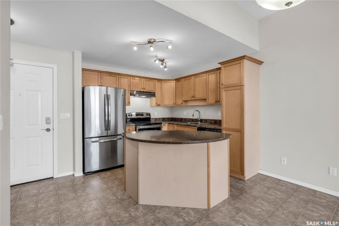 Welcome to unit #414 – 235 Herold Terrace, in the beautiful neighborhood of Lakewood! Conveniently close to many shopping centers, parks, walking trails, bus stops, dog park, and easy access to Circle Drive! Stepping inside your top floor unit, you are greeted with an abundance of natural light flowing throughout. The kitchen provides you with stainless steel appliances, including fridge, stove, dishwasher and hood fan, maple cabinets, pantry and island for additional counter and cabinet space. The living room features 10ft ceilings, a large window and access to your East facing balcony. Coming to the primary bedroom, offering a walk-in closet with custom organizers, and a 3-pc ensuite with sliding glass shower. One additional bedroom, a 4-pc bath, and in-suite laundry room complete this very well-kept home! Additional features include A/C, central vac, and two surface parking stalls! This stunning condo is a must-see in a highly sought after location!