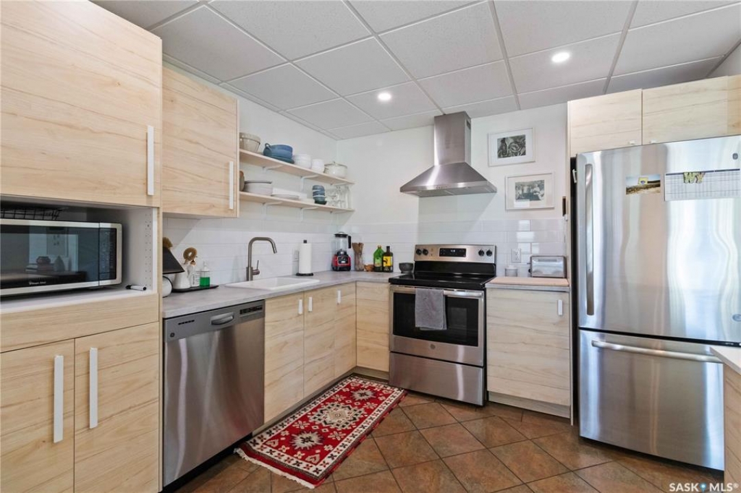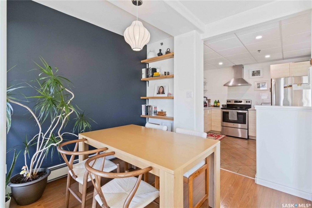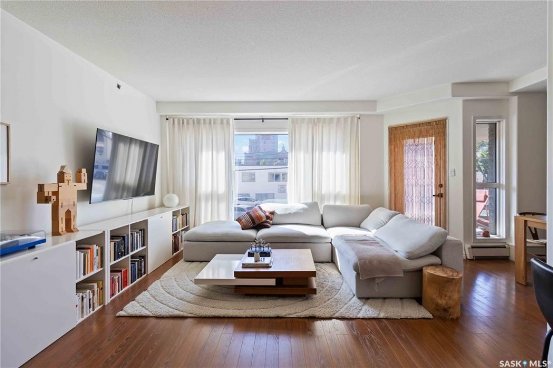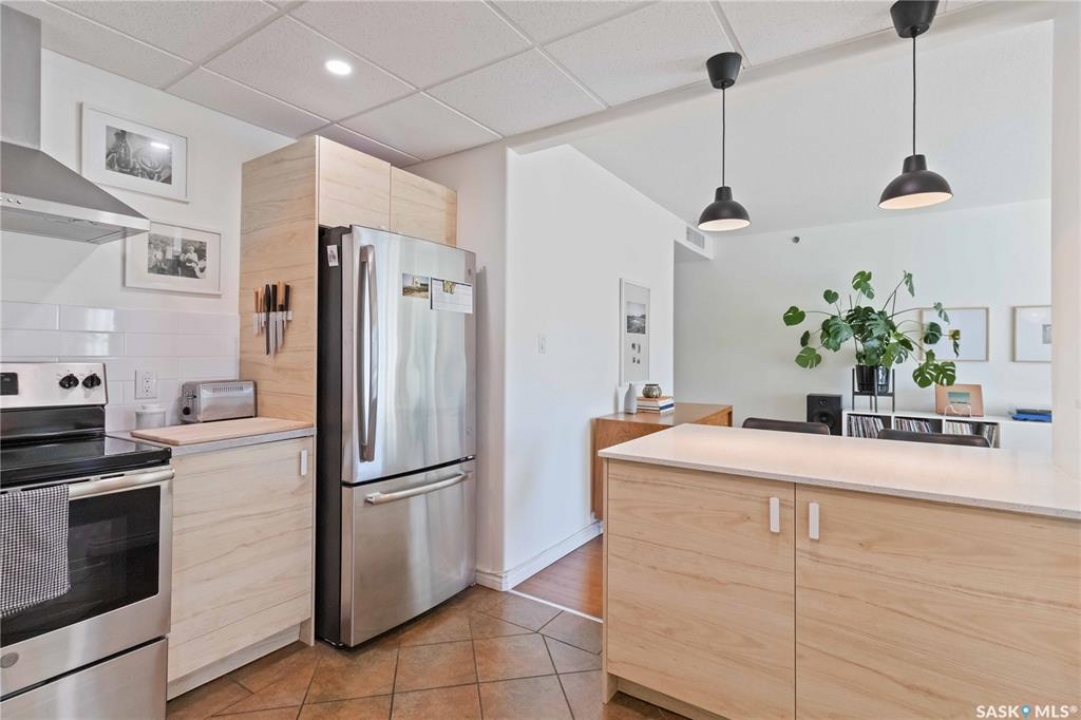This condo is located on the first floor, with easy elevator access. Inside, you're greeted by a bright and spacious entryway. The unit offers an open-concept living and kitchen area. The kitchen stands out with its quartz-topped island, modern Scandinavian-inspired cabinetry, tiled backsplash, sleek pot lighting, stainless steel appliances. Just off the dining space, you'll find a private west-facing balcony with a BBQ hookup—perfect for enjoying sunny afternoons and glowing evening sunsets. The living room is generously sized, featuring large windows that fill the space with natural light. The primary bedroom includes a full ensuite with a walk-in shower, while the second bedroom (currently used as an office) sits adjacent to the main bath with tub/shower combo. Additional highlights include in-suite laundry, central air conditioning, and the convenience of having the laundry room tucked away near the entry. Recent Chg: 09/22/2025 : NEW : ->A