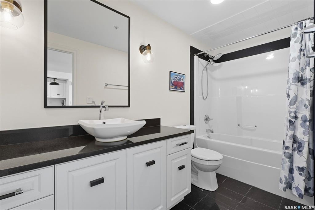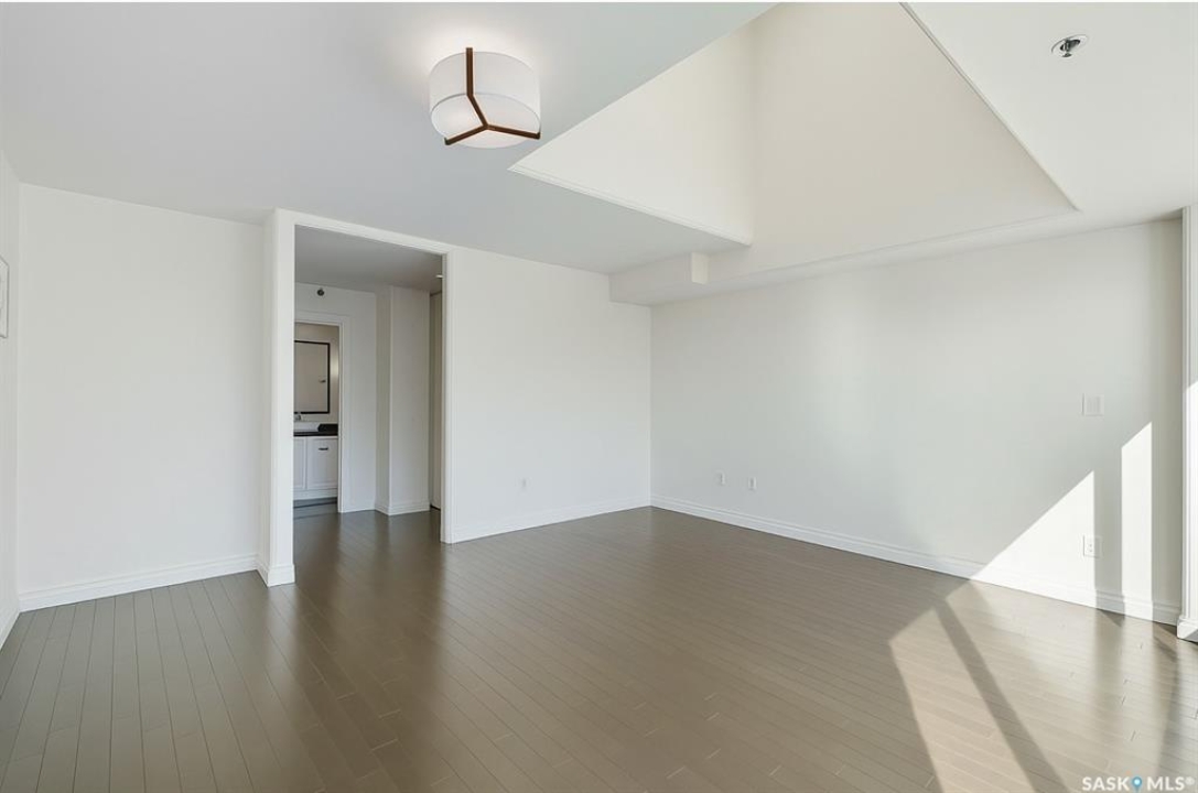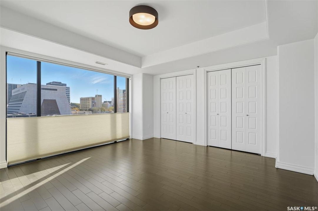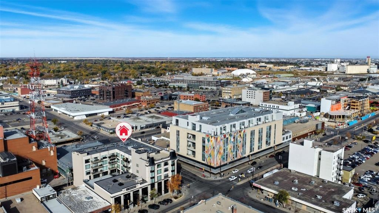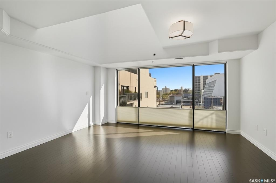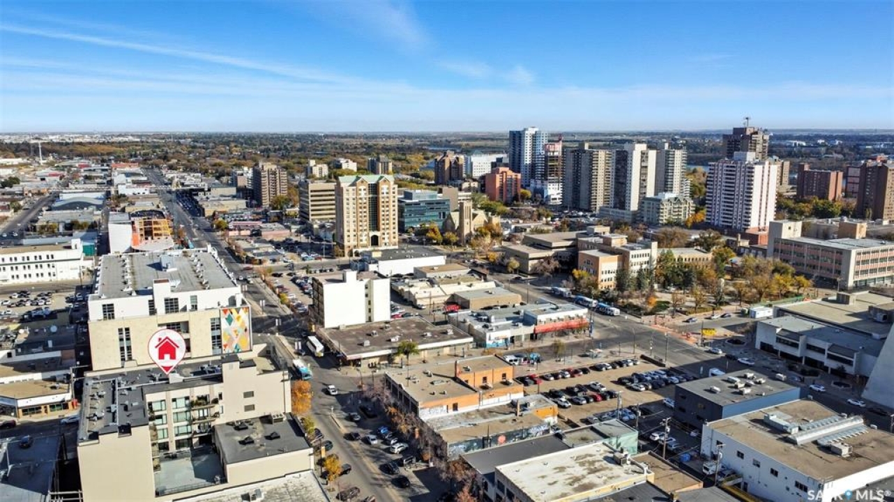 A Rare Opportunity to Own a Piece of Saskatoon's History! Welcome to The Residences at the King George — an iconic landmark originally built in 1911 and fully restored by Meridian Development in 2010. Reconstructed from its original concrete frame with all modern materials and mechanical systems, this award-winning building showcases a transitional French design that blends heritage and modern luxury. Historic details such as the original chandeliers, lobby monogrammed keystone, and ornate black powder-coated stair railings have been beautifully preserved. This stunning top floor corner unit offers a perfect mix of elegance, comfort, and security in the heart of downtown Saskatoon — steps from restaurants, shops, services, and nightlife. The high-security building features video surveillance and coded/fob access at all entry points. Inside, enjoy newer engineered hardwood flooring, floor-to-ceiling windows, and an East-facing balcony with city views. The designer kitchen includes granite countertops, ceiling-height cabinetry, large island with seating, dual undermount sinks, wine fridge, under-cabinet lighting, garburator, and premium appliances — including a GE Café induction range and Bosch dishwasher. Additional upgrades include modern lighting and hardware, Hunter Douglas blinds, Lutron Caseta smart lighting and smart thermostat.The luxurious bathrooms feature black granite tile flooring and oversized vanities. The spacious primary bedroom offers vaulted ceilings, a skylight, and custom built-in closets. Other highlights include in-suite laundry, central air, two heated underground parking stalls, and an 11' x 7' storage unit with street-style bike racks. Residents enjoy access to a beautiful rooftop patio with elevator service to the fifth floor and parkade — perfect for entertaining. All of this, just four blocks from the river!