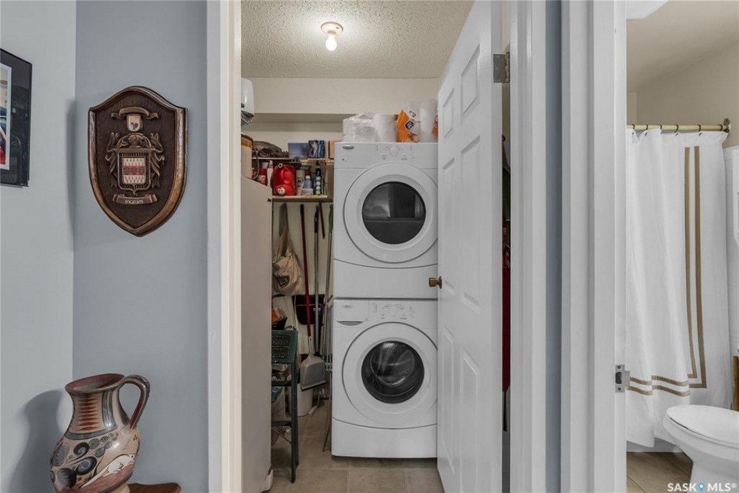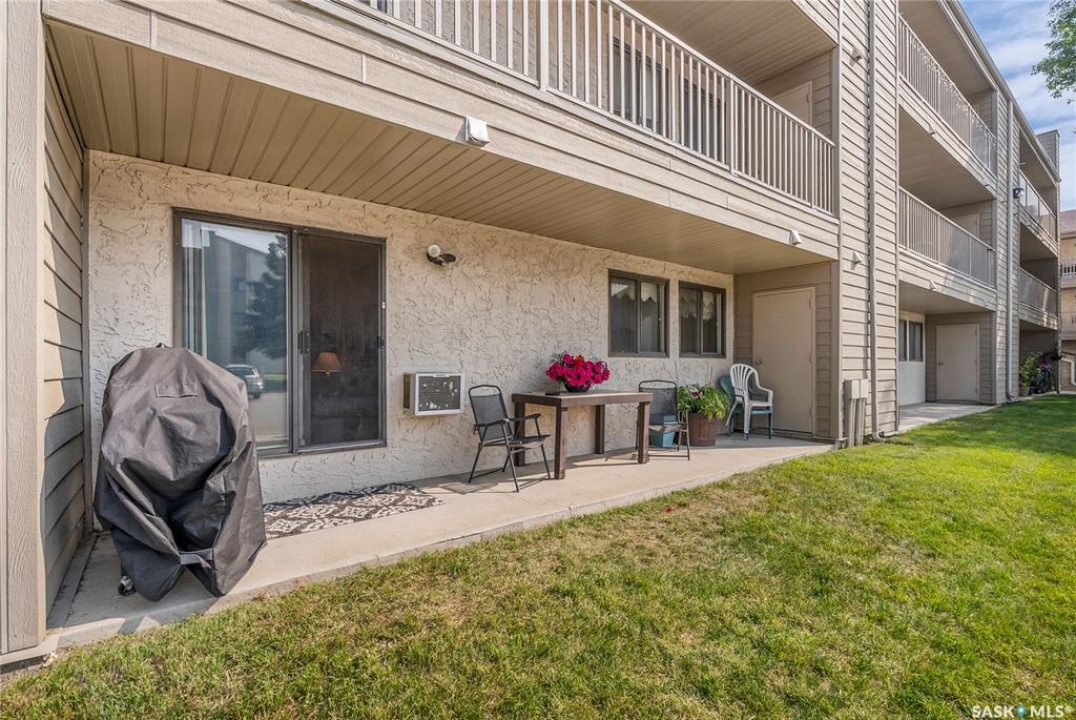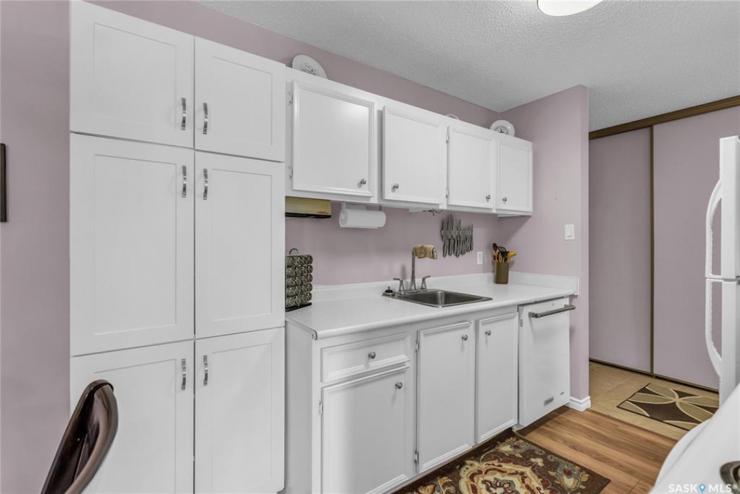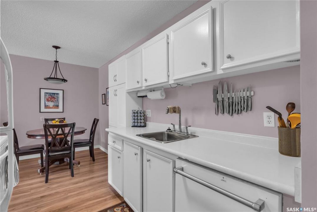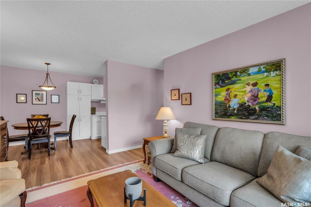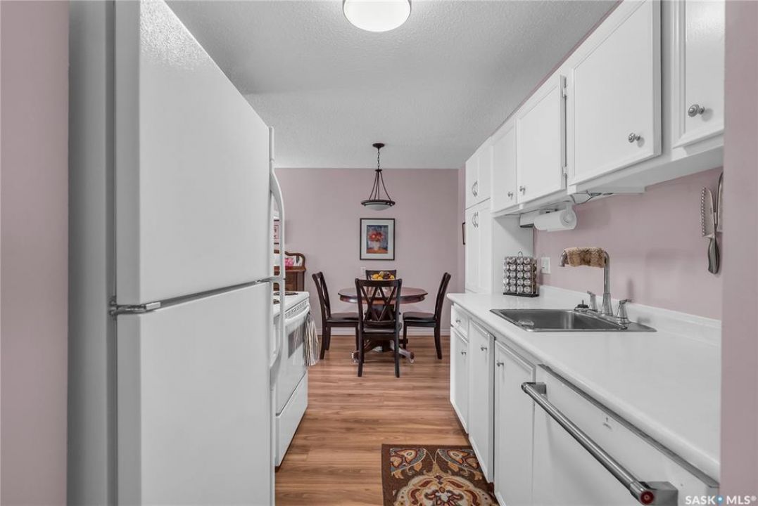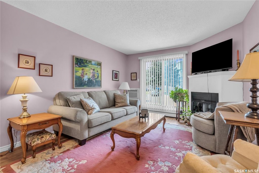 Beautifully maintained 2 bedroom corner unit located in a quiet complex. This bright and inviting condo features upgraded flooring and is conveniently located on the main floor. The functional layout offers two generously sized bedrooms and a full bathroom. There is a cozy living room with electric fireplace and the parking stall is right outside the door. Centrally located and close to grocery stores, parks, amenities and easy access to the U of S. Great value and move-in ready.