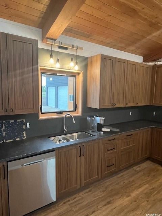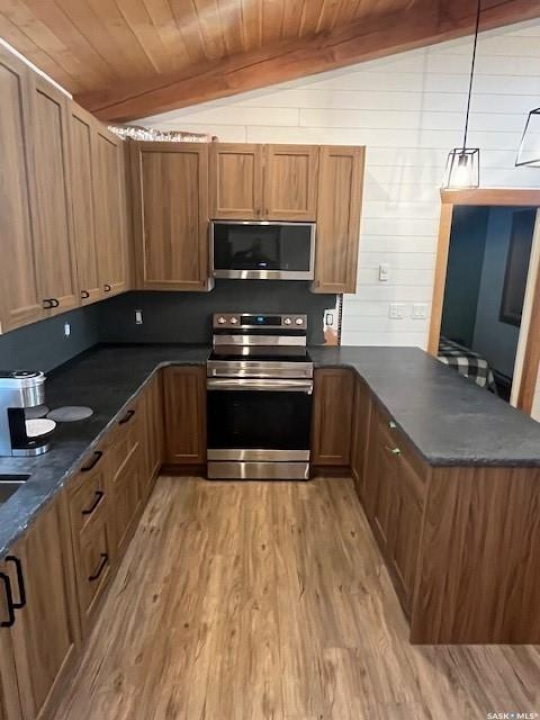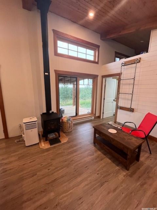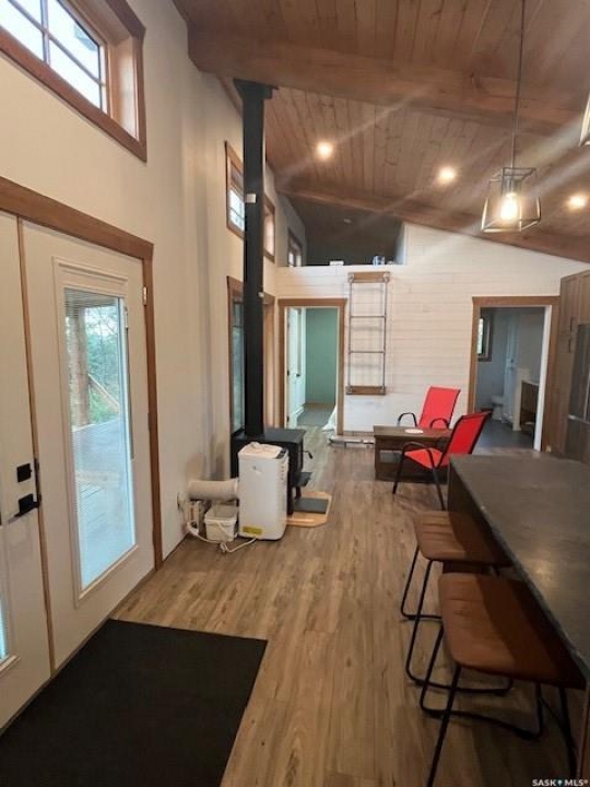 You don't have to buy an old "fixer upper" to be able to afford a home at the lake! Brand new low footprint option that's efficient and affordable! Smaller bedroom, combined bathroom and utility leaves spacious kitchen and living room. South facing deck just above the trees backing Wakaw Lake Golf Course.Included is a brand new double garage with full cement floor and remote openers. Just off the lake private and quiet!