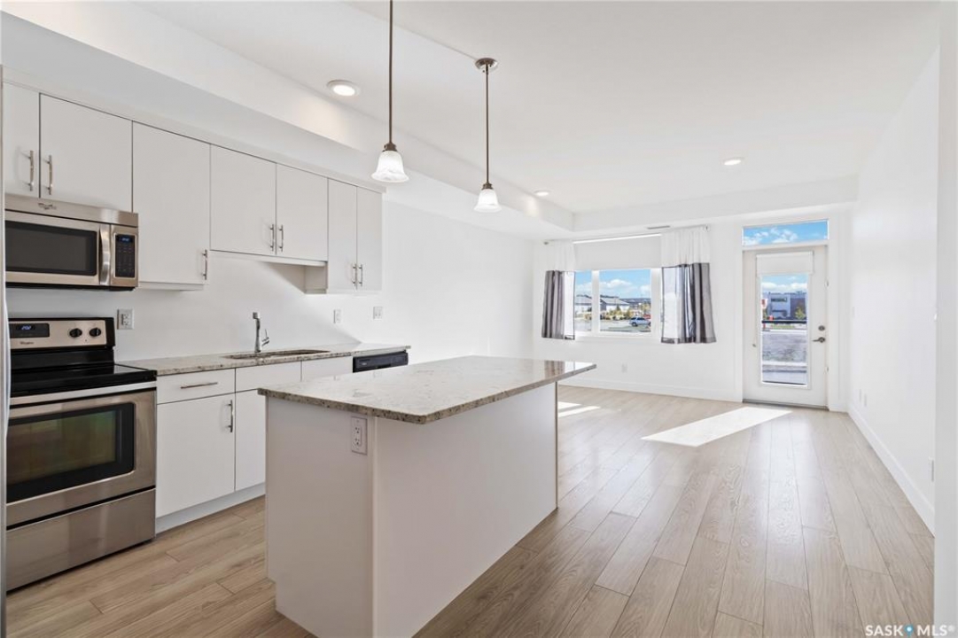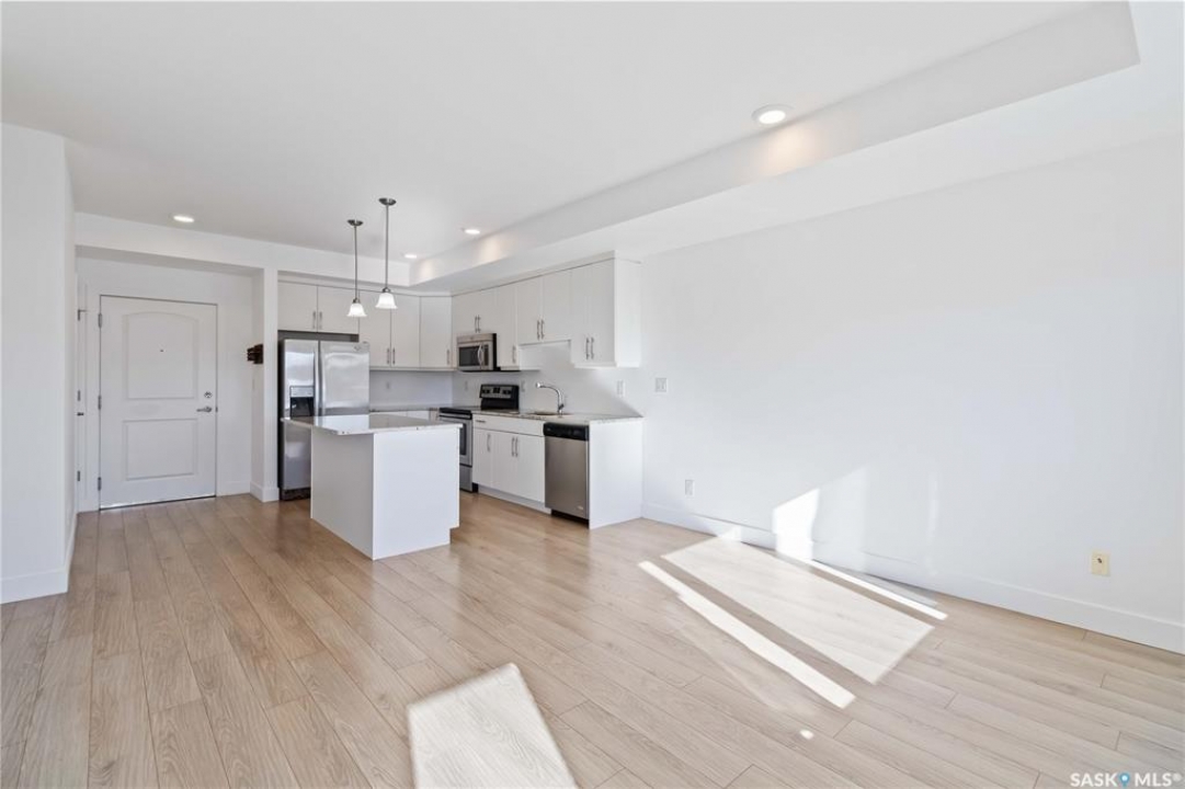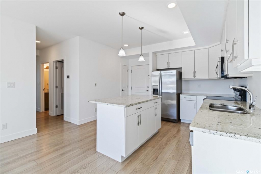 Welcome to modern and convenient living at 770 Childers Crescent in the vibrant community of Kensington! This 936 sq/ft apartment-style condo is designed for comfort and ease. As you step inside, you'll be greeted by an open and bright living area featuring large windows and durable vinyl plank flooring. The impressive kitchen is the heart of the home, offering sleek quartz countertops, a full set of stainless steel appliances, ample storage, and a large island with an eat-up bar that's perfect for entertaining. Step out onto the generous-sized balcony to enjoy your private outdoor space. This unit is equipped with essential comforts, including in-suite laundry, central air conditioning, and efficient forced-air heating. Forget scraping windows in the winter—this property includes a parking stall in the secure, heated underground parkade with convenient elevator access directly to your floor. Located just a short walk from all the amenities Kensington has to offer, including groceries, restaurants, banks, and parks, and with quick access to major city routes, this location is second to none. This condo offers the perfect blend of style, function, and location. Contact your real estate agent to schedule a private viewing today!