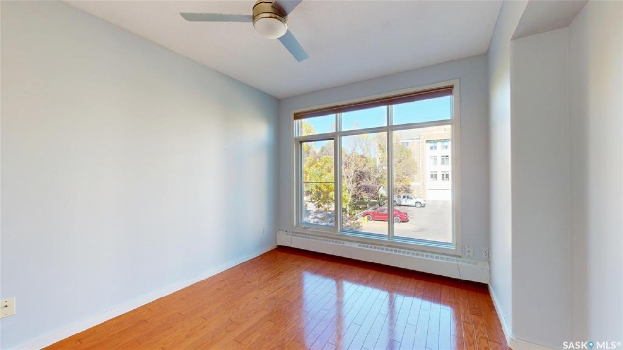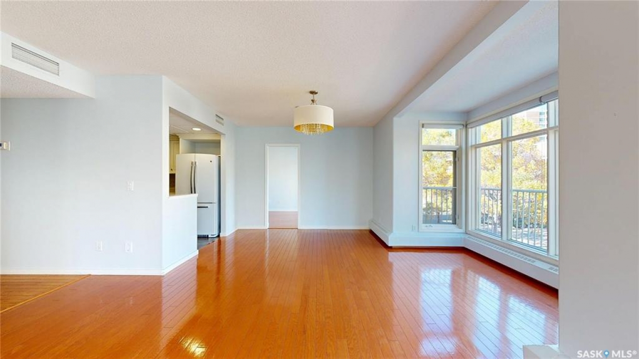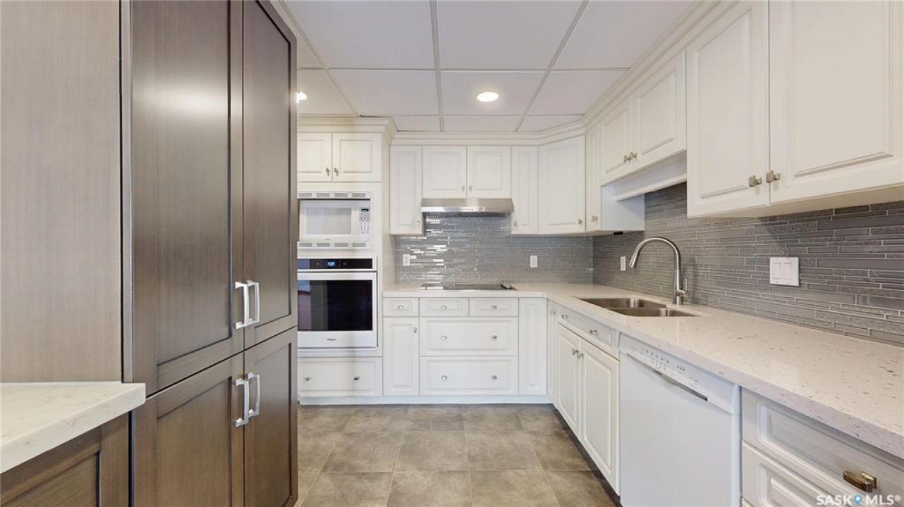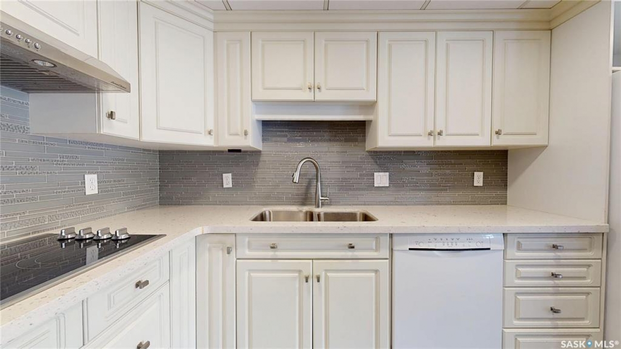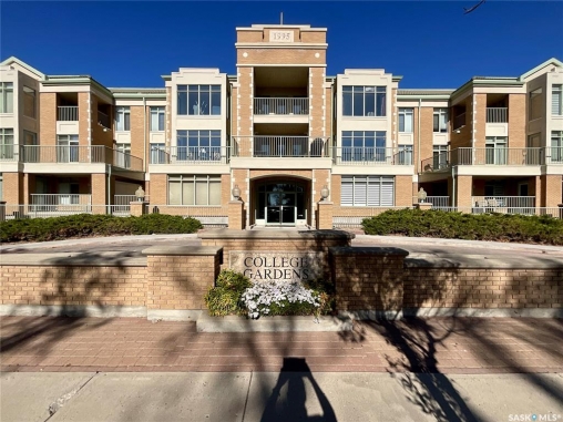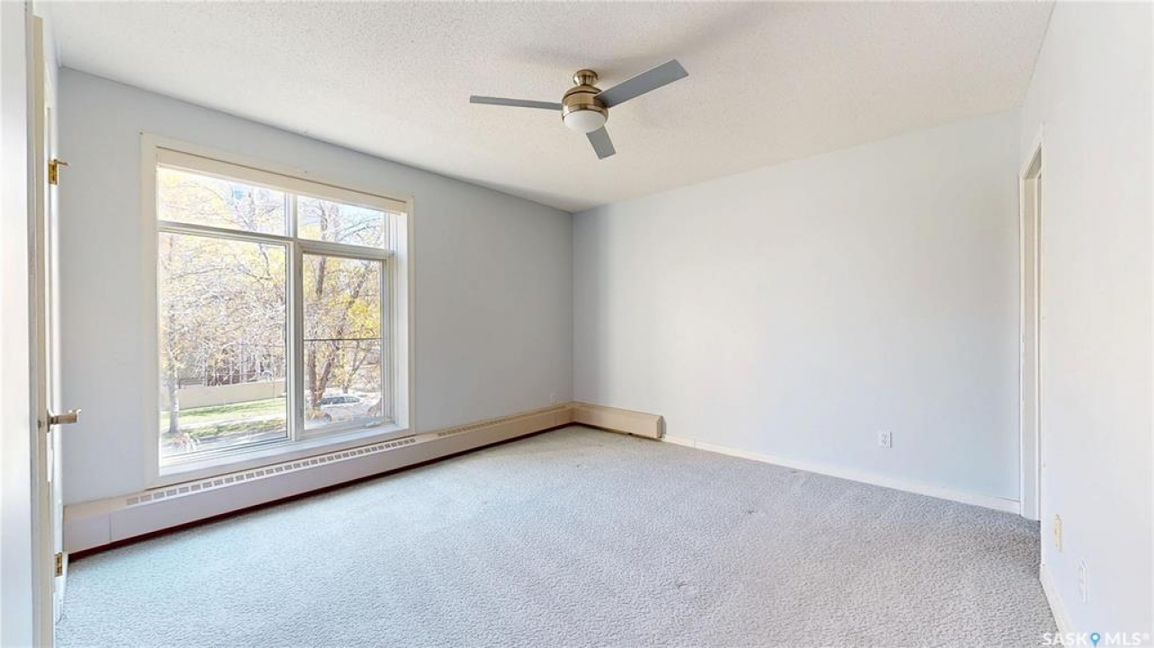 Experience the perfect blend of location and lifestyle in this sun-filled corner condo at prestigious College Gardens. Set directly across from Wascana Park, this concrete-core residence provides exceptional privacy, soundproofing, and peace of mind, with convenient access to downtown, the University of Regina, the airport and the natural beauty of Regina's most cherished park. This desirable corner unit features a wrap-around deck with north and east exposures—ideal for enjoying morning light. Inside, a spacious foyer welcomes you into a beautifully updated kitchen showcasing crisp white cabinetry, quartz countertops, a built-in oven, smooth cooktop, double sink, and coordinating white appliances. The open-concept living and dining areas are bright and inviting, framed by expansive windows that fill the home with natural light. The primary suite offers a private three-piece ensuite and a generous walk-in closet, while the second bedroom is conveniently located across from the four-piece main bathroom. Just off the dining area, a versatile room serves perfectly as a home office, craft space, or additional guest room—offering flexibility to suit your lifestyle. The in-suite laundry room, with storage, adds everyday practicality. Completing this exceptional home is plenty of visitor parking on the north side of the building and a heated underground parking space with a large private storage room—ideal for a small workspace or extra storage needs. With its solid construction, prime location, and timeless design, this impressive condo offers the rare opportunity to live in comfort and style just steps from Wascana Park. Enjoy the convenience of nearby downtown amenities, scenic walking paths, and all from the peaceful setting of College Gardens. A rare opportunity not to be missed—book your private showing today.