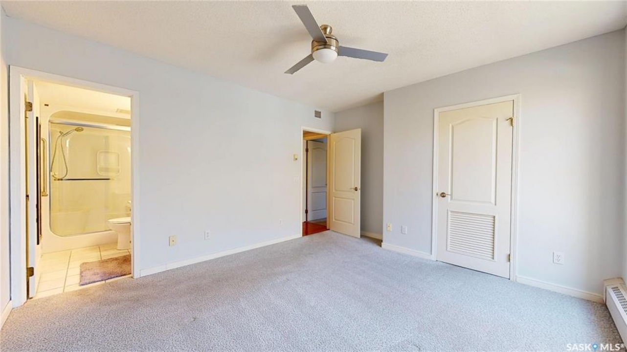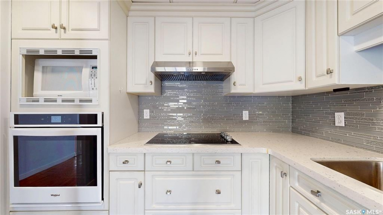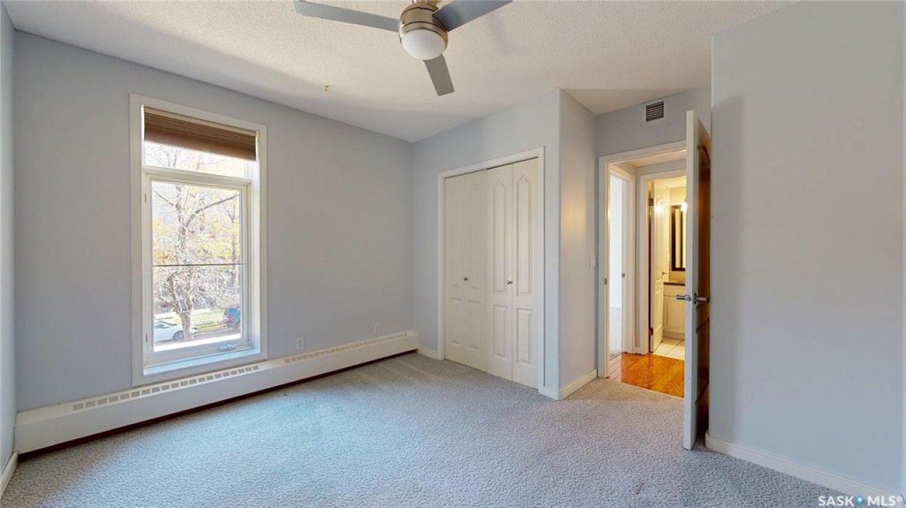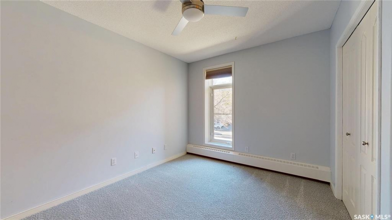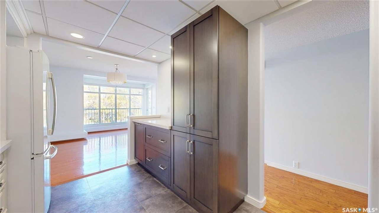 Experience the perfect blend of location and lifestyle in this sun-filled corner condo at prestigious College Gardens. Set directly across from Wascana Park, this concrete-core residence provides exceptional privacy, soundproofing, and peace of mind, with convenient access to downtown, the University of Regina, the airport and the natural beauty of Regina's most cherished park. This desirable corner unit features a wrap-around deck with north and east exposures—ideal for enjoying morning light. Inside, a spacious foyer welcomes you into a beautifully updated kitchen showcasing crisp white cabinetry, quartz countertops, a built-in oven, smooth cooktop, double sink, and coordinating white appliances. The open-concept living and dining areas are bright and inviting, framed by expansive windows that fill the home with natural light. The primary suite offers a private three-piece ensuite and a generous walk-in closet, while the second bedroom is conveniently located across from the four-piece main bathroom. Just off the dining area, a versatile room serves perfectly as a home office, craft space, or additional guest room—offering flexibility to suit your lifestyle. The in-suite laundry room, with storage, adds everyday practicality. Completing this exceptional home is plenty of visitor parking on the north side of the building and a heated underground parking space with a large private storage room—ideal for a small workspace or extra storage needs. With its solid construction, prime location, and timeless design, this impressive condo offers the rare opportunity to live in comfort and style just steps from Wascana Park. Enjoy the convenience of nearby downtown amenities, scenic walking paths, and all from the peaceful setting of College Gardens. A rare opportunity not to be missed—book your private showing today.