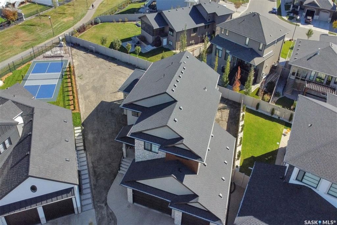 Welcome to 4244 Elderberry Crescent E, Where Luxury Meets Livability. Nestled in Regina's premier neighbourhood, The Creeks, this exceptional Gilroy-built home blends contemporary elegance with practical design. From the moment you turn onto the quiet crescent, you'll feel right at home. Sitting on a massive 11,000+ sq. ft. pie-shaped, park-view lot, this property offers endless potential to create your dream outdoor space. The acrylic stucco and stone-accented exterior paired with a grand entryway set an impressive tone from the moment of arrival. Step inside to a breathtaking two-storey foyer that opens into a spacious family room, complete with a full feature presentation wall. The chef's kitchen is a true showstopper, featuring a large eat-up island, abundant drawer storage, upgraded Chef's style appliances, and a walk-in pantry built for organization and convenience. A stylish 2pc bath, mudroom, and laundry area round out the main floor. The triple attached heated garage offers ample room for parking, projects, entertainment, and storage. Upstairs, unwind in the oversized bonus room overlooking the foyer or get productive in the dedicated office (or optional 4th bedroom). Two generously sized secondary bedrooms each feature their own walk-in closets. The primary suite is a private retreat, showcasing impressive square footage outfitted in plush carpeting, a spa-inspired ensuite with dual sinks, a deep soaker tub, and a custom-tiled shower, plus direct access to a beautifully designed walk-in closet. The newly finished basement adds even more living space, including a sprawling rec room, nook or workout area, a full bathroom, and a fifth bedroom ideal for guests or a growing family. To top it all off, enjoy year-round relaxation in the 4 season heated sunroom, complete with a hot tub, the perfect spot for entertaining or unwinding after a long day. 4244 Elderberry Crescent E is more than a home, it's a statement of quality, comfort, and modern luxury.