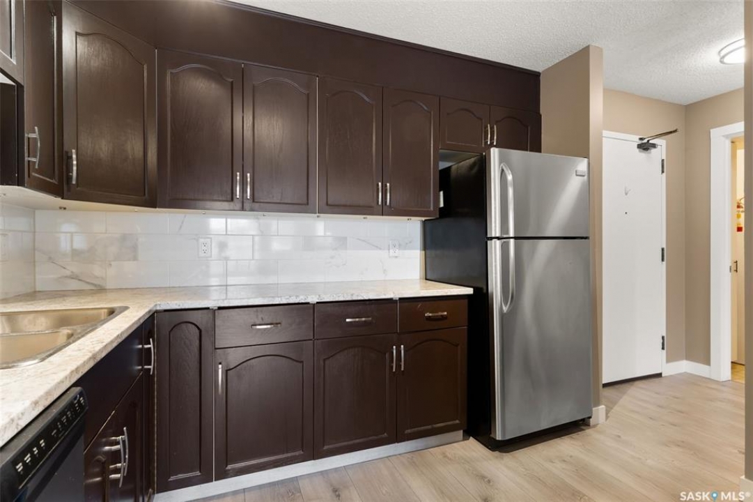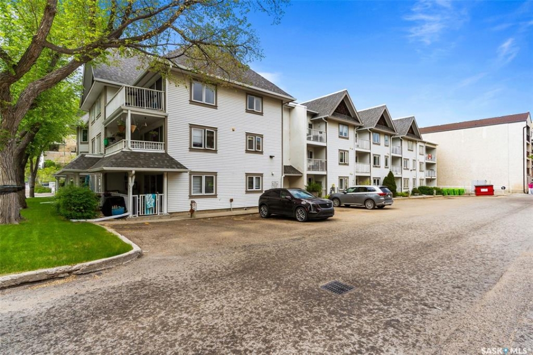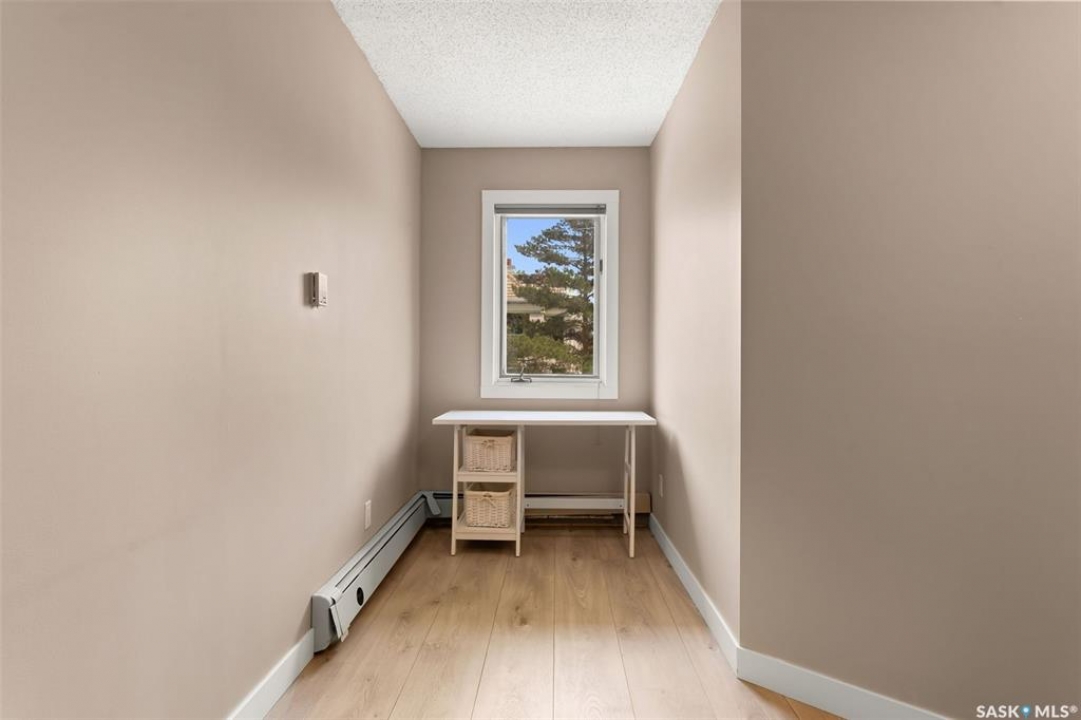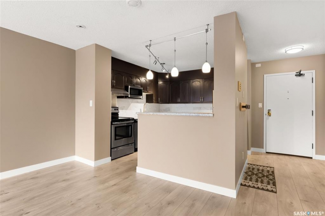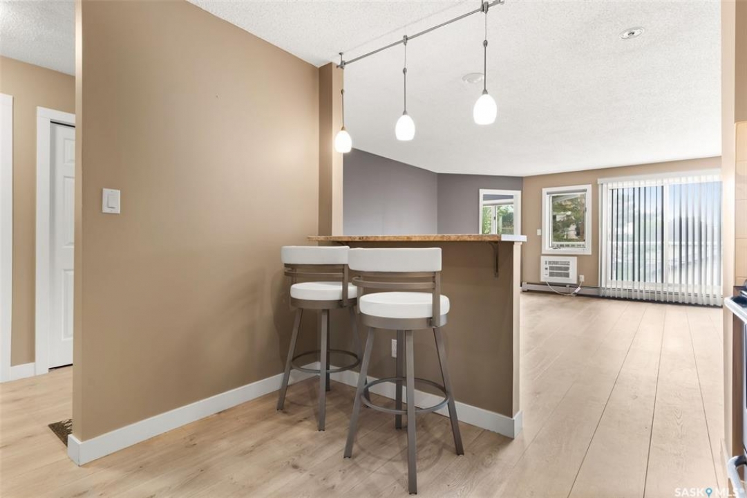Welcome to this beautifully maintained, top-floor condo offering 893 sq ft of stylish, open-concept living in a prime downtown location. Perfectly positioned within walking distance to shops, pubs, parks, and essential amenities, this home combines convenience with contemporary comfort. Step inside to find a renovated interior featuring painted kitchen cabinets, updated countertops and backsplash, and modern laminate flooring that flows seamlessly throughout. The open-concept layout is bright and airy, enhanced by stainless steel appliances, in-suite laundry, and plenty of natural light. This unit features a spacious primary bedroom with a cozy nook — ideal for a reading area or home office — and a versatile den with a window, perfectly suited as a guest room or second bedroom (note: no closet). Enjoy morning coffee or evening wine on your private balcony, and take advantage of the heated underground parking, dedicated storage unit, and secure building amenities. Whether you're a first-time buyer, downsizer, or investor, this condo delivers unbeatable value, style, and location. Don't miss your chance to own a top-floor unit in the heart of it all!