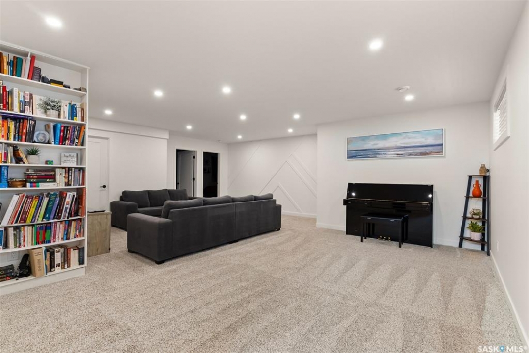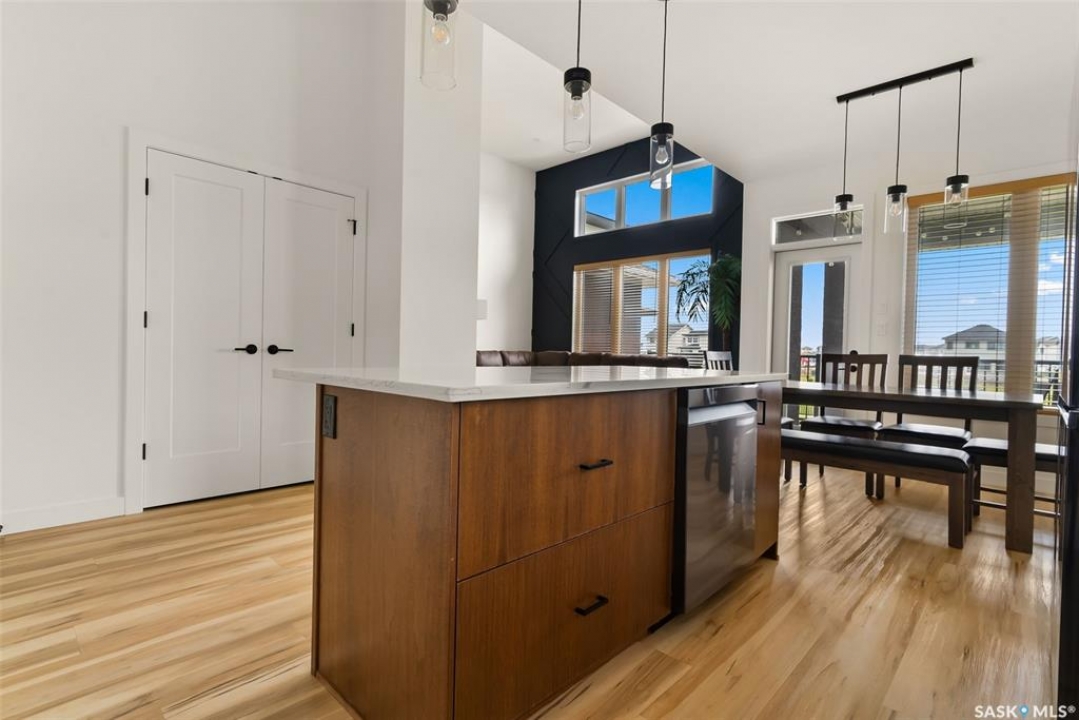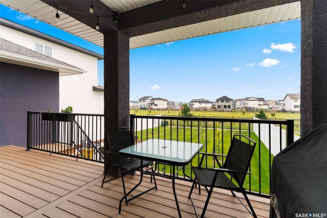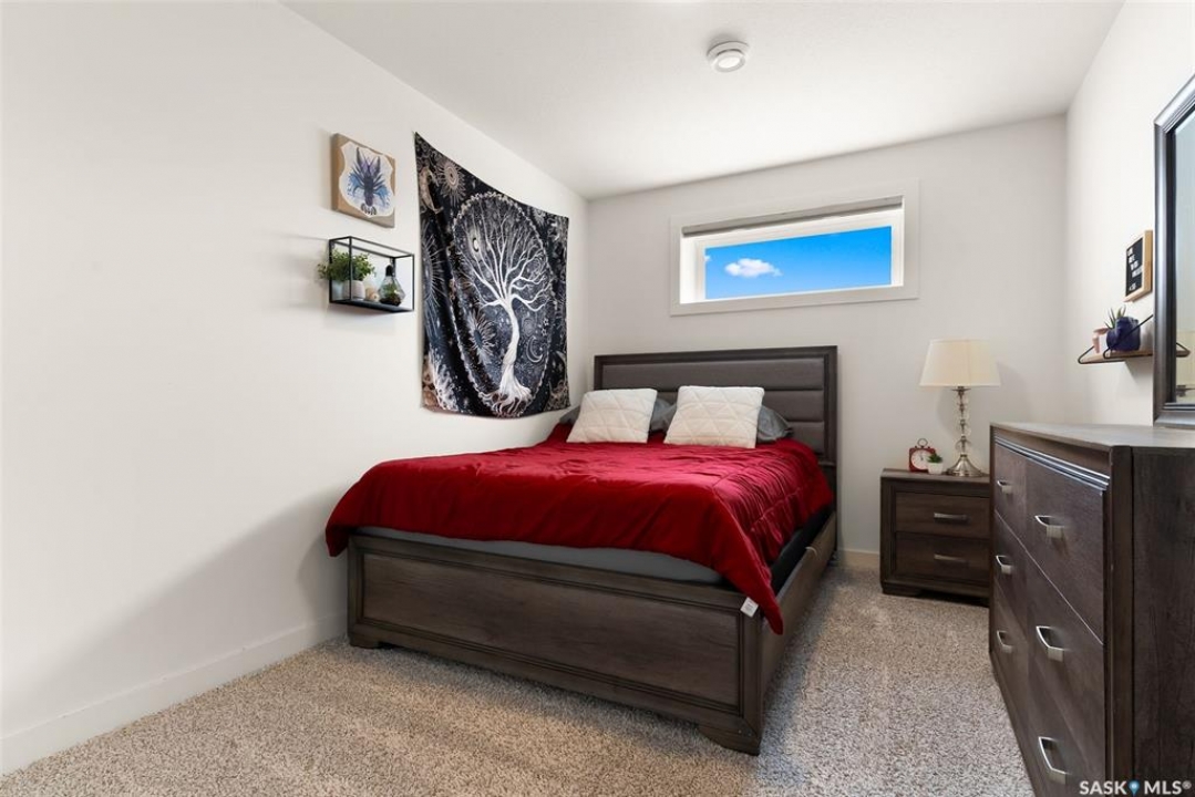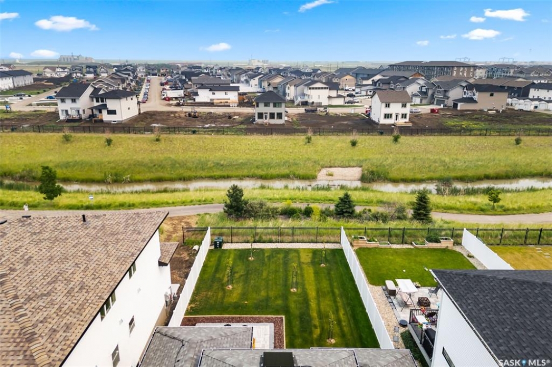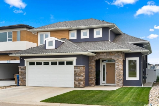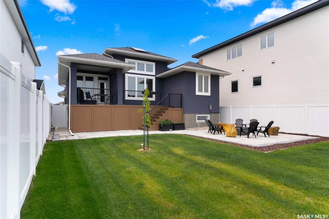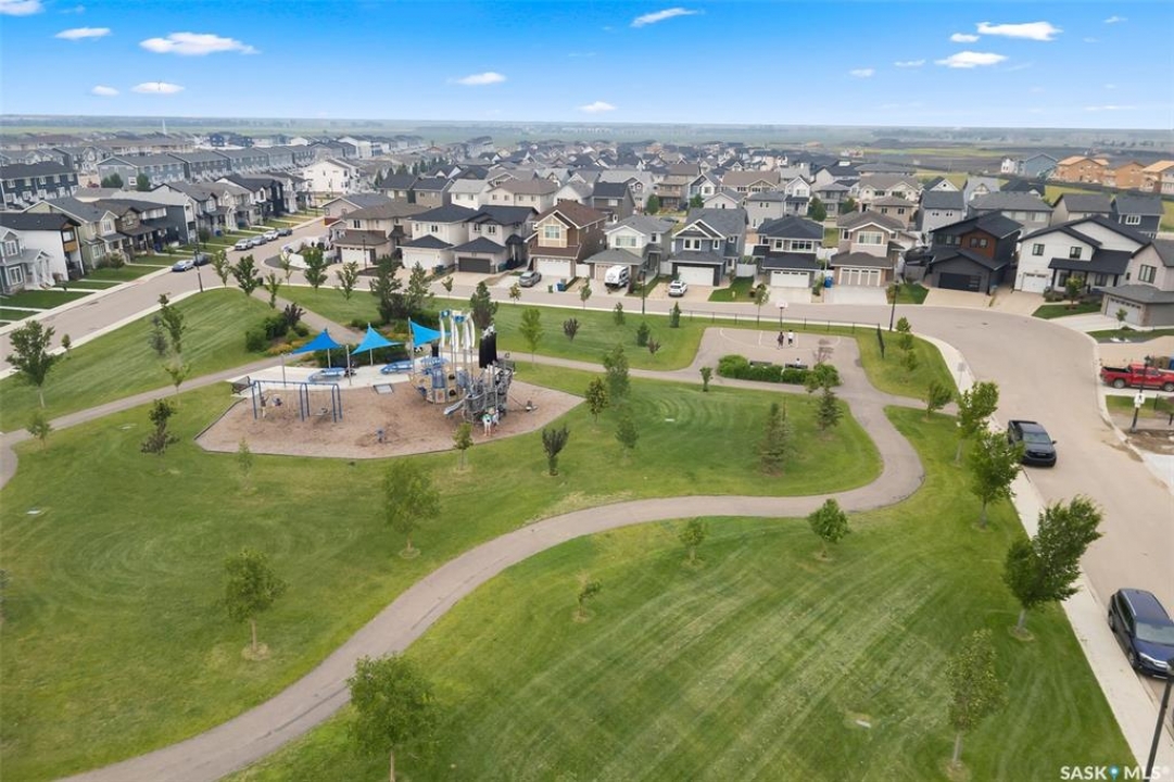 It's not every day you find a home that backs green space and fronts a park — but this one does! Located on a quiet cul-de-sac across from the Crosbie “Pirate” Park, this custom-built bi-level has no backyard neighbours and incredible curb appeal. The dark acrylic stucco, stone accents, and covered front entry create a welcoming first impression. Step inside to the spacious foyer with direct access to your heated double garage. The open-concept main floor feels bright and inviting. The two-toned kitchen features tall cabinets, quartz countertops, stainless steel appliances, and a walk-in pantry for extra storage. The living room has impressive high ceilings and a wall of windows that let the light pour in. Gather around the cozy gas fireplace or enjoy dinner with a view from the dining area that leads to your back deck and yard. Two bedrooms, a 4-piece bath, and laundry are conveniently located on this level. Upstairs, the private primary suite is your retreat with a large walk-in closet, dual vanities, and a beautiful ensuite. The fully finished basement offers plenty of space to relax or entertain with a family room, games area, and a built-in bookshelf for books or décor. The fun under-stair nook makes a great kids' hideaway, and the fourth bedroom is perfect for guests, teens, or a home office. A full bathroom completes the lower level. Outside, enjoy your partially covered composite deck with storage underneath, a fully fenced yard, and a firepit for cozy evenings. The solar panels are so efficient that you'll only pay SaskPower's minimum monthly fee. With schools and Starbucks just a short walk away, this home truly has it all — location, style, and a touch of everyday magic.
