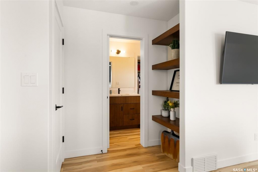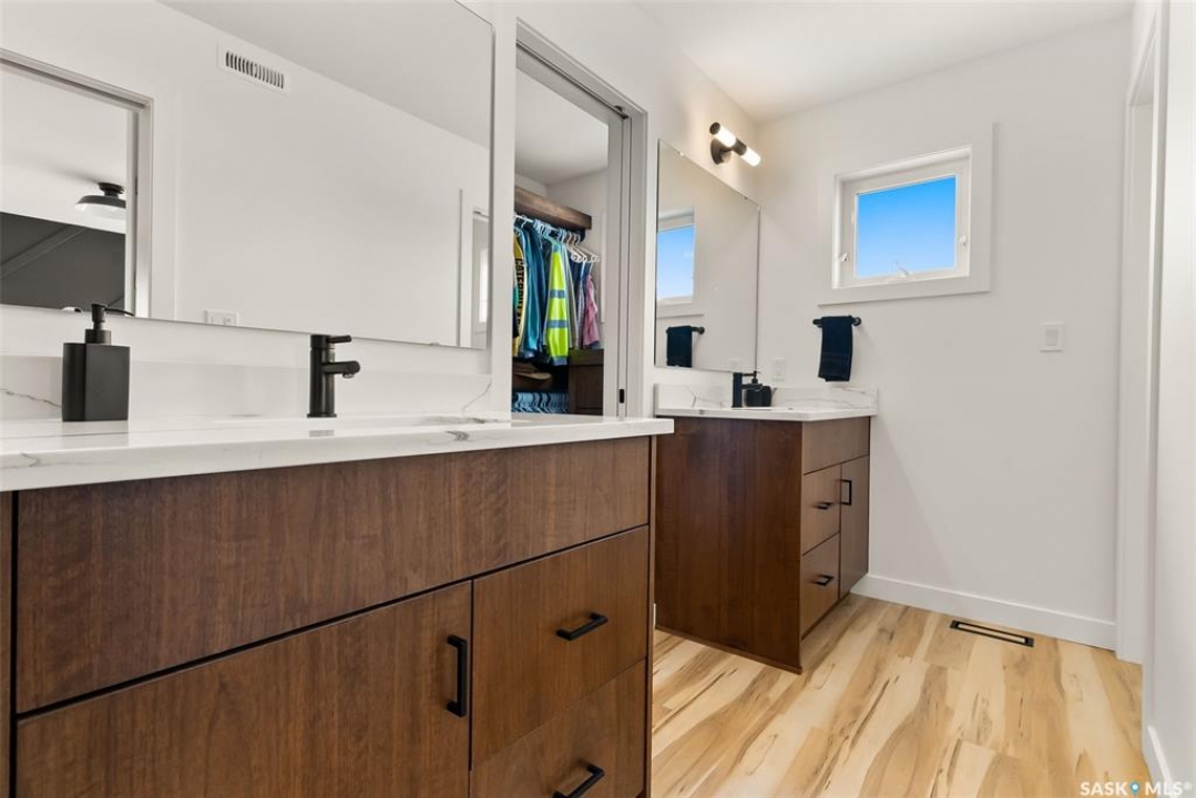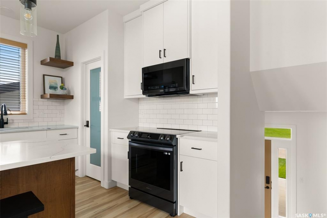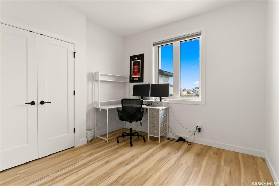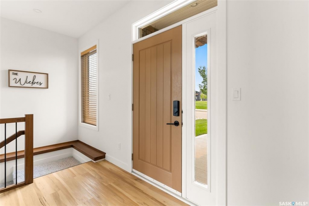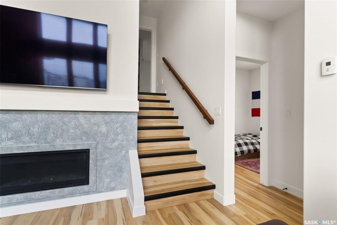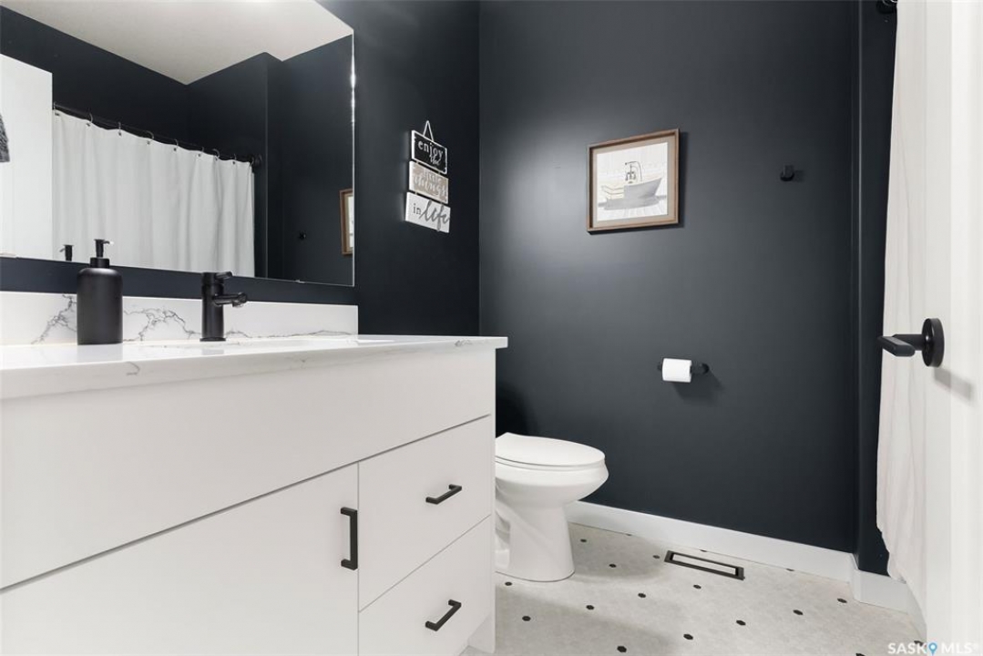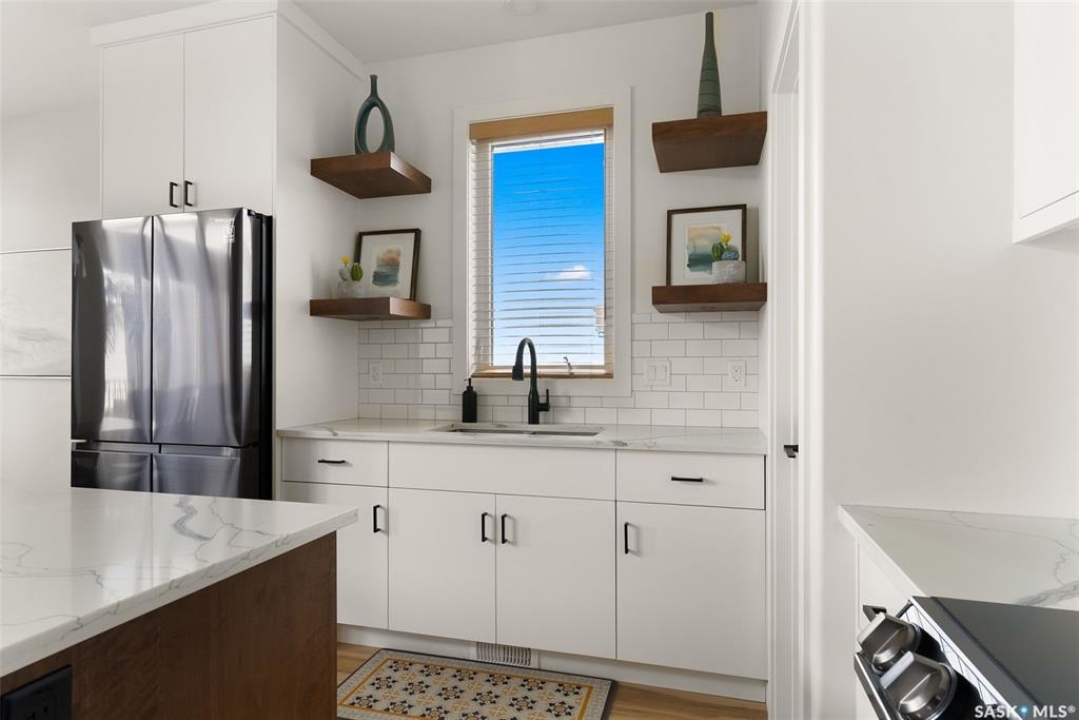 It's not every day you find a home that backs green space and fronts a park — but this one does! Located on a quiet cul-de-sac across from the Crosbie “Pirate” Park, this custom-built bi-level has no backyard neighbours and incredible curb appeal. The dark acrylic stucco, stone accents, and covered front entry create a welcoming first impression. Step inside to the spacious foyer with direct access to your heated double garage. The open-concept main floor feels bright and inviting. The two-toned kitchen features tall cabinets, quartz countertops, stainless steel appliances, and a walk-in pantry for extra storage. The living room has impressive high ceilings and a wall of windows that let the light pour in. Gather around the cozy gas fireplace or enjoy dinner with a view from the dining area that leads to your back deck and yard. Two bedrooms, a 4-piece bath, and laundry are conveniently located on this level. Upstairs, the private primary suite is your retreat with a large walk-in closet, dual vanities, and a beautiful ensuite. The fully finished basement offers plenty of space to relax or entertain with a family room, games area, and a built-in bookshelf for books or décor. The fun under-stair nook makes a great kids' hideaway, and the fourth bedroom is perfect for guests, teens, or a home office. A full bathroom completes the lower level. Outside, enjoy your partially covered composite deck with storage underneath, a fully fenced yard, and a firepit for cozy evenings. The solar panels are so efficient that you'll only pay SaskPower's minimum monthly fee. With schools and Starbucks just a short walk away, this home truly has it all — location, style, and a touch of everyday magic.