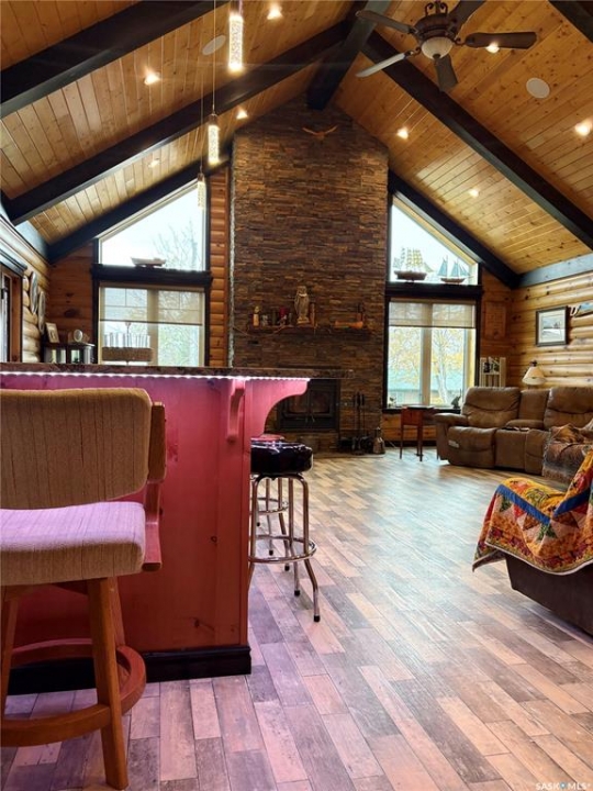 Welcome to 964 Whitesand Avenue at Burgis Beach, a stunning four-season home designed for comfort, entertaining, and lakeside living. Originally built in 2008 with a major addition in 2015, only steps away from the beach, this property offers a perfect mix of warmth, space, and functionality. Inside, you'll find in-floor heat, a forced-air propane furnace, and even a generator for peace of mind. The great room is a showstopper, featuring a natural wood-burning fireplace and a wet bar, the perfect setup for watching the game or hosting friends. Upstairs, there are two bedrooms and a luxurious 5-piece bathroom with a jet tub and tiled shower, plus a private patio overlooking the lake. The main floor offers plenty of space to gather, including a bright sunroom, a spacious kitchen with a large island and ample counter space, a 4-piece bathroom, a bedroom, and a convenient laundry area. The impressive L-shaped garage (35.5' x 24.3' with an extra 18.7' x 13.1' bay) features heated floors, a 3-piece bathroom, and loads of storage — ideal for vehicles, toys, and tools. Outside, you'll find three sheds, including one large enough to park a side-by-side or snowmobiles. The yard also boasts a beautiful fire pit area with hardwired lights along the path. Whether you're looking for a year-round home or a retreat to relax and entertain, 964 Whitesand Avenue delivers comfort, quality, and lake life at its best. (LED lights under bar - in pictures shows red - but changeable to your favorite team colors)