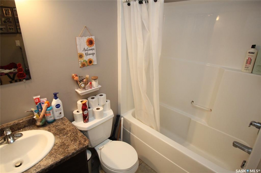Spacious open floor plan. Vaulted ceiling in the living, dining room and kitchen. Large kitchen with numerous cabinets and an island. Garden door off the dining area leads to a sunny south-facing 2-level deck. Primary bedroom has a walk-in closet and a 3-piece en-suite with a 4'6" walk-in shower. Access is also available to the deck from the primary bedroom. Second and third bedrooms are both a good size. Basement has large windows and is open for development. Cherry and Saskatoon Berry bushes at the back of the property. And, when you crave the Saskatoon amenities, it's a short 20-minute drive on a double divided highway. 10 minutes to Blackstrap Provincial Park where you can enjoy swimming, boating, fishing, camping and winter fun.