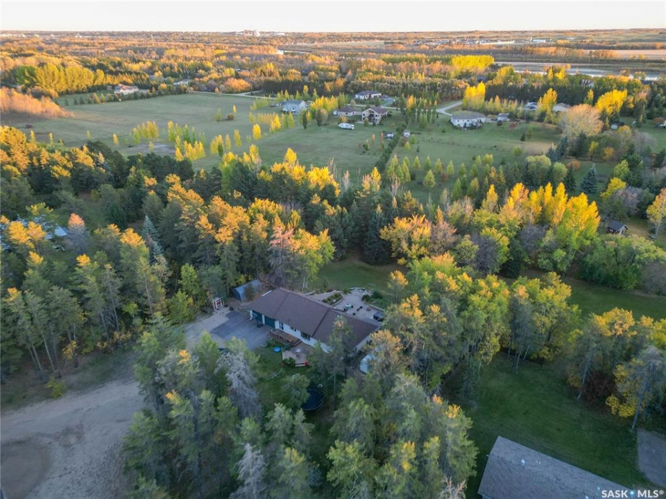 Immaculate 4 Bedroom + Den Acreage with Walkout Basement & Dream Garages only 5 Minutes from Prince Albert! This stunning and meticulously maintained 1,518 sq/ft bungalow offers the perfect blend of luxury, privacy, and convenience on a beautifully landscaped 2.47-acre lot. Built in 1994, this home features a spacious walkout basement, attached 26' x 28' double attached garage, and an incredible 24' x 48' heated detached triple garage complete with a carport and fully finished loft space above — ideal for hobbies, storage, or a home business. The main floor welcomes you with vaulted ceilings, hardwood flooring, and a cozy wood-burning fireplace with stone surround and built-ins in the bright south-facing living room. The kitchen offers an abundance of cabinetry and opens to the dining area. Three spacious bedrooms, a full bathroom, and a private ensuite in the primary which also has access to the deck and hot tub overlooking the breathtaking yard. The walkout basement is an entertainer's dream with a massive games room and family room featuring built-ins, cork flooring, and access to the covered patio. You'll also find a fourth bedroom, den, full bathroom, laundry, and plenty of storage space. Outside, the fully fenced and heavily treed property provides complete seclusion with green space, and manicured landscaping that must be seen to be appreciated. Additional features include central air conditioning, central vac, multiple sheds, and pavement right to your driveway. A one-of-a-kind property offering the best of acreage living with city convenience — truly impressive inside and out!