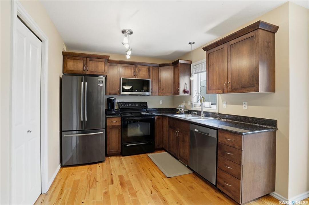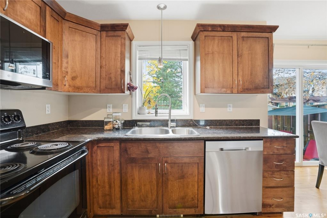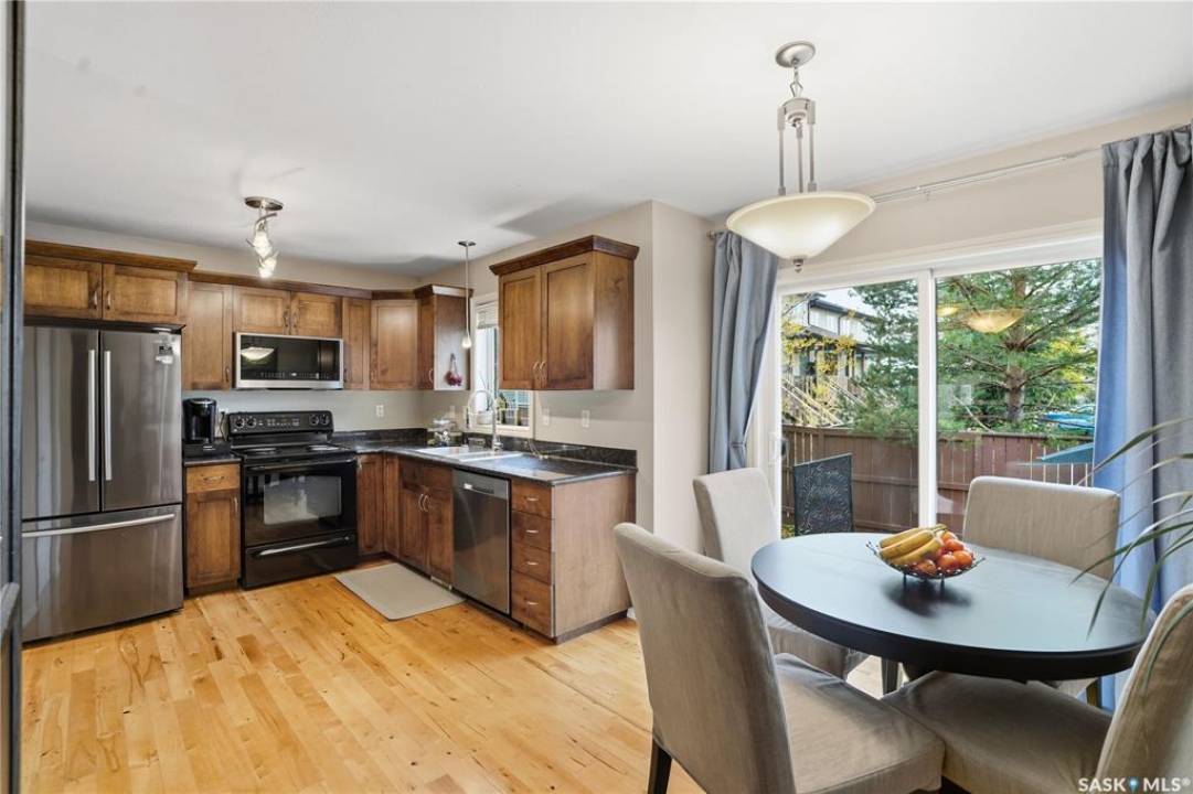 Located in the sought-after Pine Creek development in the Lakewood Suburban Centre, this immaculate 1,118 sq. ft. 2-storey townhouse offers comfort, convenience, and style. This desirable END UNIT has been beautifully decorated and features hardwood floors throughout the main with extra windows allowing for tons of natural light. With two dedicated parking stalls and visitor parking right out front, convenience is just steps from your front door. Upon entering, you're welcomed by abundant natural light and warm hardwood flooring that flows throughout the main living area. The spacious kitchen is equipped with granite countertops, maple cabinetry, a pantry, and appliances including fridge, stove, dishwasher, and over-the-range microwave. The open layout seamlessly connects to the dining area, which leads out to your backyard patio—perfect for enjoying morning coffee or evening BBQs. A convenient 2-piece bathroom completes the main floor. Upstairs, you'll find a generously sized primary bedroom, plus two additional well-sized bedrooms and a 4-piece bathroom, ideal for families or guests. The basement is completely finished with a family room, featuring finished laundry and plenty of storage. Additional features include: Central Air Conditioning and water heater 2 years old, dryer is 2 months old, microwave is 3 months old. Fantastic location close to grocery stores, parks, walking paths, 1/2 block to the Hyde park restaurants, and more!