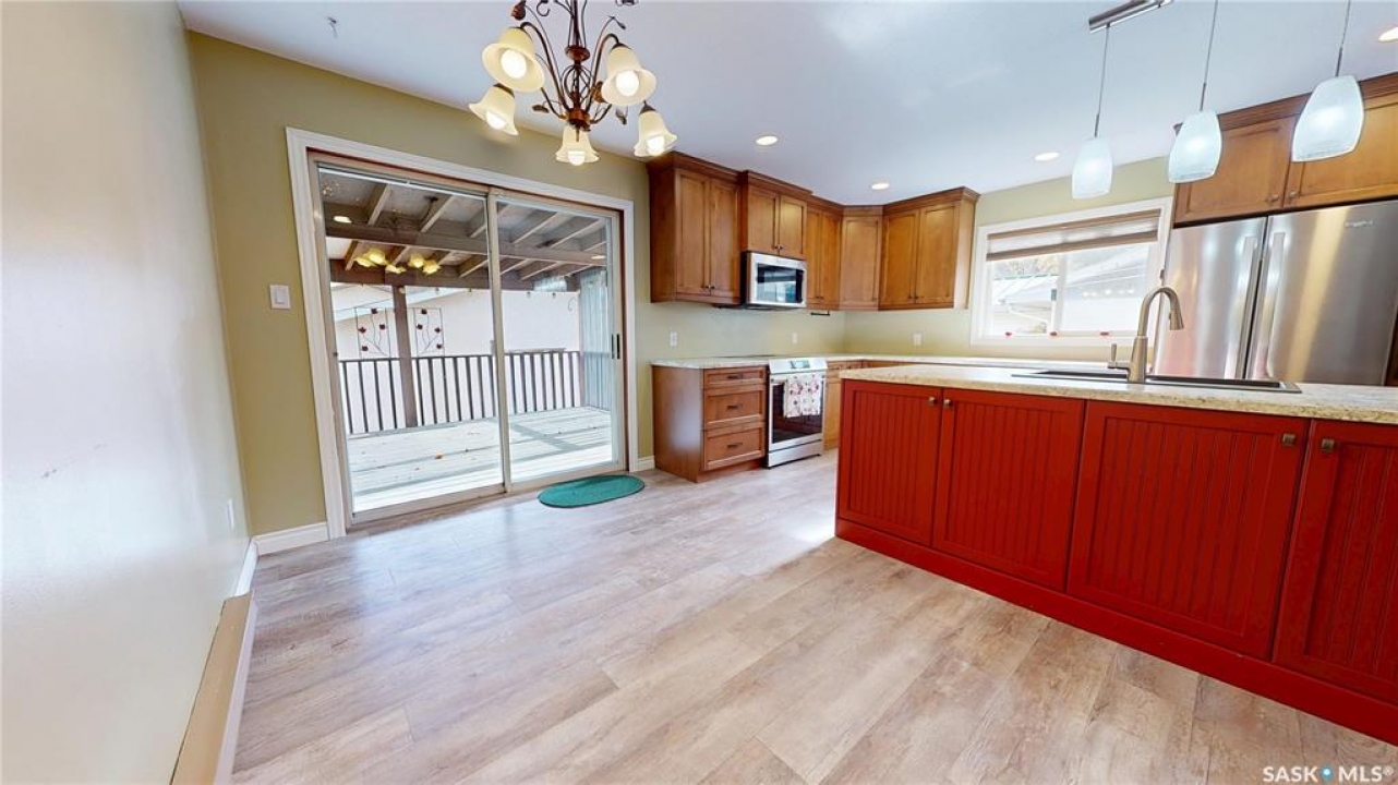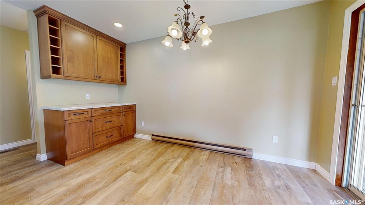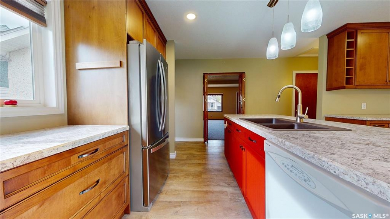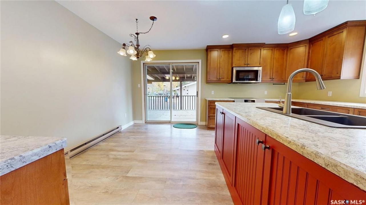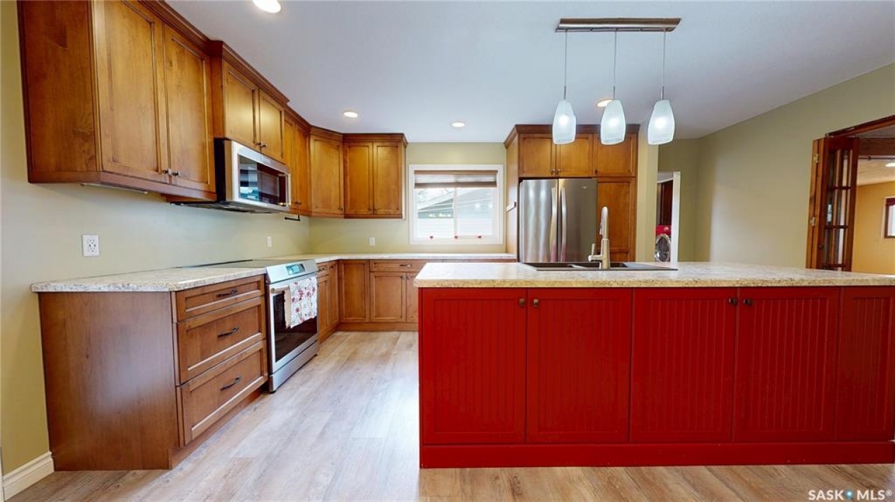 Priced to sell and available for quick possession, this home is an easy walk to Maple Creek's core shopping. This 2-bed 2-bath home has everything you need on one level. From the front entry you find a nice-sized living room and an adjacent den area that can be multi-functional as an office or easily converted into a 3rd bedroom. The rear of the home showcases a beautifully updated kitchen with a central island, sleek pot lighting, and modern appliances, complemented by a built-in display hutch. The dining area has glass doors leading out to the covered back deck, creating a feeling of spaciousness and would be a perfect spot for hosting friends and family. The Master bedroom easily can accommodate a king bed and has 3 pc ensuite. The 2nd bedroom is at the front of the home and beside the main 4 pc bath. The back entry porch has laundry with plenty of storage and high end side by side front load washer and dryer. The partial basement offers mechanical, good storage, and is large enough for development. This property also offers a double size detached garage with one side fully insulated, perfect for storage or use as a work shop/mancave. Exterior is stucco for minimal maintenance. Front c/c driveway, fenced back yard and extra gravel parking for more vehicles or RV. This home is a true gem at an affordable price. Don't miss your chance—call today and make it yours!