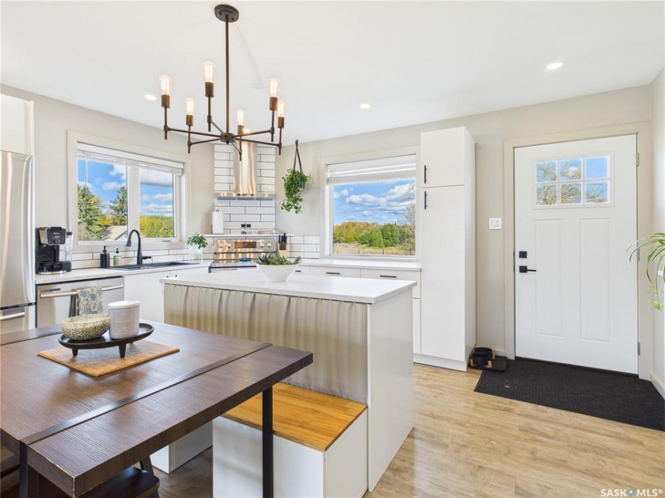 Welcome to MacDowall - the kind of place where neighbours wave, kids ride bikes till dusk, and life just feels a little slower in the best way. This freshly updated bungalow sits on a double lot and is ready for its next chapter. Inside you'll find 4 bedrooms and 2 bathrooms, with a bright, open-concept layout that's been thoughtfully refreshed. The kitchen is a total showstopper - flooded with natural light, full of storage, and designed for connection. The island bench even opens up for hidden storage and faces the dining area, making it the heart of the home. Throughout the main floor you'll love the newer vinyl plank flooring and fresh paint that gives the whole space a warm, modern feel. All the windows are newer, and the shingles are brand new, so you can move right in and enjoy with peace of mind. Step outside to enjoy your .26-acre double lot, complete with a new patio area perfect for firepit nights and summer hangs. The property has its own well for water with a septic-to-mound system, offering that small-town convenience with extra space and privacy. Whether you're starting out, downsizing, or raising a family, this home is a rare find in a truly special community. Just a short drive from Prince Albert, but it feels like a world away.