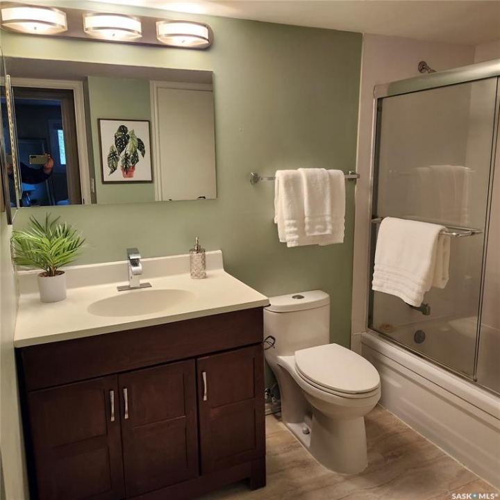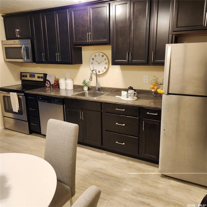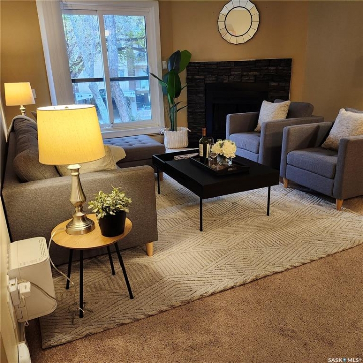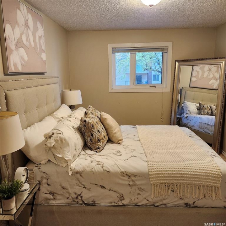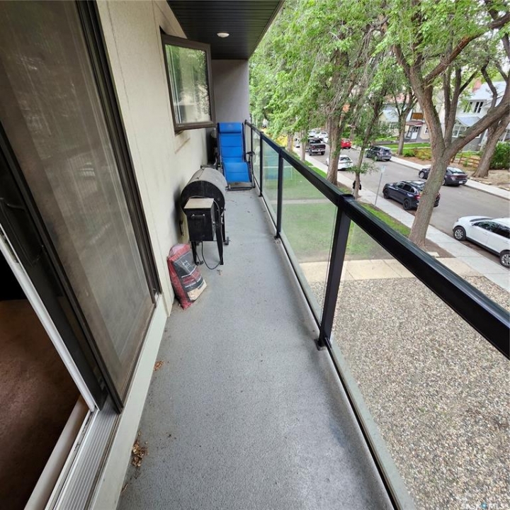 CITY PARK - - - Updated, spacious 2 bedroom condo in City Park walking distance to the river, U of S, and downtown. Renovations over the years include: newer kitchen with dark maple cabinets, countertops, vinyl plank flooring, sink, tap, & stainless steel appliances. Updated bathroom with newer vanity, taps, and tub surround. All newer trims & baseboards, paint, and lighting. Master bedroom with cheater ensuite & double closet. Ensuite laundry. Huge west facing balcony shaded by mature elm trees. One covered, electrified parking stall included. This spacious unit is in a superb City Park location. Great for U of S, AIRBNB, & downtown workers. Don't miss this one!