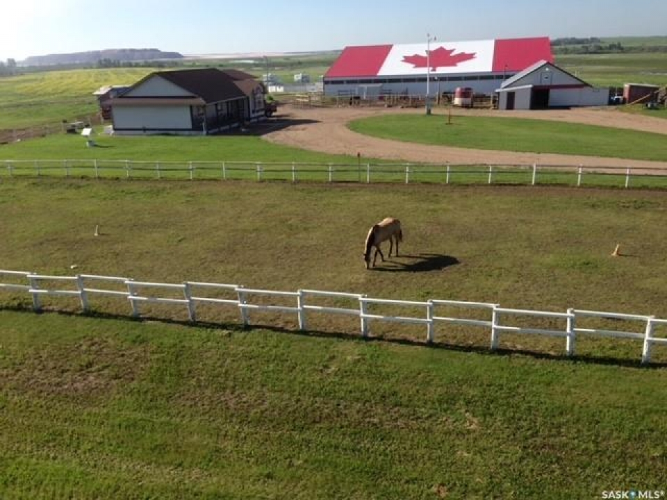 125 acres just minutes west of Saskatoon with 1365 sq.ft. bungalow built in 1994. 23 x 24 heated shop complete with 3 overhead doors, older barn full of box stalls and the true feature - a 120 x 80 like new indoor riding arena. Totall developed with multiple box stalls, tack room and upper level announcer booth. Mulitple outdoor pens with shelters and water hydrant. Note: This property has city water. Call today to book your personal viewing!Check out the youtube virtual tour @ https://youtu.be/Sg-wfBNaJrA .Call today for your personal viewing!
