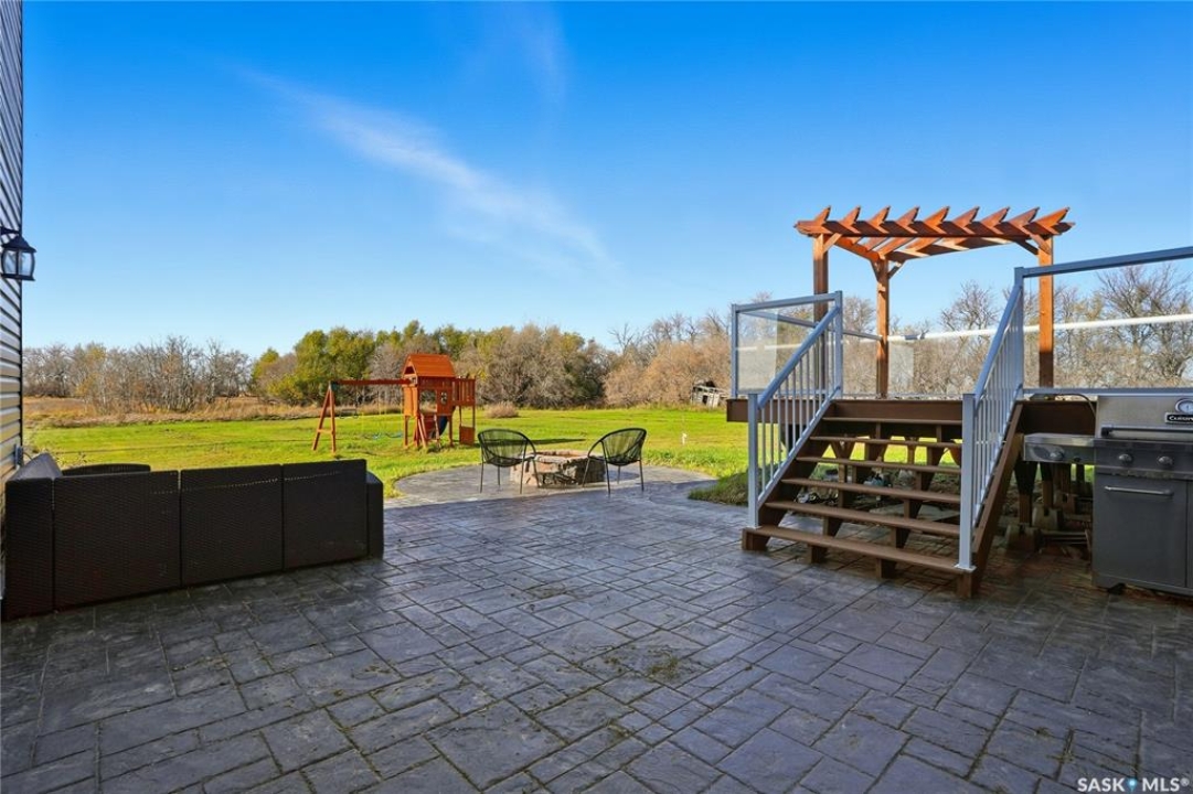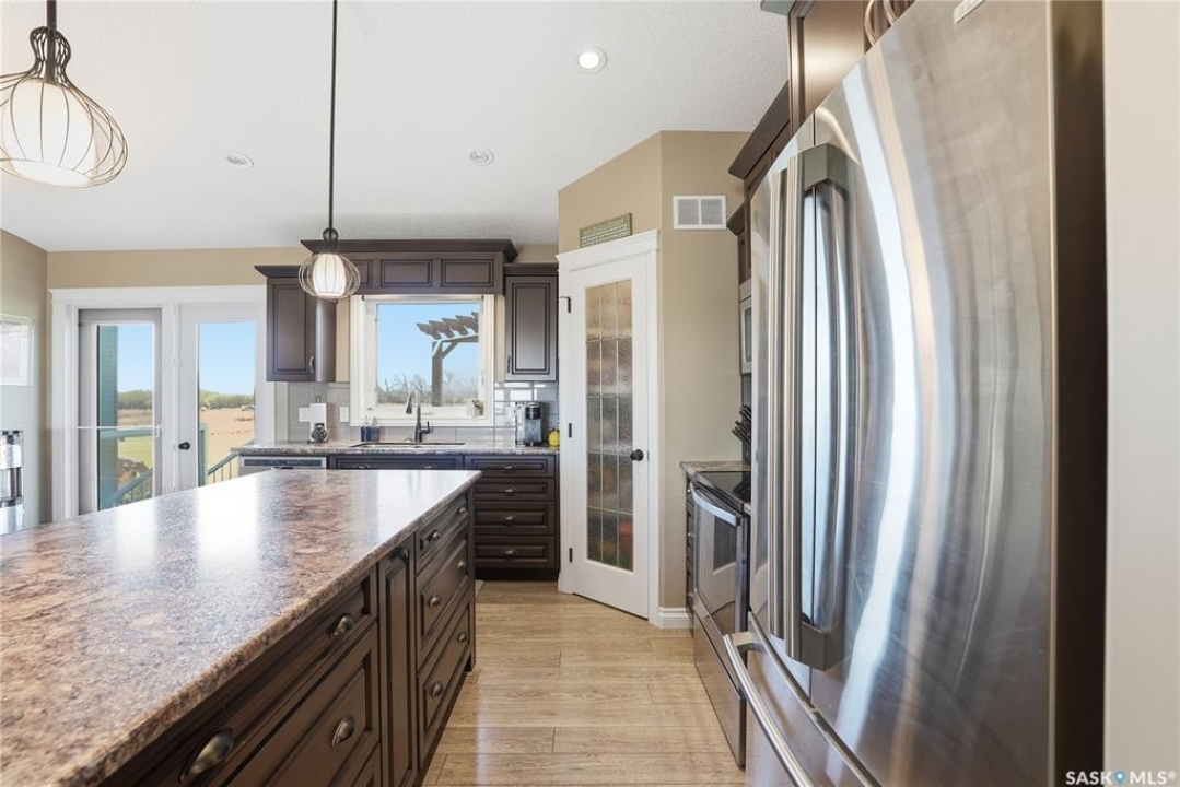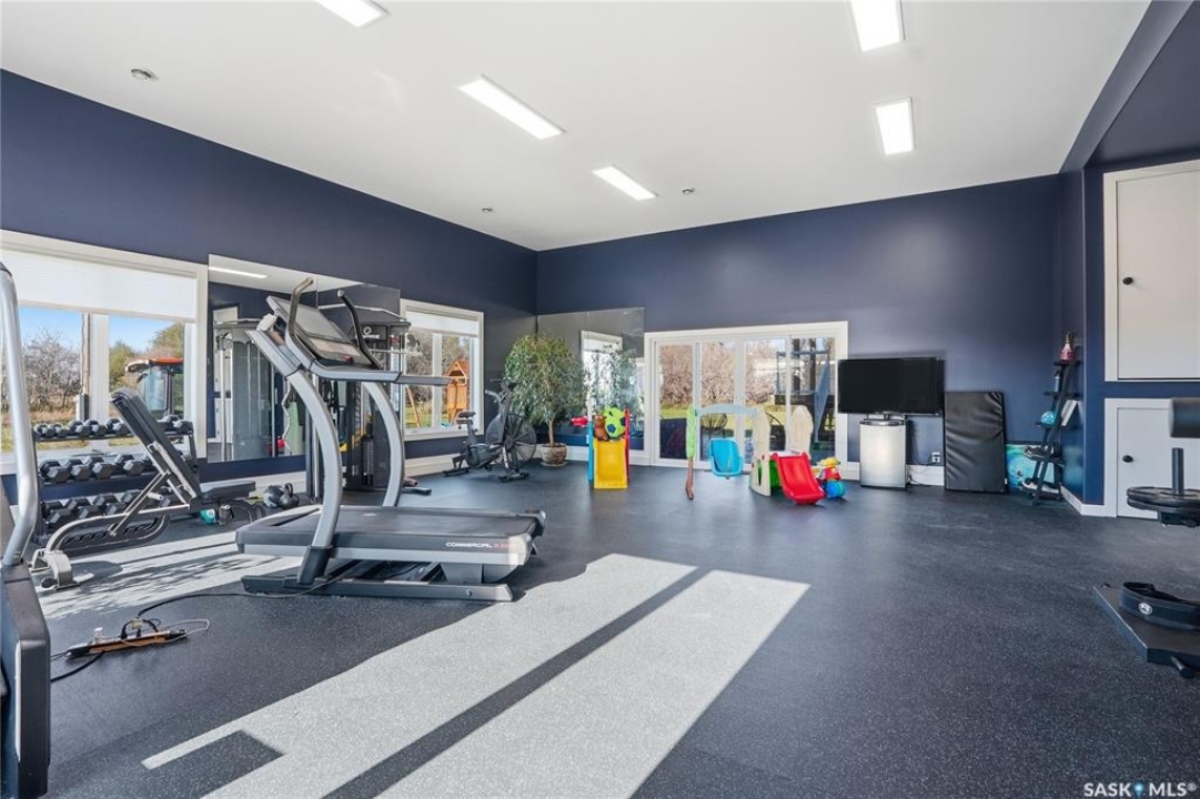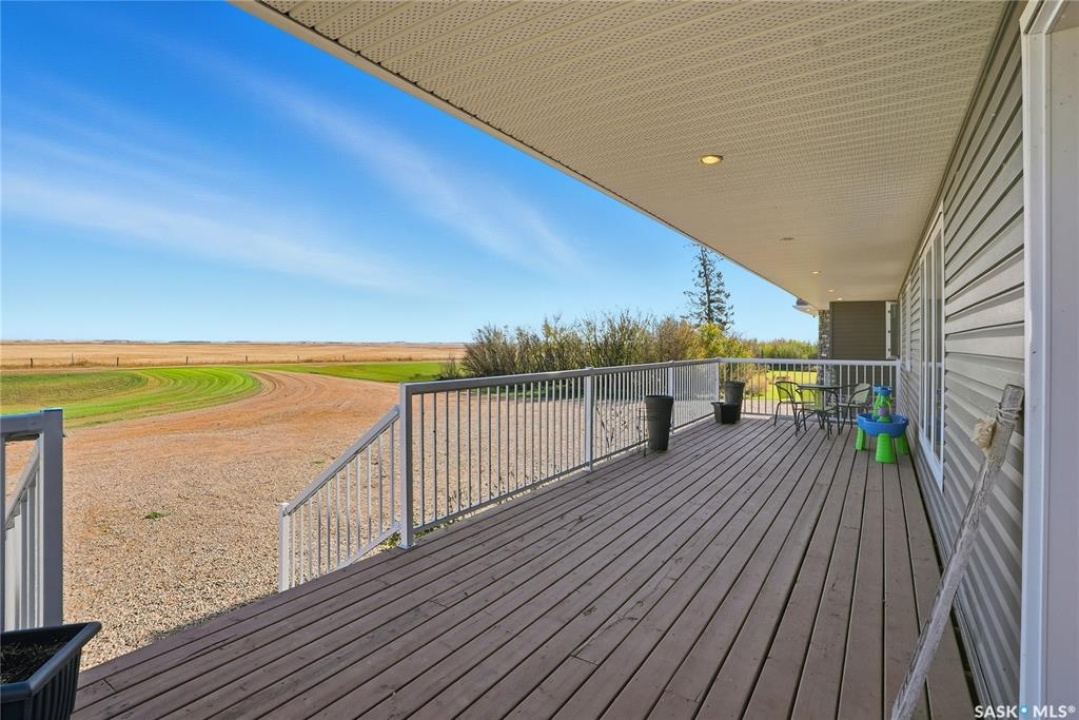 Located southeast of Saskatoon in the RM of Blucher, off Highway 16, along McConnel Road. This stunning 10-acre property offers the perfect blend of luxury and country living. Nestled among scenic farmland, the impressive 4,170 sq ft family home boasts 5 spacious bedrooms and a thoughtfully designed layout ideal for multi-generational living. Step into the grand front foyer, where sleek black tile flooring extends into the main floor laundry and bath. The open-concept main floor is bright and welcoming, featuring a chef-inspired kitchen with wooden cabinetry, tile backsplash, stainless steel appliances, a corner pantry, and a large island perfect for entertaining. Two main-floor bedrooms include one with a private ensuite, while a custom mudroom off the triple heated garage(31'x36') adds practical elegance with built-in shelving and bench storage. Upstairs, the loft showcases a striking glass railing, exposed beams, a cozy stone gas fireplace, and a wet bar complete with tile backsplash, Miele fridge, and dishwasher. The luxurious primary suite is a true retreat with vaulted ceilings, white paneling, a beautiful chandelier, and a spa-like ensuite, featuring white marble tile, quartz counters, double sinks, a glass-enclosed rain shower, heated floors and a corner Jacuzzi tub. The custom walk-in closet offers abundant built-in storage. The fully developed basement includes a large family room, a 4-piece bath with heated floors, two additional bedrooms, and a mechanical room with drip system, a/c, HRV. The 36' x 31' triple heated garage (12' ceilings) is complemented with a bonus space—a home gym or studio—with floor-to-ceiling windows and 12' ceilings. Perfect for fitness or yoga classes. Start the day with morning coffee on the east-facing deck off the kitchen and enjoy serene prairie sunsets from the west-facing back deck or on the stamped concrete patio roasting hotdogs and marshmallows. Call Today. Must be viewed to be truly appreciated.