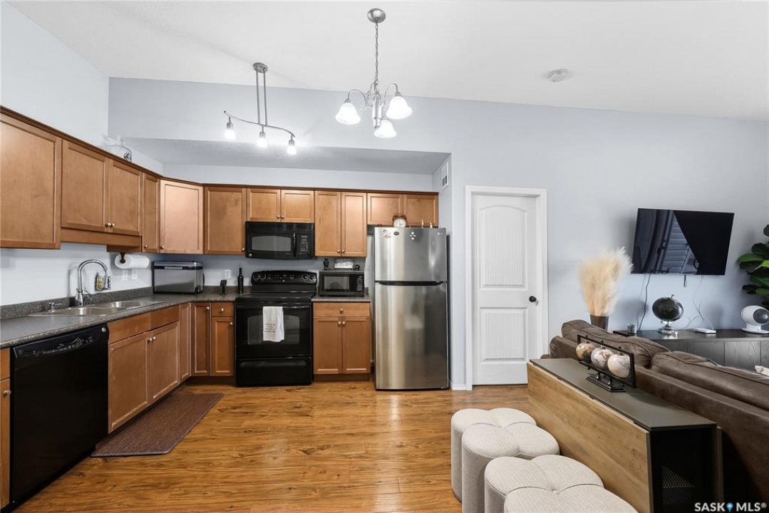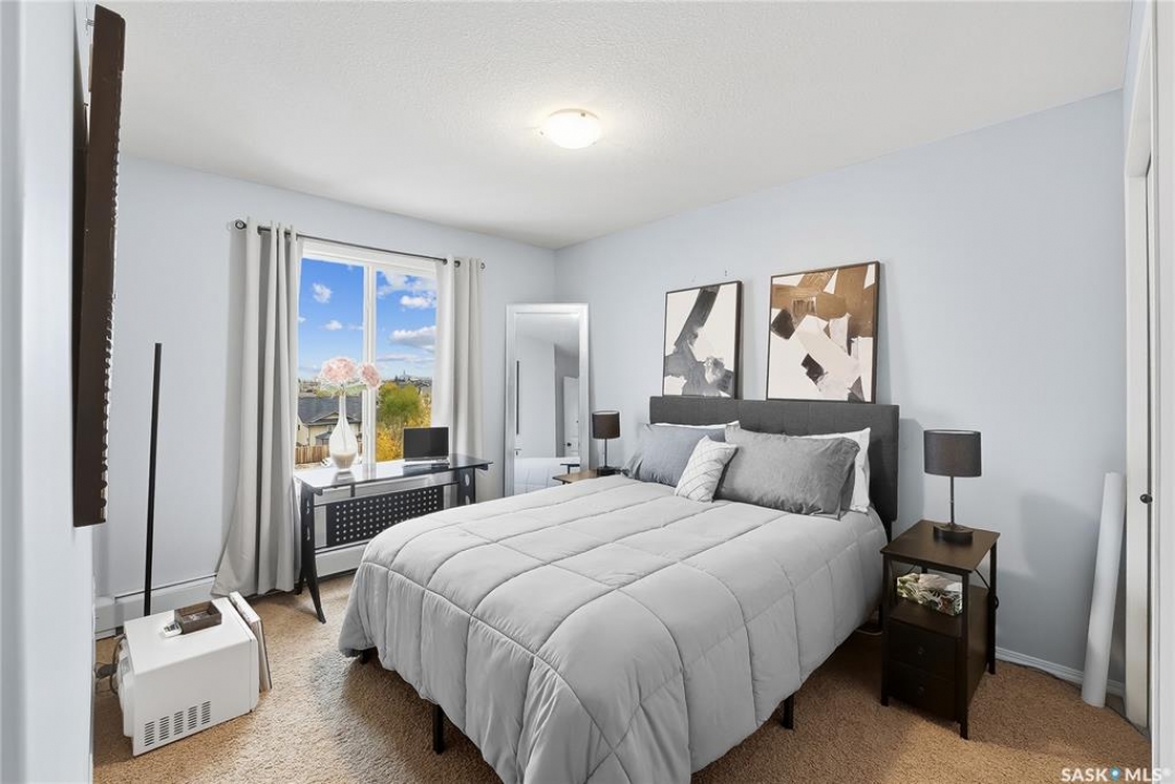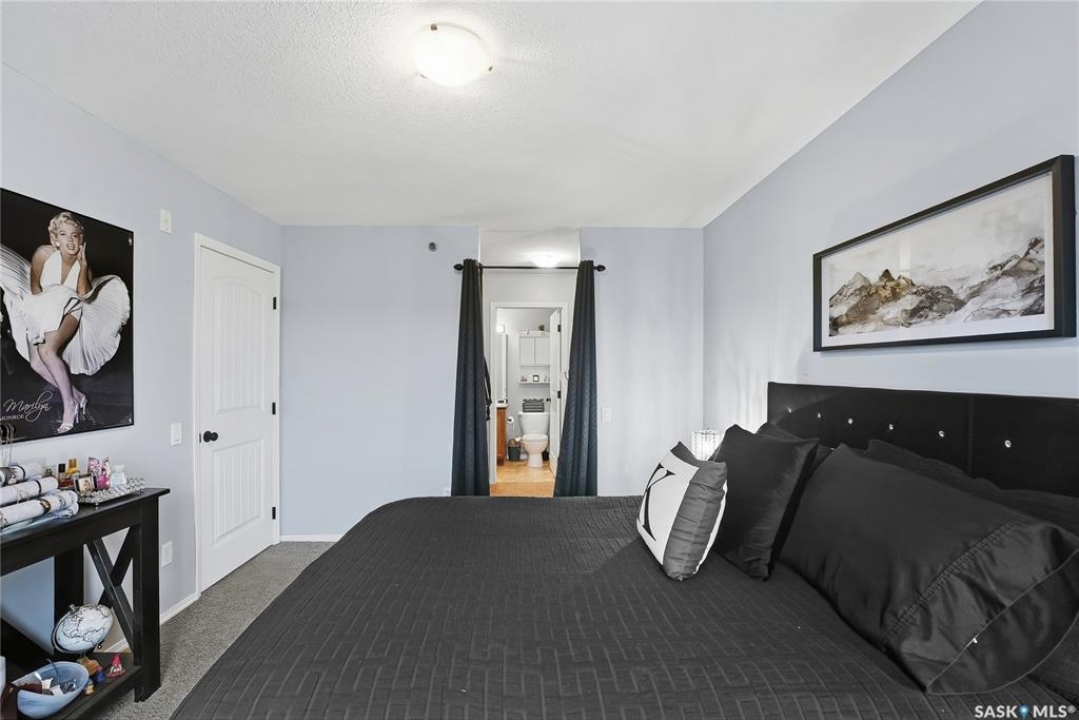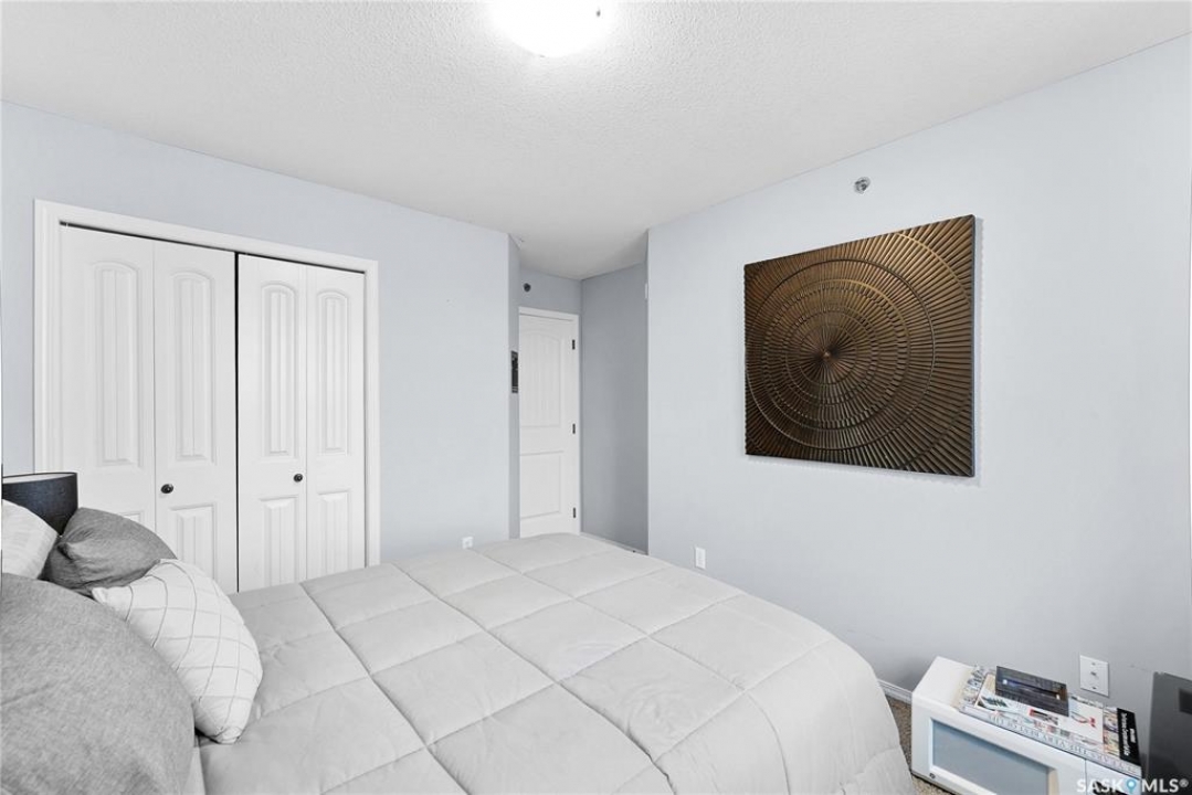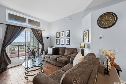 Welcome to The Lofts on Stockton—a well-managed condo in Lakeridge, steps to north-end shopping, parks, and transit. This bright 2 bed, 2 bath apartment offers 826 sq. ft. with soaring living-room ceiling lines, a transom window, and a garden door to your private balcony with skyline views. Thoughtful finishes include warm laminate floors in the main living areas, plush carpet in the bedrooms, and convenient in-suite laundry. The open kitchen provides excellent cabinet space and comes complete with the appliances. A wall A/C helps keep summers comfortable. The generous primary suite features a walk-through closet into a full 4-piece ensuite, while the second bedroom sits beside another full bath—perfect for guests, roommates, or a home office. Ownership is easy here: condo fees of $352/month include common & exterior building maintenance, heat, water, sewer, reserve fund, lawn care, snow removal, and garbage service. There is also a large storage room attached to the balcony. The unit sits on the 4th floor of the building, offering extra light and privacy. Whether you're a first-time buyer, downsizer, or investor, this move-in-ready condo delivers space, convenience, and value in a prime north-Regina location. NOTE: Fridge, Washer & Dryer were updated in 2025.