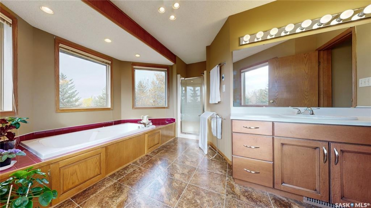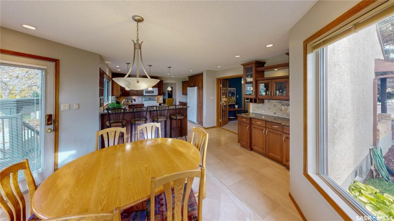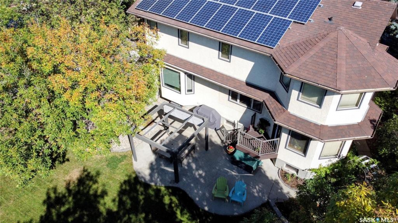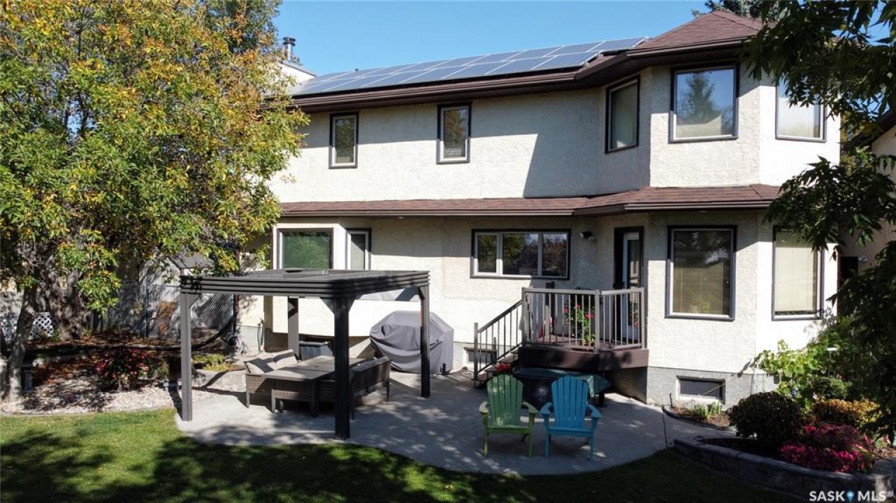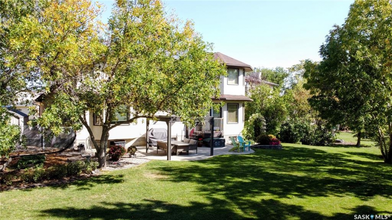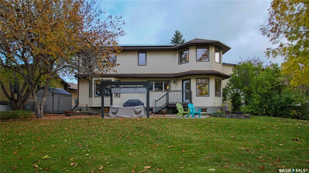 Welcome to 2631 Crocus Drive in the desirable Wood Meadows neighborhood close to WF Ready school and park, St. Marguerite School, and a short drive away from all the shopping amenities Regina's East End has. This original owner, 1991 built, 2588 square foot, 5 bedroom, 4 bathroom, 2 story house sits on a massive 8840 sqft irregular lot backing a walking path. The front yard has a lawn, pine tree, greenery and the double concrete driveway that leads to the 24'x24' double attached, insulated garage and covered front porch. There are 18 solar panels on the roof! The backyard has an endless lawn, trees and shrubs, a patio with an included pergola, a garden, a fenced area and a shed! You enter this home into the foyer that has a coat closet. Next is the family room. Walking through french doors you enter into the large dining room that is surrounded by large windows that overlook the beautiful green space. The updated kitchen is next with a window overlooking the back yard, cappuccino maple cabinets, granite counter tops and the included fridge, stove, microwave hood fan and built-in dishwasher are all included. Next is the living room with carpet flooring, a bay window, and a beautiful electric fireplace. The main floor is finished off with a 2pc bathroom, the door to the garage and a laundry room with a sink and cabinetry. Upstairs are 2 good sized bedrooms with ample closet space, the main 4pc bathroom with double sinks, another bedroom, and then the huge bonus room. The 2nd floor is completed with a large primary bedroom with a walk-in closet as well as a 4pc ensuite bathroom featuring a jet tub. The finished basement starts out with a large rec room, another large bedroom with a walk in closet and is finished off with a 3pc bathroom and the utility room that has 2 high efficiency furnaces (2015), the owned gas water heater (2024) and brand new water softener (2025). This house has also received updated windows throughout, and has central air conditioning!