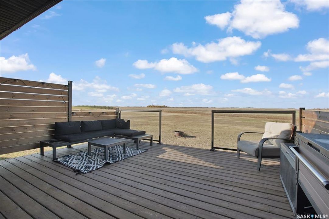 Sitina Estates is a hidden gem just minutes from Saskatoon, accessible via a double-lane highway. This 1880 sq ft bungalow is impeccably finished, featuring six bedrooms and three bathrooms. Located at the back of a cul-de-sac, the property offers exceptional curb appeal with a stucco and stone exterior and staggered garage doors on the triple-attached garage. The front door opens into a spacious tiled foyer with a striking two-sided gas fireplace, shared with the large living room, which is part of the open-concept main floor. The custom kitchen showcases quartz countertops with an island that includes bar seating, gloss-finish white cabinets, a built-in oven and microwave, a hood fan, and a gas range. A walk-through pantry provides easy access to the laundry/mudroom, which connects directly to the attached garage. The dining room is designed with large windows to maximize the natural views and provides access to a generously sized rear deck. Down the hallway, you'll find a four-piece bath and three bedrooms, including the primary suite, which boasts a walk-in closet and an ensuite with dual sinks, high-end fixtures, a Bain Ultra air tub, and a shower space awaiting your tile selection. The basement is nearly complete, with three additional bedrooms and a fully finished four-piece bath. The family room and den have exterior walls and electrical work already in place, leaving an opportunity for a handy buyer to add finishing touches. This quiet development, located just minutes from Saskatoon and the Vanscoy mine, offers the perfect balance of accessibility and the tranquility of acreage living with 2.6 acres to call your own. Call today for a private showing.