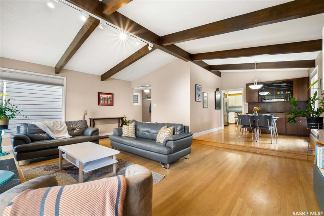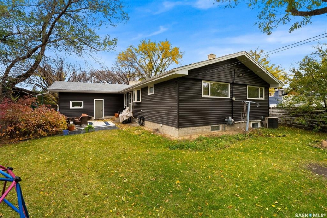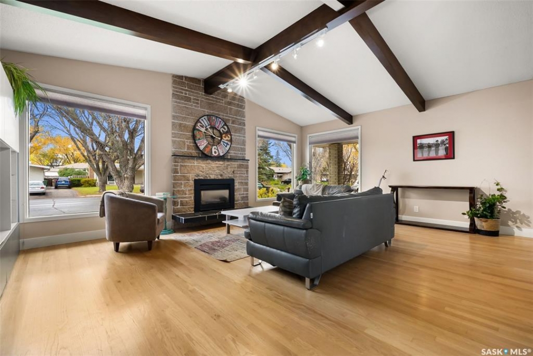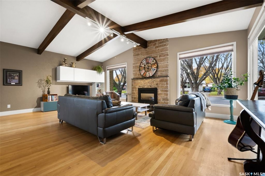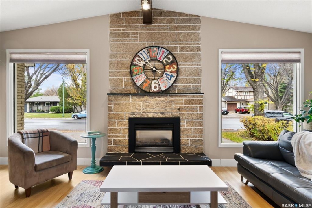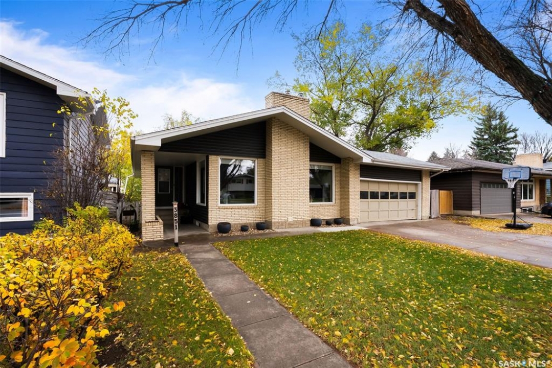 Welcome to 3851 Montague Street located in the desirable neighbourhood of Parliament Place, this 1,450 sq. ft. bungalow offers a perfect blend of mid-century charm and modern updates. Built in 1967, this spacious home features 4 bedrooms and 3 bathrooms. A large, welcoming front entryway leads into the stunning family room, showcasing vaulted ceilings, a cozy gas fireplace with Tyndall stone surround, and beautiful original hardwood flooring. A step up takes you to the dining room with a built-in china cabinet, ideal for family gatherings. The bright kitchen features white cabinetry, stainless steel appliances, and convenient access to both the side yard and the double attached garage. Down the hall, you'll find two bedrooms, a large main bathroom with double sinks, and a primary suite with its own private 2-piece bath. The lower level is fully developed, offering a spacious family room, gym area, updated 3-piece bathroom with tiled shower, fourth bedroom, den, and a large utility/laundry/storage room. Outside, enjoy a private and beautifully landscaped backyard with mature trees, an ideal space for relaxing or entertaining. The exterior has been updated with new vinyl siding that complements the original stonework, and the 20x20 insulated garage adds function and value. Recent updates include new vinyl flooring throughout the basement, some PVC windows and shingles.