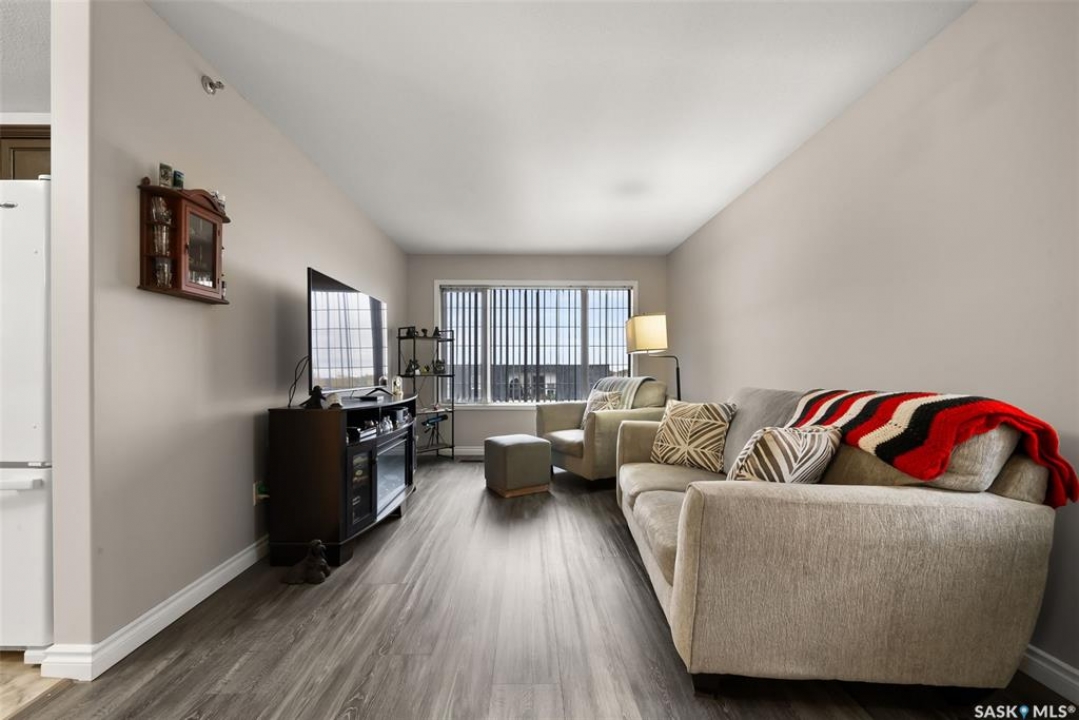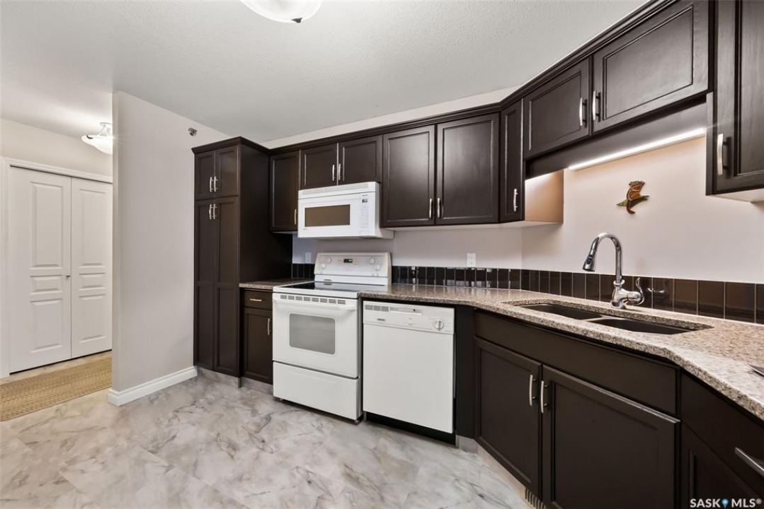 Welcome to this top floor corner unit condo located in the desirable Cityview neighbourhood. This building is backing green space and is located in a well established area, with easy access to all North end amenities, shopping and transportation. This 817 sq ft unit features 2 bedrooms and 1 bathroom, offering an open concept layout with southwest exposure and plenty of natural light. The upgraded kitchen includes rich cabinetry, a built-in pantry, granite countertops, and modern appliances. The floor plan allows for seamless flow into the bright dining and living area with direct balcony access. Additional highlights of this affordable unit include in-suite laundry with extra storage, central air conditioning, new flooring, built-in dishwasher, and a designated electrified parking stall. Condo fees cover: Common Area Maintenance, External Building Maintenance, Garbage, Insurance (Common), Lawncare, Reserve Fund, Sewer, Snow Removal, Water. Please note: pets are not permitted in this building. This clean and neat condo unit makes an exceptional choice for affordable home ownership!