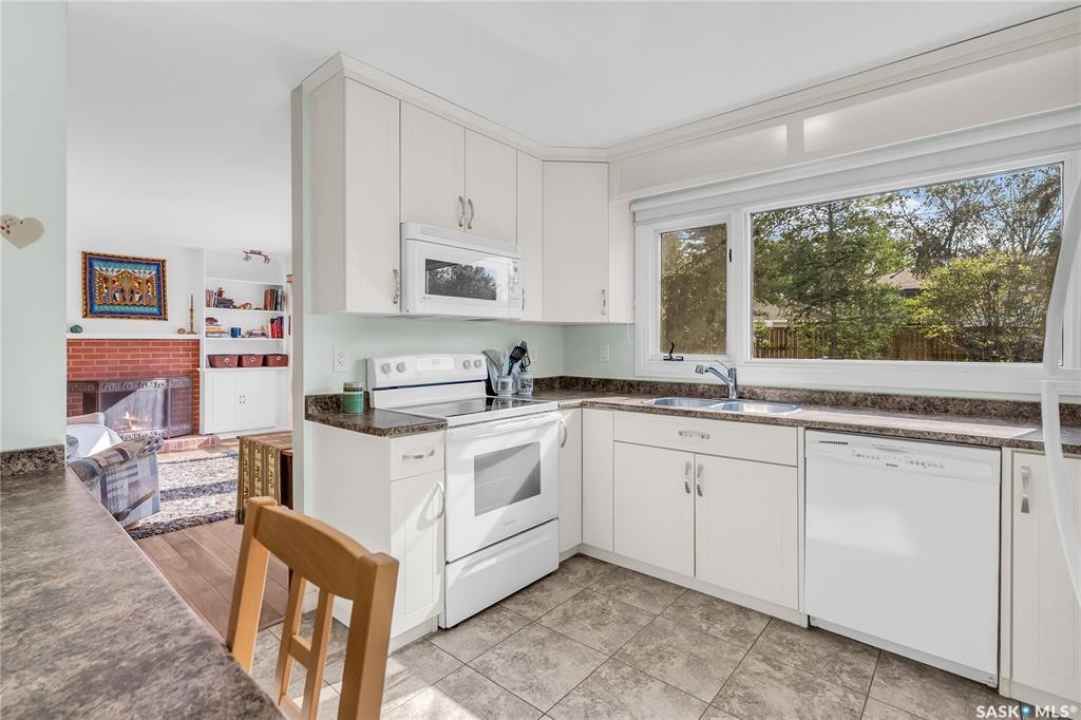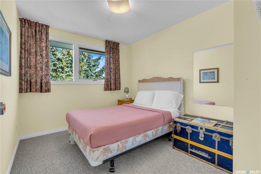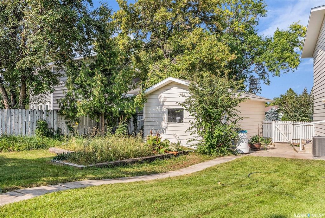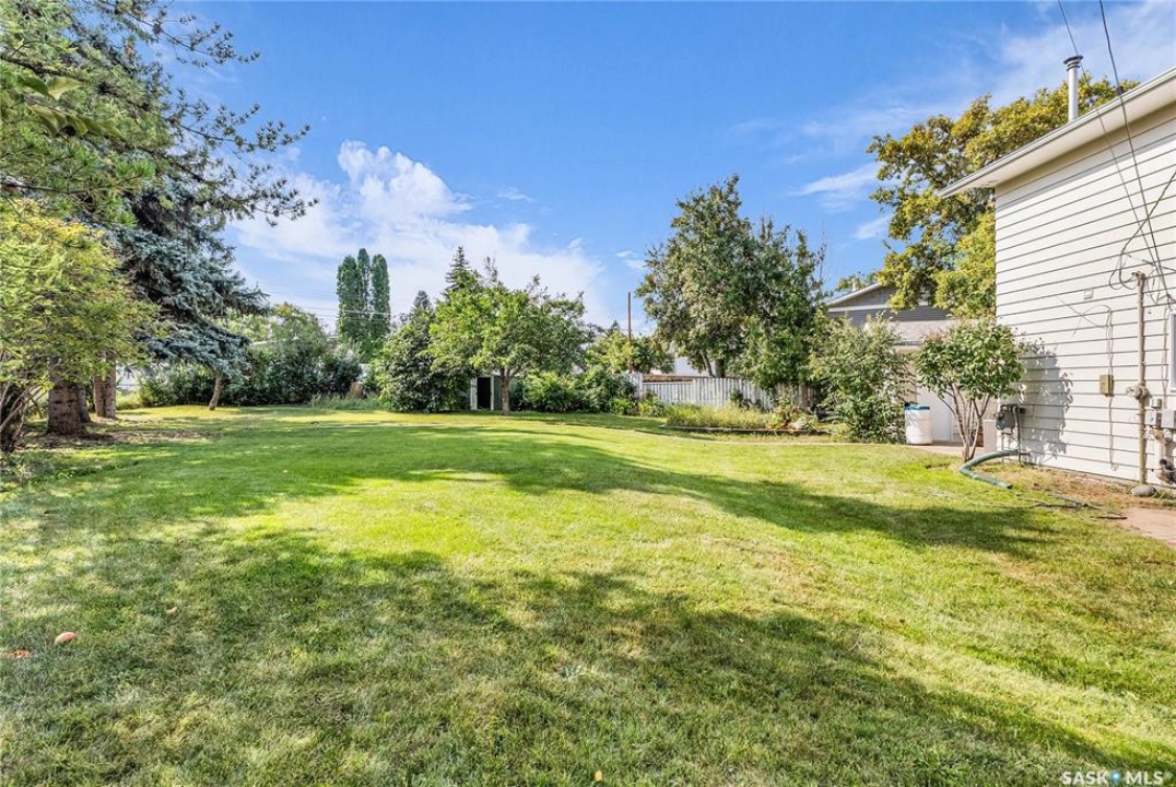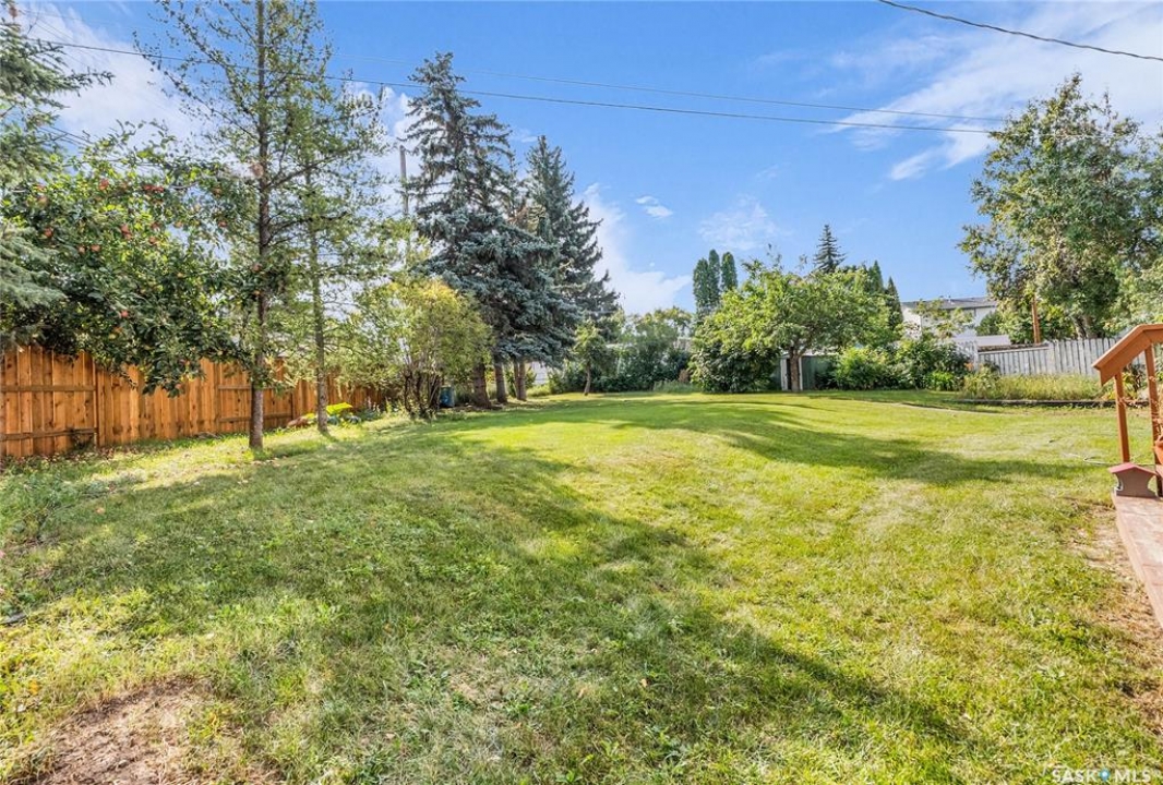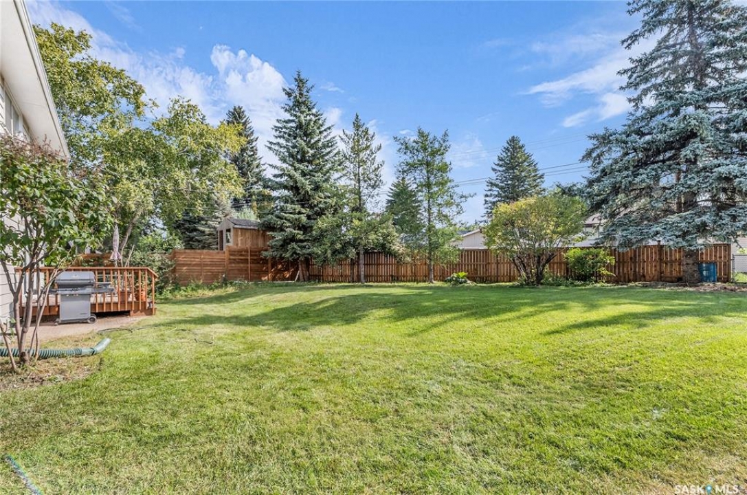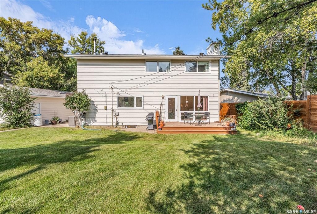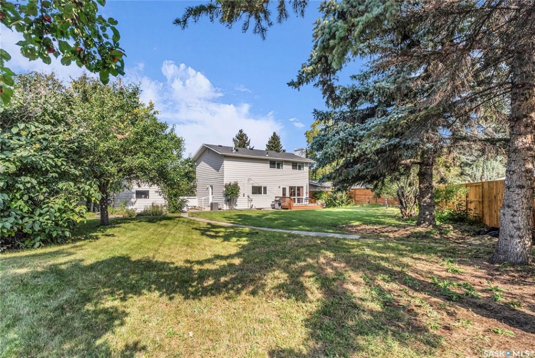 Welcome to 54 Britnell Crescent, a rare opportunity to own a timeless two-storey home on one of West College Park's most prestigious and quiet crescents. Set on a massive pie-shaped lot—just shy of 12,000 sq. ft.—this property is a private park all your own. Whether you're picnicking under the trees, dancing beneath the northern lights, watching rabbits hop through the yard, or picking apples from your very own tree, this backyard is pure magic. The home offers 1,816 square feet of well-planned living space, freshly dressed with new exterior paint and complemented by a detached garage and concrete driveway. Inside, you'll find four generous bedrooms upstairs (easily converted back to five if desired), including a primary suite with a sizeable closet and private ensuite. The main floor was designed for both comfort and connection: a formal dining room big enough to host your entire extended family, a rear family room with built-ins to showcase your travel treasures and serene views of the yard, and a fully renovated kitchen featuring ceiling-height cabinetry, a built-in desk, and a massive picture window overlooking the greenery. A beautifully updated 3-piece bathroom with tiled walk-in shower and wood feature ceiling rounds out the main level. Downstairs, the fully developed basement is a dream for entertaining and play—whether that means games night, movie marathons, or crafting. The oversized laundry room with utility sink adds practicality to the charm. This home has been cherished by the same family for over 40 years, and now it's ready for its next chapter. With Evan Hardy Collegiate just steps away, nearby parks and schools, easy access to 8th Street amenities, and a quick commute to the University of Saskatchewan and downtown, the location offers both convenience and community. If you're looking for a place with space to grow, laugh, host, and make memories, 54 Britnell Crescent is ready to welcome you home.
